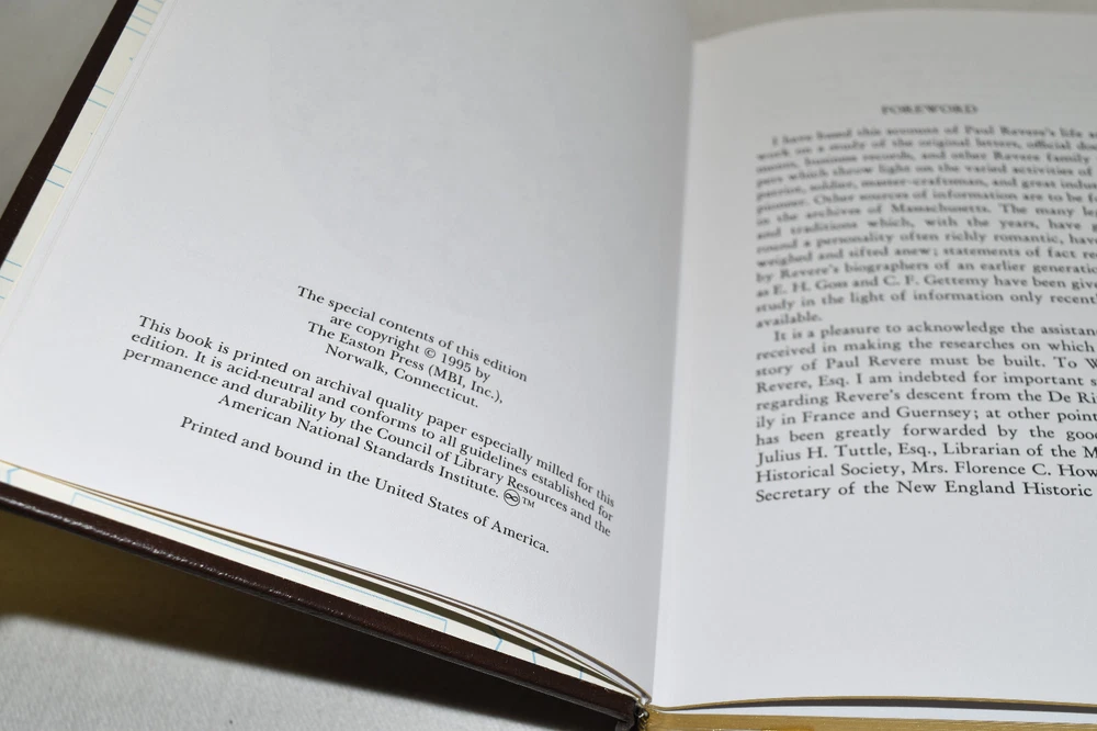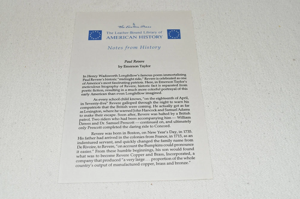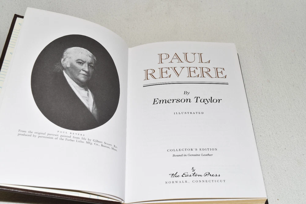 From the Easton Press Library of American History... Paul Revere by Emerson Taylor Collector's Edition Copyright 1995 by The Easton Press Bound in Premium Full Leather This volume contains all of the classic Easton Press trimmings: Premium Leather Decorated Endleaves Distinctive Cover Design Hubbed Spine, Accented in Real 22KT Gold Satin Ribbon Page Marker Gilded Page Edges Long-lasting, High Quality Acid-neutral Paper Smyth-sewn Pages for Strength and Durability Beautiful Illustrations A very scarce title in any condition, this Easton Press Edition is in Fine condition. The front and back covers are both in terrific condition and the gilded page edges show only minor wear (see pictures of all sides of gilt). There is faint residue on the second page. This book is part of the Library of American History Collection published by Easton Press. It comes complete with Collector's Notes and would be a beautiful addition to your Easton Press collection. Please Email Me With Any Questions You Might Have! Shipping Info: Buyer to Pay Shipping and Handling International Bidders Pay Extra Shipping Seller Not Responsible For Uninsured Items Lost or Damaged in Mail Forms of Payment Accepted: Paypal Good luck and happy bidding! Powered by eBay Turbo Lister The free listing tool. List your items fast and easy and manage your active items.