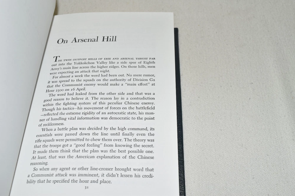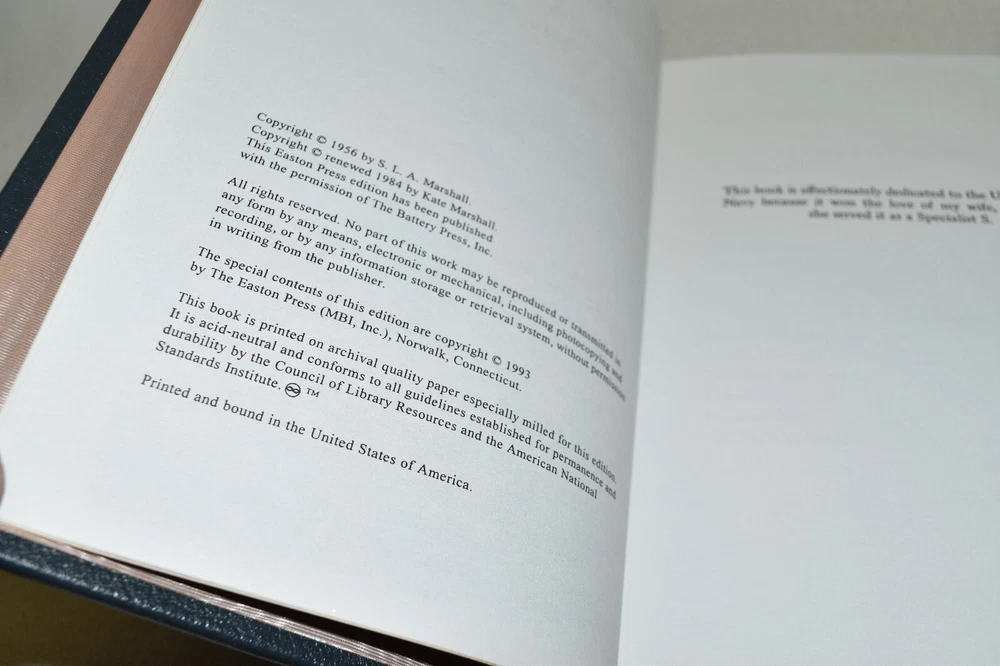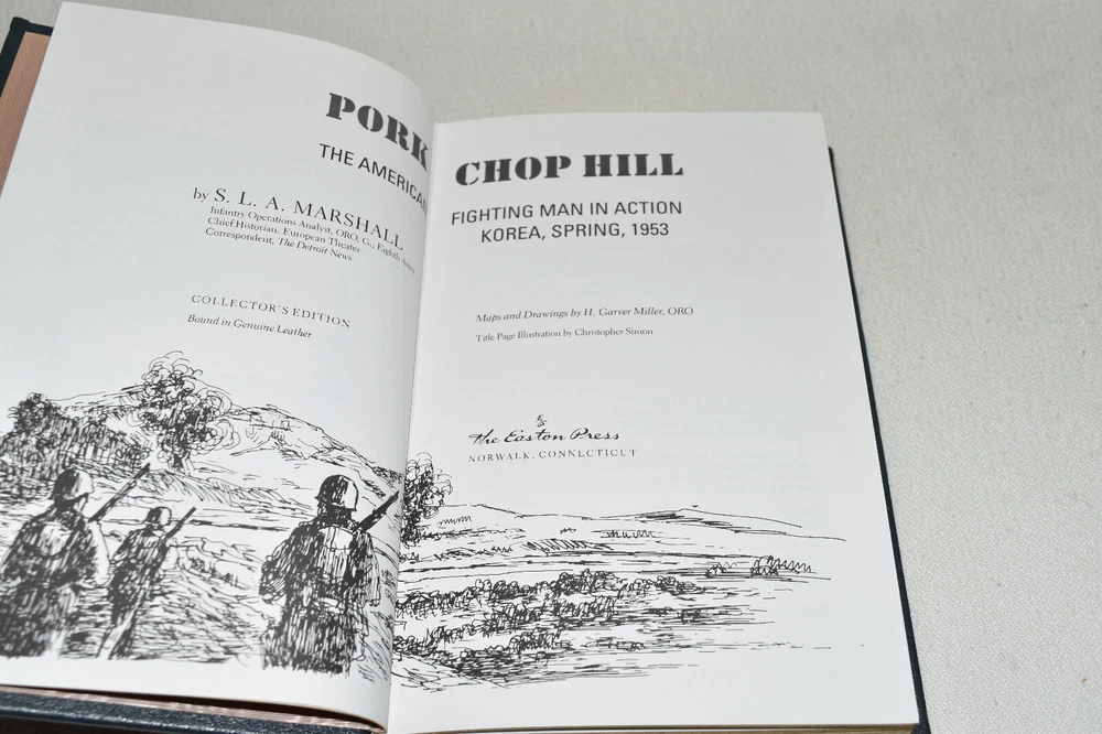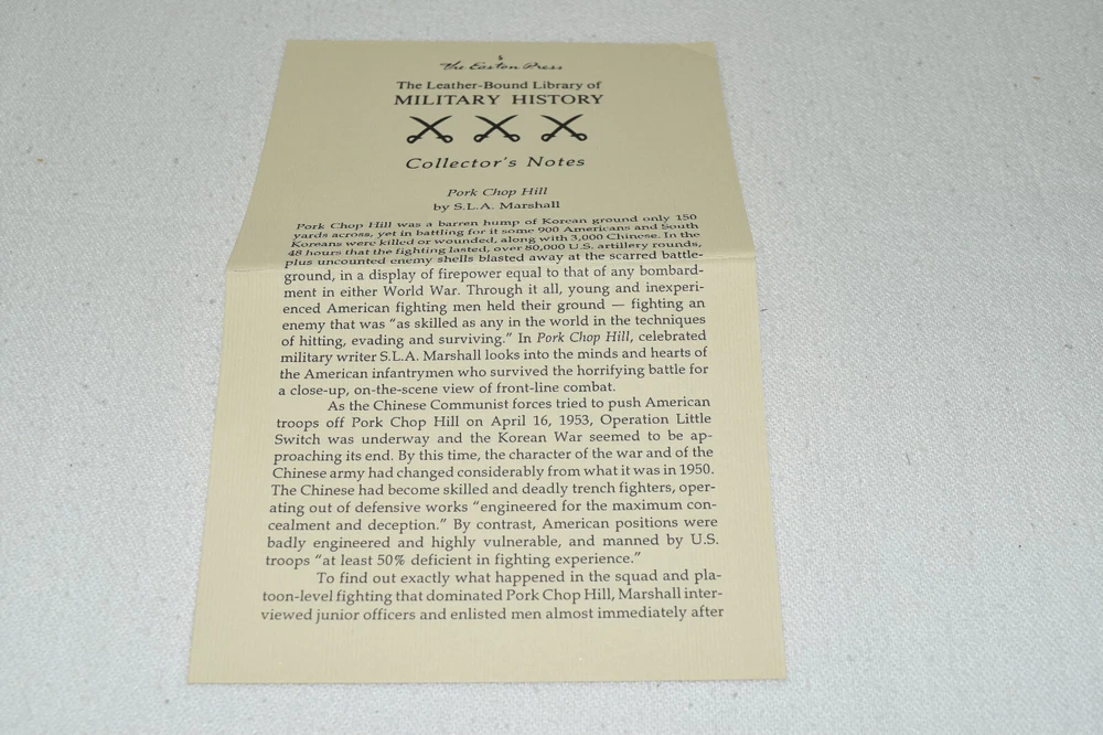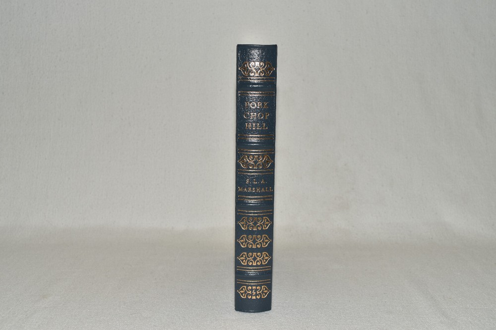 From the Easton Press Library of Military History Collection... Pork Chop Hill The American Fighting Man in Action Korea, Spring 1953 by S. L. A. Marshall Profusely Illustrated with Photos and Charts Copyright 1993 by The Easton Press Bound in Premium Full Leather This volume contains all of the classic Easton Press trimmings: Premium Leather Silk Moire Endleaves Distinctive Cover Design Hubbed Spine, Accented in Real 22KT Gold Satin Ribbon Page Marker Gilded Page Edges Long-lasting, High Quality Acid-neutral Paper Smyth-sewn Pages for Strength and Durability Beautiful Illustrations A very scarce title in any condition, this volume is in Fine condition. The front and back covers are both in near perfect condition and the gilded page edges show hardly any wear (see pictures of all edges). There is a blank bookplate affixed to the second page. This book is part of the Library of Military History Collection published by Easton Press. It comes complete with Collector's Notes and would be a beautiful addition to your Easton Press collection. Overall, this copy is a grade collector's book. This book is very elusive in this superior condition, as only a limited number of them were ever published, so now is the time to act. Hopefully you can add this book to your collection and enjoy it in the years to come... Please Email Me With Any Questions You Might Have! Shipping Info: Buyer to Pay Shipping and Handling International Bidders Pay Extra Shipping Seller Not Responsible For Uninsured Items Lost or Damaged in Mail Forms of Payment Accepted: Paypal Good luck and happy bidding! Powered by eBay Turbo Lister The free listing tool. List your items fast and easy and manage your active items.