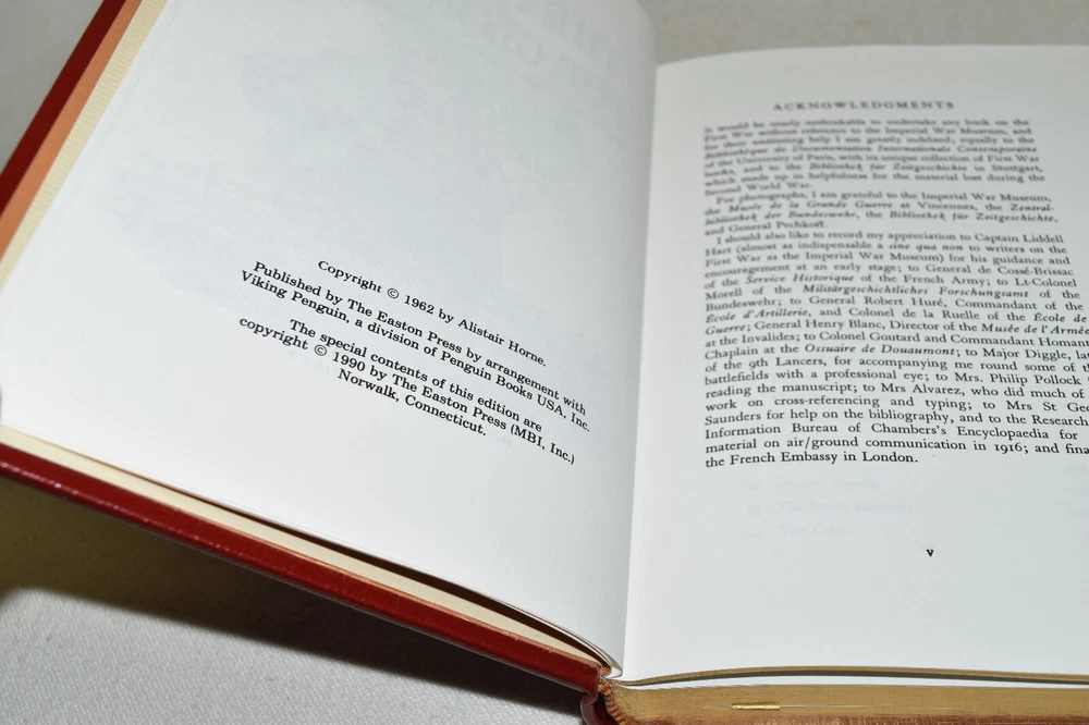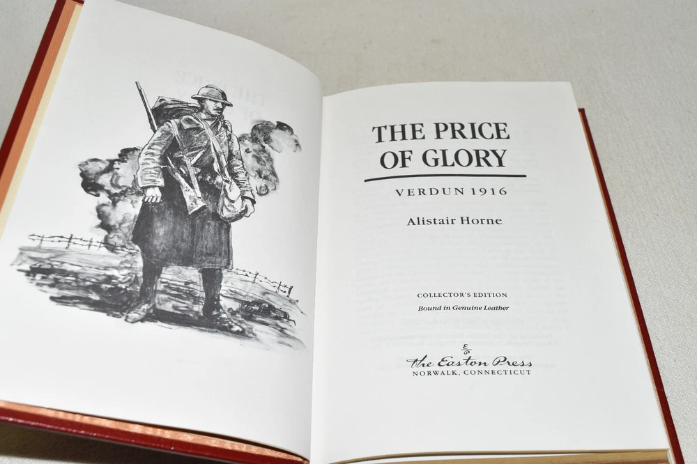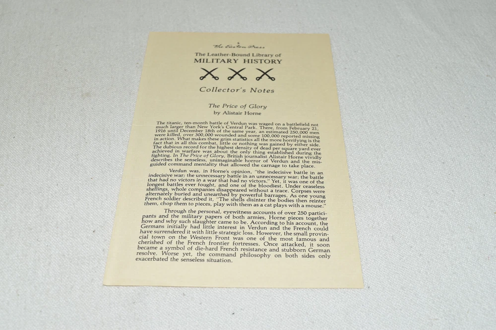 From the Easton Press Library of Military History Collection... The Price of Glory Verdun 1916 by Alistair Horne Profusely Illustrated! Copyright 1990 by The Easton Press Bound in Premium Full Leather This volume contains all of the classic Easton Press trimmings: Premium Leather Silk Moire Endleaves Distinctive Cover Design Hubbed Spine, Accented in Real 22KT Gold Satin Ribbon Page Marker Gilded Page Edges Long-lasting, High Quality Acid-neutral Paper Smyth-sewn Pages for Strength and Durability Beautiful Illustrations A very scarce title in any condition, this volume is in Fine condition. The front and back covers are both in terrific condition and the gilded page edges show minor wear (see pictures of all edges). There is light residue on the second page. This book is part of the Library of Military History Collection published by Easton Press. It comes complete with Collector's Notes and would be a beautiful addition to your Easton Press collection. Please Email Me With Any Questions You Might Have! Shipping Info: Buyer to Pay Shipping and Handling International Bidders Pay Extra Shipping Seller Not Responsible For Uninsured Items Lost or Damaged in Mail Forms of Payment Accepted: Paypal Good luck and happy bidding! Powered by eBay Turbo Lister The free listing tool. List your items fast and easy and manage your active items.