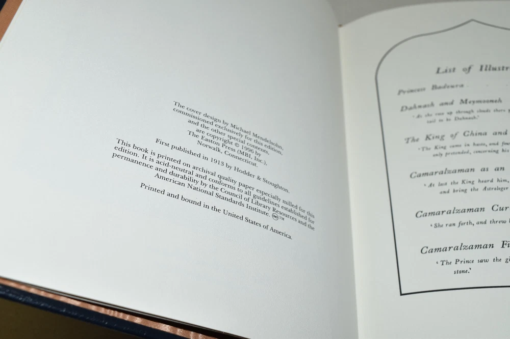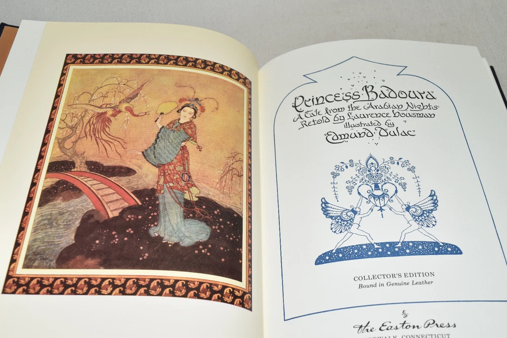 From the Easton Press Collection... Princess Badoura A Tale from the Arabian Nights Retold by Laurence Housman Illustrated by Edmund Dulac Collector's Edition Copyright 1996 by The Easton Press Bound in Premium Full Leather This volume contains all of the classic Easton Press trimmings: Premium Leather Silk Moire Endleaves Distinctive Cover Design Hubbed Spine, Accented in Real 22KT Gold Satin Ribbon Page Marker Gilded Page Edges Long-lasting, High Quality Acid-neutral Paper Smyth-sewn Pages for Strength and Durability Beautiful Illustrations A very scarce title in any condition, this Easton Press Limited Edition is in Near Fine - Fine condition. The front and back covers are both in terrific condition and the gilded page edges show minor wear (see pictures of all gilt sides). There is faint bookplate residue on the second page. This book was published by Easton Press and would be a beautiful addition to your Easton Press collection. Please Email Me With Any Questions You Might Have! Shipping Info: Buyer to Pay Shipping and Handling International Bidders Pay Extra Shipping Seller Not Responsible For Uninsured Items Lost or Damaged in Mail Forms of Payment Accepted: Paypal Good luck and happy bidding! Powered by eBay Turbo Lister The free listing tool. List your items fast and easy and manage your active items.
