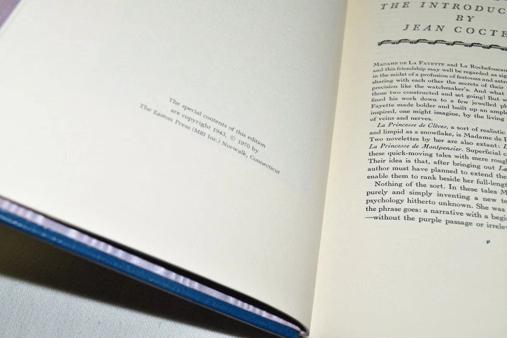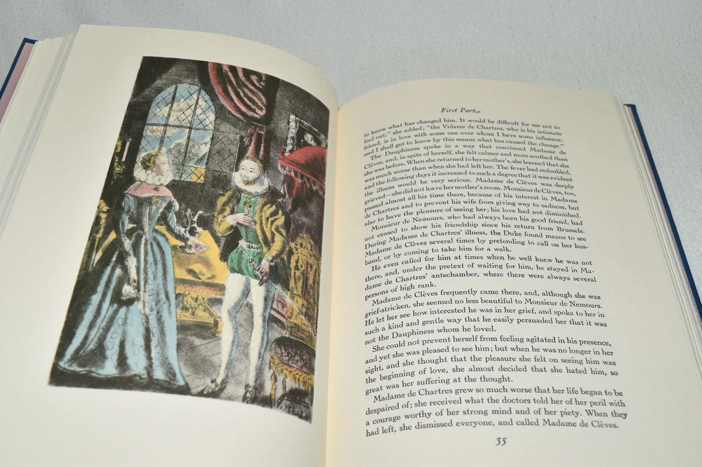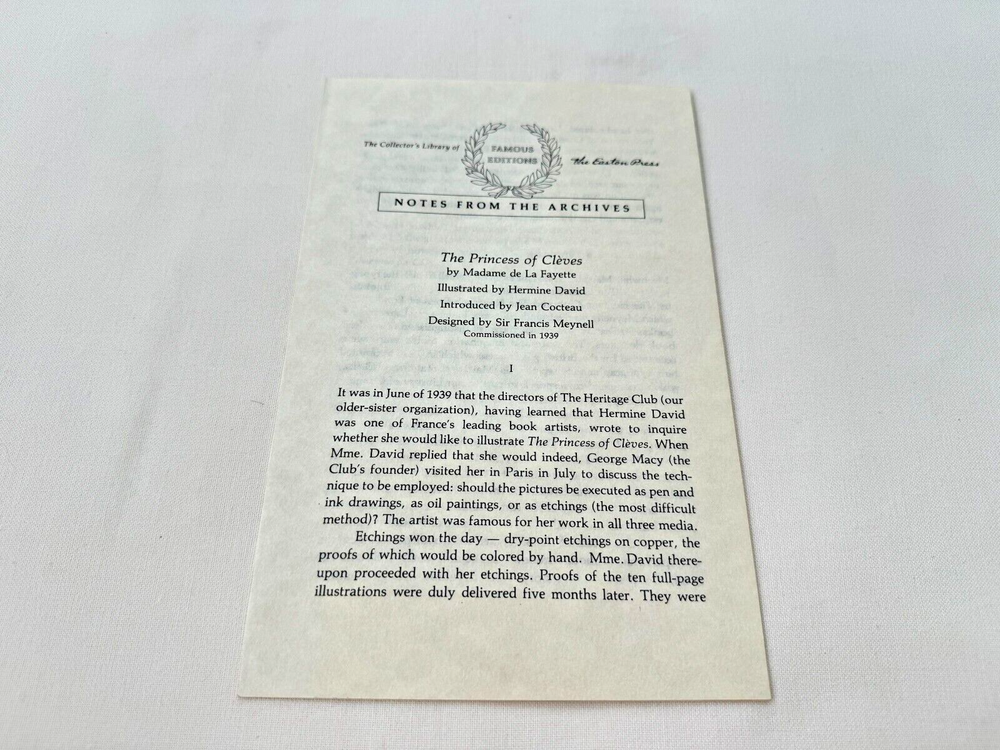 From the Easton Press Library of Famous Editions Collection... The Princess of Cleves by Madame de La Fayette Introduced by Jean Cocteau Illustrated by Hermine David Copyright 1970 by The Easton Press Bound in Premium Full Leather This volume contains all of the classic Easton Press trimmings: Premium Leather Silk Moire Endleaves Distinctive Cover Design Hubbed Spine, Accented in Real 22KT Gold Satin Ribbon Page Marker Gilded Page Edges Long-lasting, High Quality Acid-neutral Paper Smyth-sewn Pages for Strength and Durability Beautiful Illustrations A very scarce title in any condition, this volume is in Fine and Unread condition. The front and back covers are both in Perfect condition and the gilded page edges show no wear at all! There are no markings, bookplates, or other signs of prior ownership in this book . This book is part of the Library of Famous Editions Collection published by Easton Press. It comes complete with Collector's Notes and would be a beautiful addition to your Easton Press collection. Hopefully you can add this book to your collection and enjoy it in the years to come... Overall, this copy is a grade collector's set. This set is very elusive in this superior condition, as only a limited number of them were ever published, so now is the time to act. Hopefully you can add this set to your collection and enjoy it in the years to come... Please Email Me With Any Questions You Might Have! Shipping Info: Buyer to Pay Shipping and Handling International Bidders Pay Extra Shipping Good luck and happy bidding!