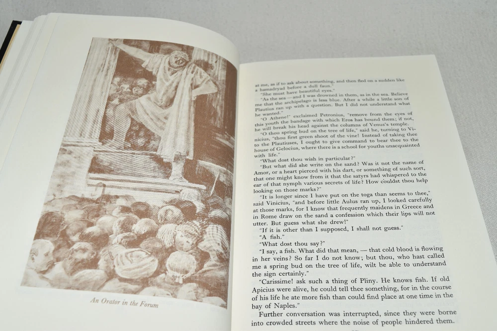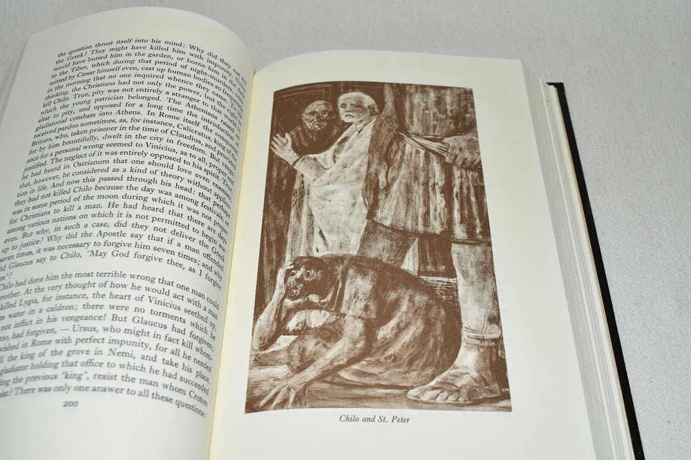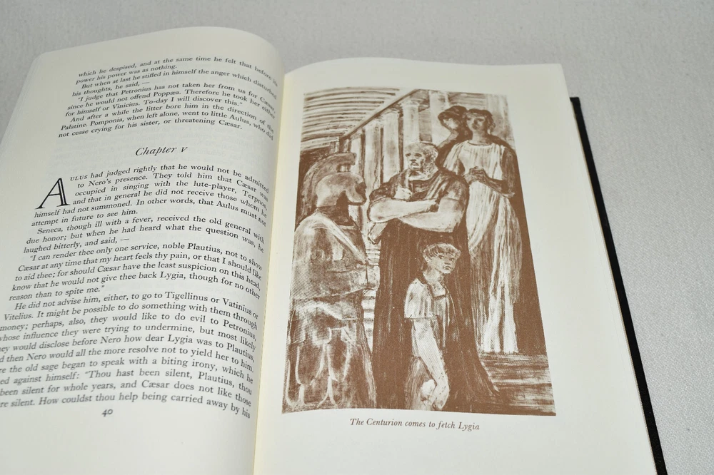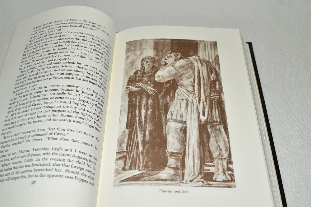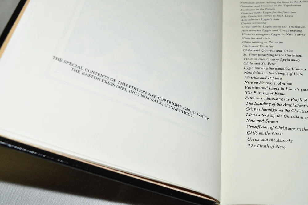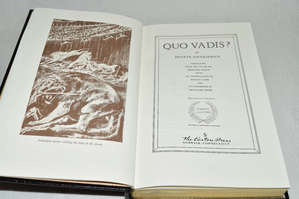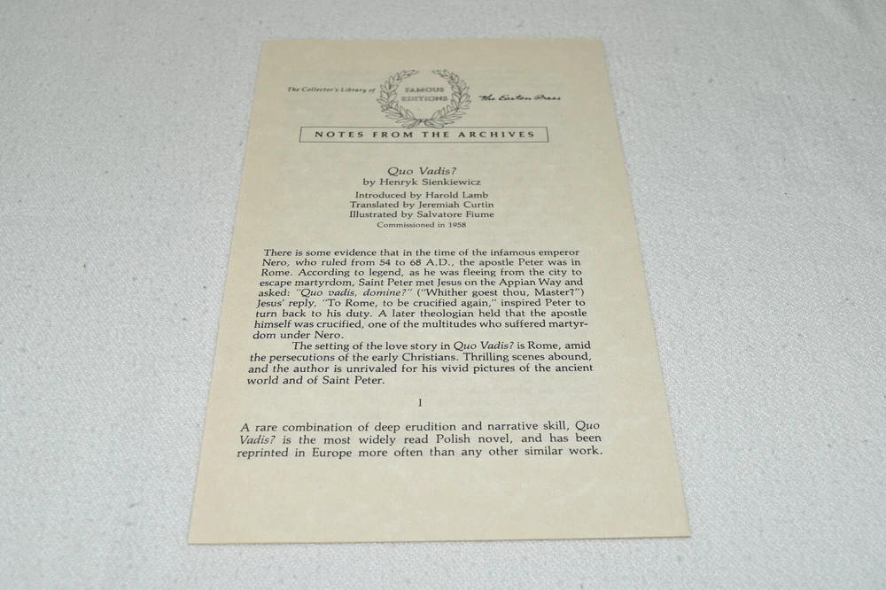 From the Easton Press Library of Famous Editions Collection... Quo Vadis? by Henryk Sienkiewicz Translated by Jeremiah Curtin Introduced by Harold Lamb Illustrated by Salvatore Fiume Copyright 1988 by The Easton Press Bound in Premium Full Leather This volume contains all of the classic Easton Press trimmings: Premium Leather Silk Moire Endleaves Distinctive Cover Design Hubbed Spine, Accented in Real 22KT Gold Satin Ribbon Page Marker Gilded Page Edges Long-lasting, High Quality Acid-neutral Paper Smyth-sewn Pages for Strength and Durability Beautiful Illustrations A very scarce title in any condition, this volume is in Fine condition. The front and back covers are both in near perfect condition showing and the gilded page edges show hardly any wear (see pictures of all edges). There is light residue on the second page. This book is part of the Library of Famous Editions Collection published by Easton Press. It comes complete with Collector's Notes and would be a beautiful addition to your Easton Press collection. Hopefully you can add this book to your collection and enjoy it in the years to come... Please Email Me With Any Questions You Might Have! Shipping Info: Buyer to Pay Shipping and Handling International Bidders Pay Extra Shipping Seller Not Responsible For Uninsured Items Lost or Damaged in Mail Forms of Payment Accepted: Paypal Good luck and happy bidding! Powered by eBay Turbo Lister The free listing tool. List your items fast and easy and manage your active items.