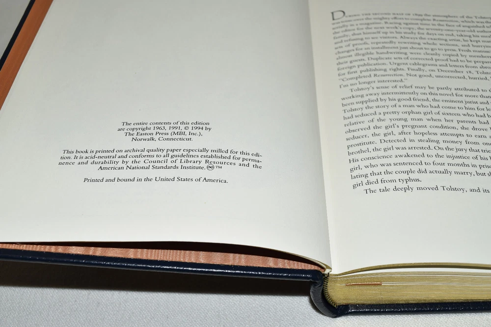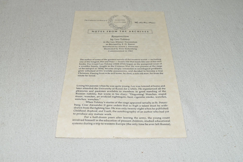 From the Easton Press Library of Famous Editions Collection... Resurrection by Leo Tolstoy Introduced by Ernest Simmons Illustrated by Fritz Eichenberg Copyright 1994 by The Easton Press Bound in Premium Full Leather This volume contains all of the classic Easton Press trimmings: Premium Leather Silk Moire Endleaves Distinctive Cover Design Hubbed Spine, Accented in Real 22KT Gold Satin Ribbon Page Marker Gilded Page Edges Long-lasting, High Quality Acid-neutral Paper Smyth-sewn Pages for Strength and Durability Beautiful Illustrations A very scarce title in any condition, this volume is in Fine condition. The front and back covers are both in terrific condition and the gilded page edges show hardly any wear (see pictures of all edges). There is faint bookplate residue on the second page. This book is part of the Library of Famous Editions Collection published by Easton Press. It comes complete with Collector's Notes and would be a beautiful addition to your Easton Press collection. Overall, this copy is a grade collector's book. This book is very elusive in this superior condition, as only a limited number of them were ever published, so now is the time to act. Hopefully you can add this book to your collection and enjoy it in the years to come... Please Email Me With Any Questions You Might Have! Shipping Info: Buyer to Pay Shipping and Handling International Bidders Pay Extra Shipping Seller Not Responsible For Uninsured Items Lost or Damaged in Mail Forms of Payment Accepted: Paypal Good luck and happy bidding! Powered by eBay Turbo Lister The free listing tool. List your items fast and easy and manage your active items.