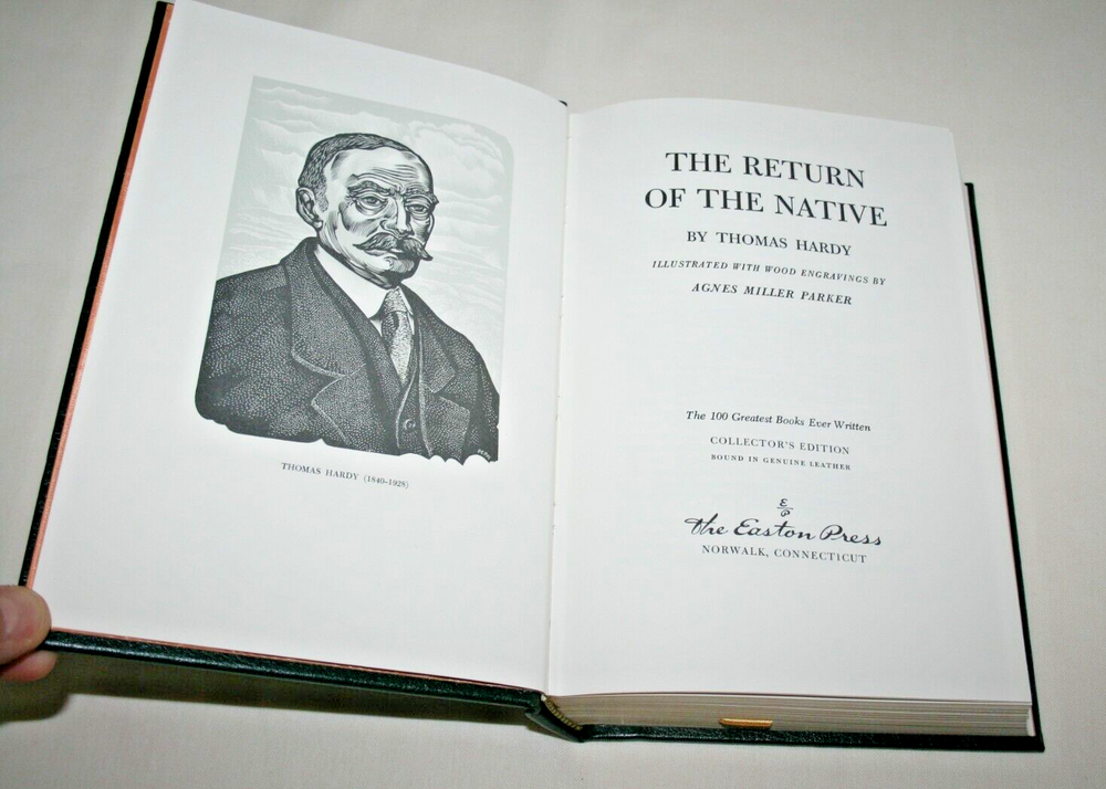 From the Easton Press 100 Greatest Books Ever Written Collection... The Return of the Native by Thomas Hardy Illustrated with Wood Engravings by Agnes Miller Parker Collector's Edition Copyright 1978 by The Easton Press Bound in Premium Full Leather This volume contains all of the classic Easton Press trimmings: Premium Leather Silk Moire Endleaves Distinctive Cover Design Hubbed Spine, Accented in Real 22KT Gold Satin Ribbon Page Marker Gilded Page Edges Long-lasting, High Quality Acid-neutral Paper Smyth-sewn Pages for Strength and Durability Beautiful Illustrations A very scarce title in any condition, this 1977 Easton Press First Edition is in Absolute Mint and Unread condition! The front and back covers are both in near Perfect condition with minor wear on the back cover and the gilded page edges show no wear at all! There is no attached bookplate nor any other signs of previous ownership. This book is part of the 100 Greatest Books Ever Written Collection published by Easton Press and would be a beautiful addition to your Easton Press collection. Overall, this copy is a grade collector's book. This book is very elusive in this superior condition, as only a limited number of them were ever published, so now is the time to act. Hopefully you can add this book to your collection and enjoy it in the years to come... Please Email Me With Any Questions You Might Have! Shipping Info: Buyer to Pay Shipping and Handling International Bidders Pay Extra Shipping Seller Not Responsible For Uninsured Items Lost or Damaged in Mail Good luck and happy bidding!