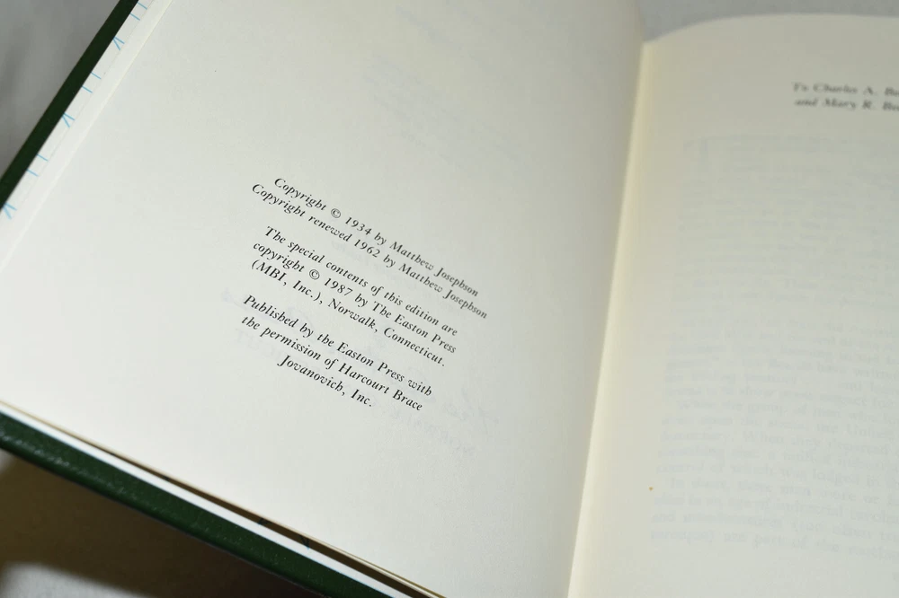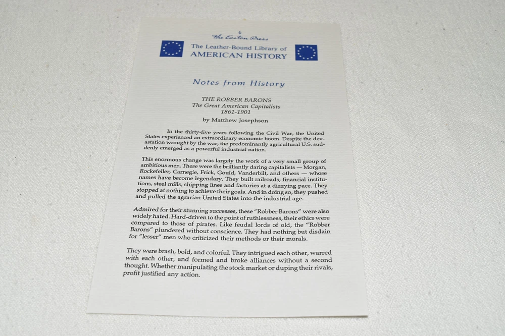 From the Easton Press Library of American History... The Robber Barons Great American Capitalists 1861 - 1901 by Matthew Josephson Collector's Edition Copyright 1987 by The Easton Press Bound in Premium Full Leather This volume contains all of the classic Easton Press trimmings: Premium Leather Decorated Endleaves Distinctive Cover Design Hubbed Spine, Accented in Real 22KT Gold Satin Ribbon Page Marker Gilded Page Edges Long-lasting, High Quality Acid-neutral Paper Smyth-sewn Pages for Strength and Durability Beautiful Illustrations A very scarce title in any condition, this Easton Press Edition is in Fine condition. The front and back covers are both in terrific condition and the gilded page edges show only minor wear (see pictures of all sides of gilt). There is faint residue on the second page. This book is part of the Library of American History Collection published by Easton Press. It comes complete with Collector's Notes and would be a beautiful addition to your Easton Press collection. Please Email Me With Any Questions You Might Have! Shipping Info: Buyer to Pay Shipping and Handling International Bidders Pay Extra Shipping Seller Not Responsible For Uninsured Items Lost or Damaged in Mail Forms of Payment Accepted: Paypal Good luck and happy bidding! Powered by eBay Turbo Lister The free listing tool. List your items fast and easy and manage your active items.