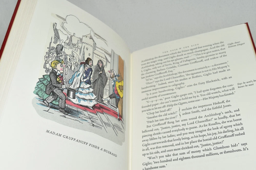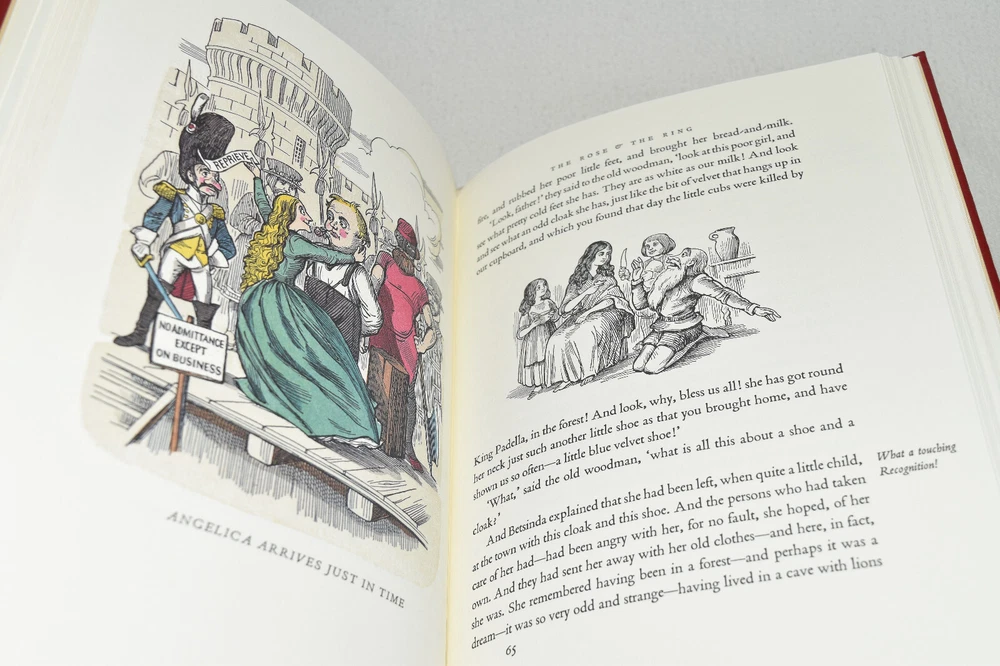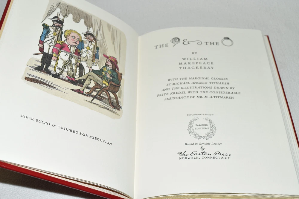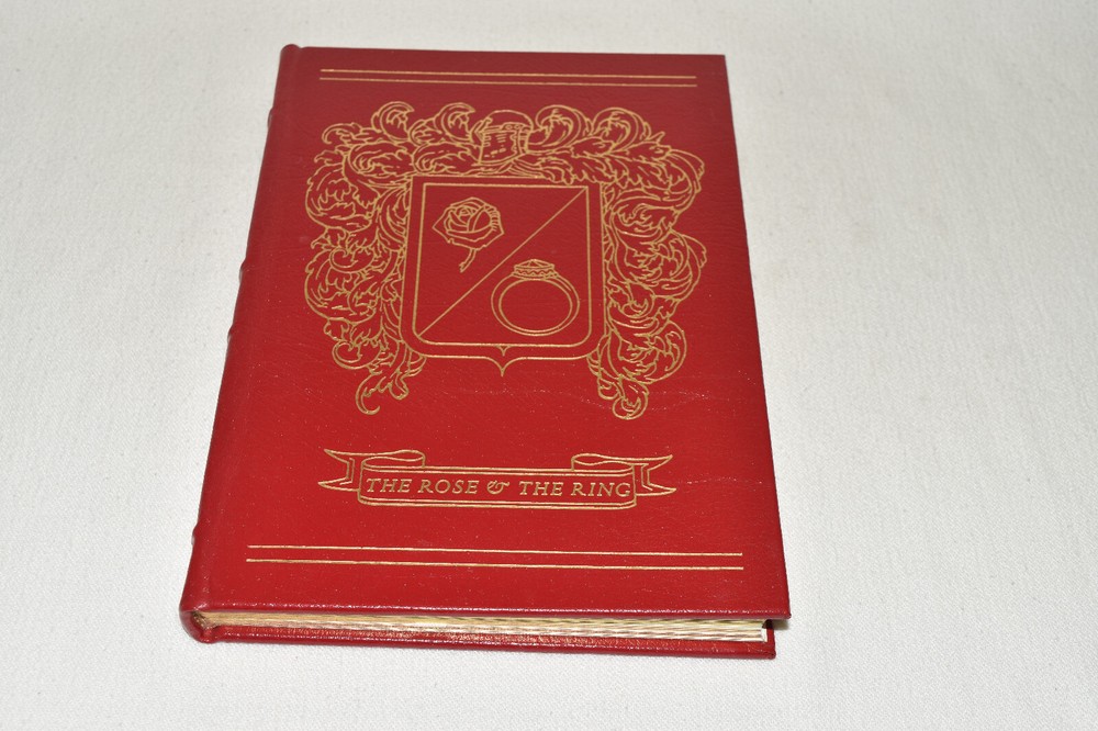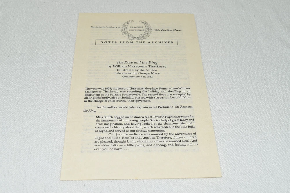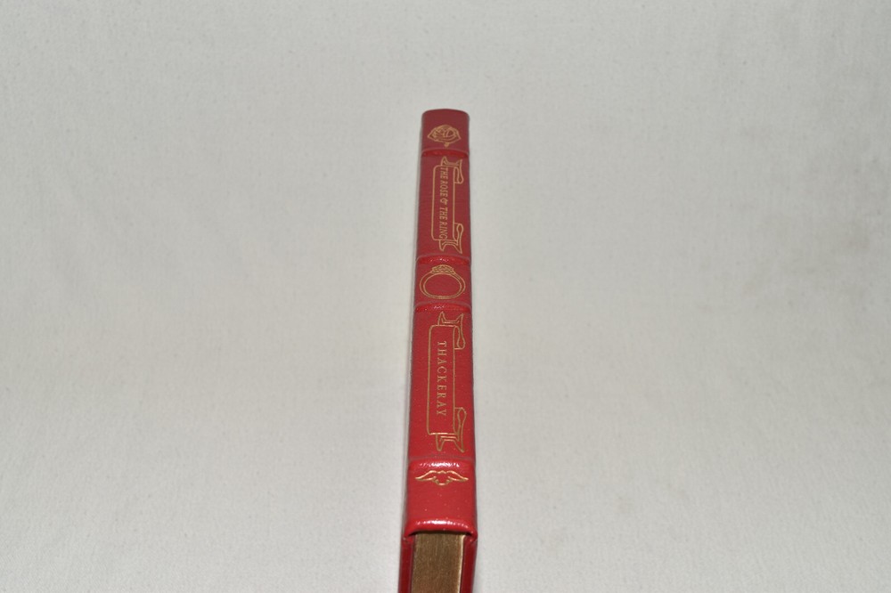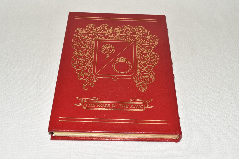From the Easton Press Library of Famous Editions Collection... The Rose and the Ring by William Makepeace Thackeray Illustrated by Fritz Kredel Copyright 1991 by The Easton Press Bound in Premium Full Leather This volume contains all of the classic Easton Press trimmings: Premium Leather Silk Moire Endleaves Distinctive Cover Design Hubbed Spine, Accented in Real 22KT Gold Satin Ribbon Page Marker Gilded Page Edges Long-lasting, High Quality Acid-neutral Paper Smyth-sewn Pages for Strength and Durability Beautiful Illustrations A very scarce title in any condition, this copy is in Fine condition. The front and back covers are both in near perfect condition and the gilded page edges show hardly any wear (see pictures of all sides). There are no markings, bookplates, or other signs of prior ownership. This book is part of the Library of Famous Editions Collection published by Easton Press. It would be a beautiful addition to your Easton Press collection. Overall, this copy is a grade collector's book. This book is very elusive in this superior condition, as only a limited number of them were ever published, so now is the time to act. Hopefully you can add this book to your collection and enjoy it in the years to come... Please Email Me With Any Questions You Might Have! Shipping Info: Buyer to Pay Shipping and Handling International Bidders Pay Extra Shipping Good luck and happy bidding!