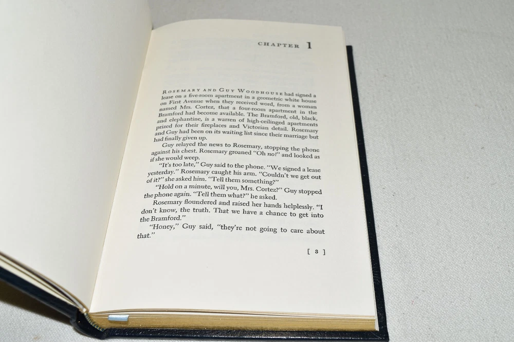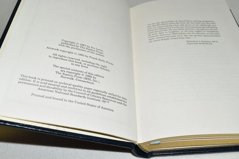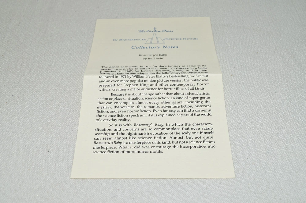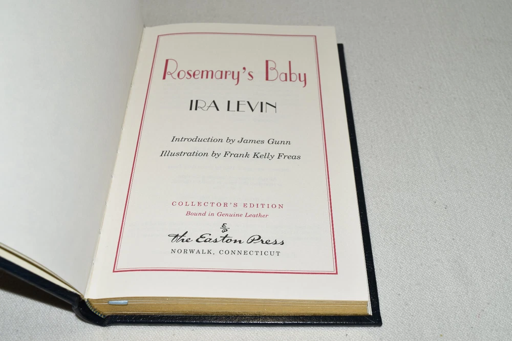 From the Easton Press Masterpieces of Science Fiction Collection... Rosemary's Baby by Ira Levin Illustrated by Frank Kelly Freas Introduction by James Gunn Collector's Edition Copyright 1995 by The Easton Press Bound in Premium Full Leather This volume contains all of the classic Easton Press trimmings: Premium Leather Silk Moire Endleaves Distinctive Cover Design Hubbed Spine, Accented in Real 22KT Gold Satin Ribbon Page Marker Gilded Page Edges Long-lasting, High Quality Acid-neutral Paper Smyth-sewn Pages for Strength and Durability Beautiful Illustrations A very scarce title in any condition, this Easton Press Edition is in Fine condition. The front and back covers are both in terrific condition and the gilded page edges show minor wear (see pictures of all sides of gilt). There is light residue on the second page. This book is part of the Masterpieces of Science Fiction Collection published by Easton Press and would be a beautiful addition to your Easton Press collection. Please Email Me With Any Questions You Might Have! Shipping Info: Buyer to Pay Shipping and Handling International Bidders Pay Extra Shipping Seller Not Responsible For Uninsured Items Lost or Damaged in Mail Forms of Payment Accepted: Paypal Good luck and happy bidding! Powered by eBay Turbo Lister The free listing tool. List your items fast and easy and manage your active items.