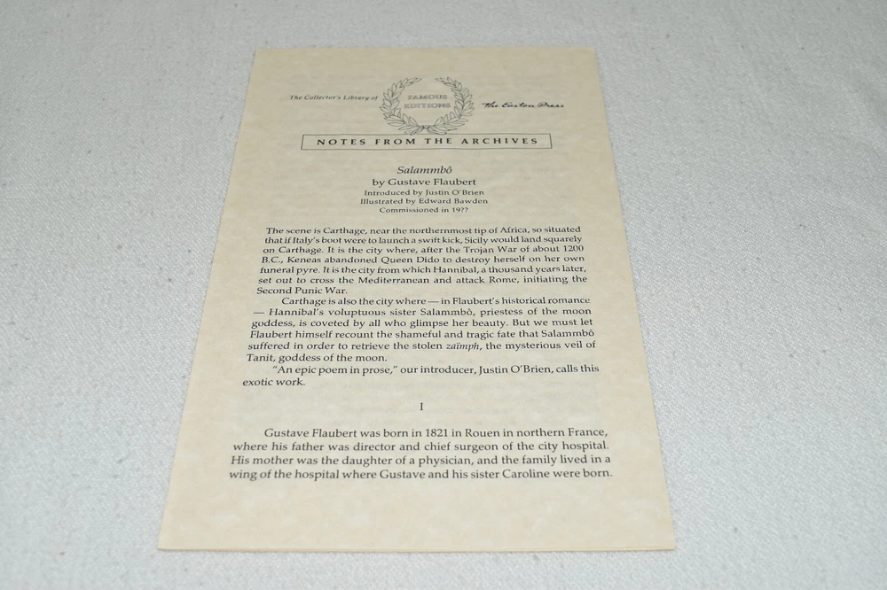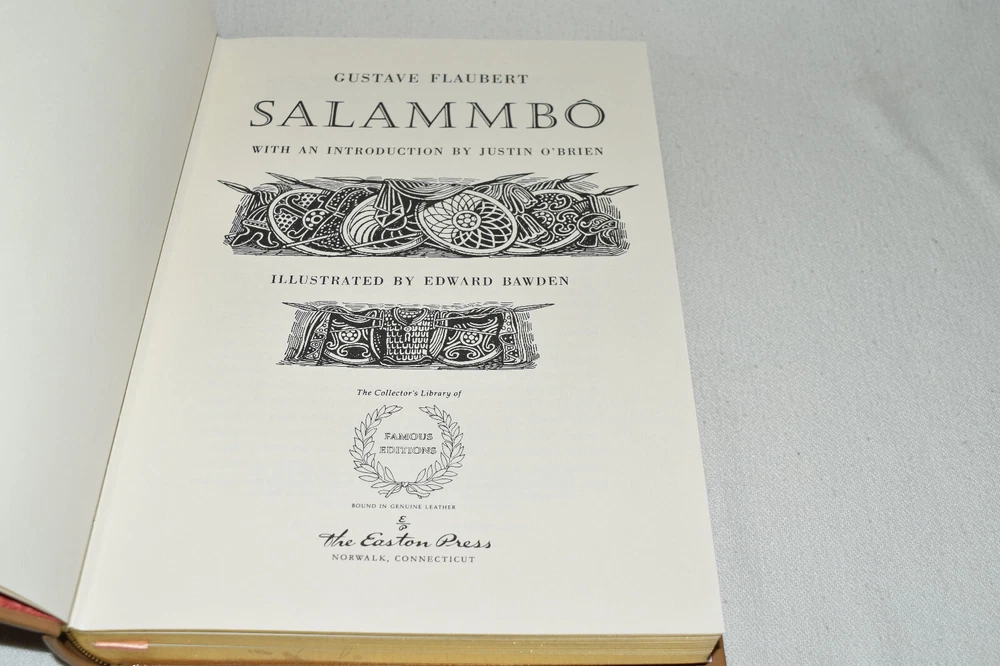 From the Easton Press Library of Famous Editions Collection... Salammbo by Gustave Flaubert Introduced by Justin O'Brien Illustrated by Edward Bawden Copyright 1995 by The Easton Press Bound in Premium Full Leather This volume contains all of the classic Easton Press trimmings: Premium Leather Silk Moire Endleaves Distinctive Cover Design Hubbed Spine, Accented in Real 22KT Gold Satin Ribbon Page Marker Gilded Page Edges Long-lasting, High Quality Acid-neutral Paper Smyth-sewn Pages for Strength and Durability Beautiful Illustrations A very scarce title in any condition, this copy is in Fine condition. The front and back covers are both in near perfect condition and the gilded page edges show only minor wear (see pictures of all sides). There is light residue on the second page. This book is part of the Library of Famous Editions Collection published by Easton Press. It comes complete with Collector's Notes and would be a beautiful addition to your Easton Press collection. Overall, this copy is a grade collector's book. This book is very elusive in this superior condition, as only a limited number of them were ever published, so now is the time to act. Hopefully you can add this book to your collection and enjoy it in the years to come... Please Email Me With Any Questions You Might Have! Shipping Info: Buyer to Pay Shipping and Handling International Bidders Pay Extra Shipping Good luck and happy bidding!