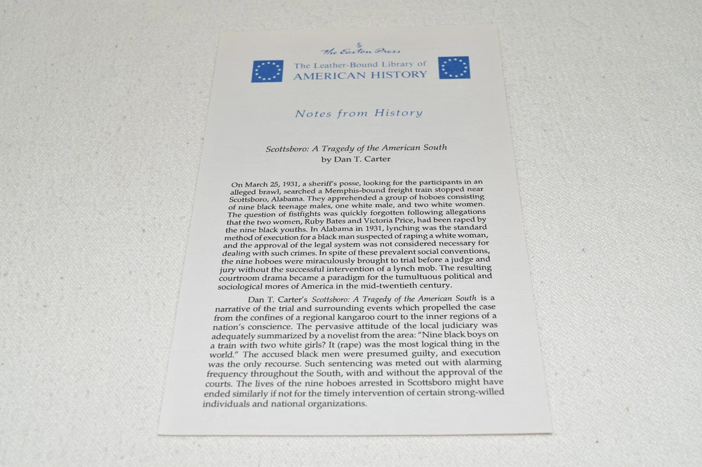 From the Easton Press Library of American History... Scottsboro A Tragedy of the American South by Dan Carter Collector's Edition Copyright 1995 by The Easton Press Bound in Premium Full Leather This volume contains all of the classic Easton Press trimmings: Premium Leather Decorated Endleaves Distinctive Cover Design Hubbed Spine, Accented in Real 22KT Gold Satin Ribbon Page Marker Gilded Page Edges Long-lasting, High Quality Acid-neutral Paper Smyth-sewn Pages for Strength and Durability Beautiful Illustrations A very scarce title in any condition, this Easton Press Edition is in Fine condition. The front and back covers are both in terrific condition and the gilded page edges show minor wear (see pictures of all sides of gilt). There is faint residue on the second page. This book is part of the Library of American History Collection published by Easton Press. It comes complete with Collector's Notes and would be a beautiful addition to your Easton Press collection. Please Email Me With Any Questions You Might Have! Shipping Info: Buyer to Pay Shipping and Handling International Bidders Pay Extra Shipping Seller Not Responsible For Uninsured Items Lost or Damaged in Mail Forms of Payment Accepted: Paypal Good luck and happy bidding! Powered by eBay Turbo Lister The free listing tool. List your items fast and easy and manage your active items.