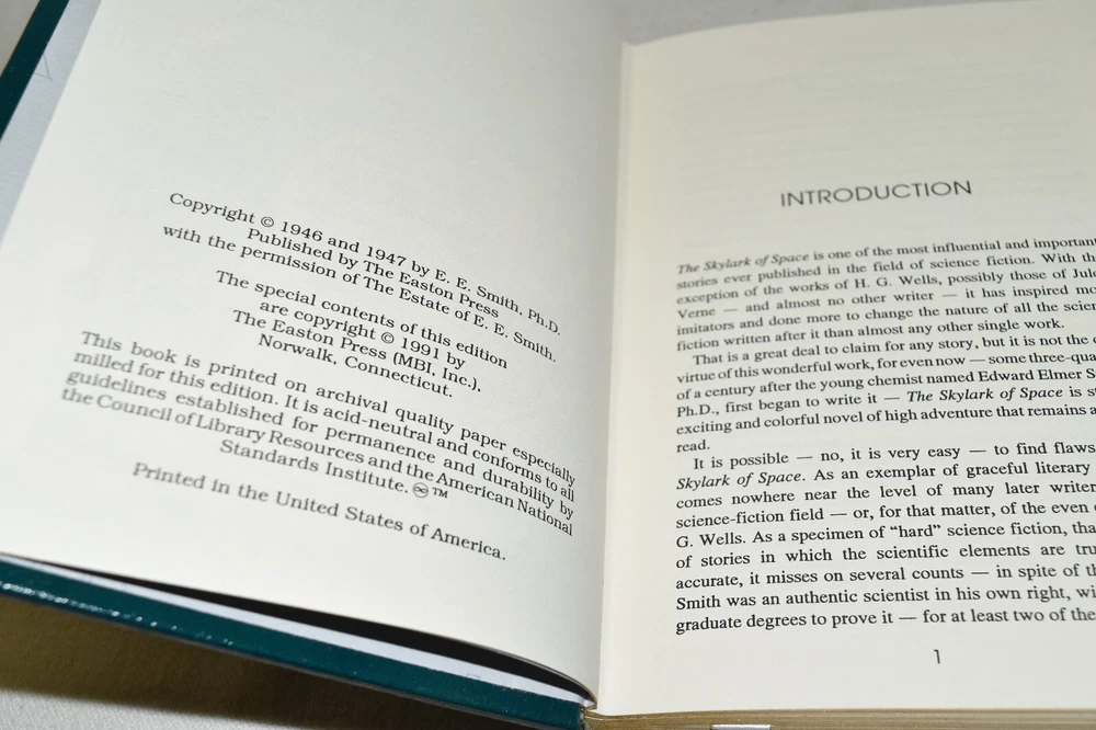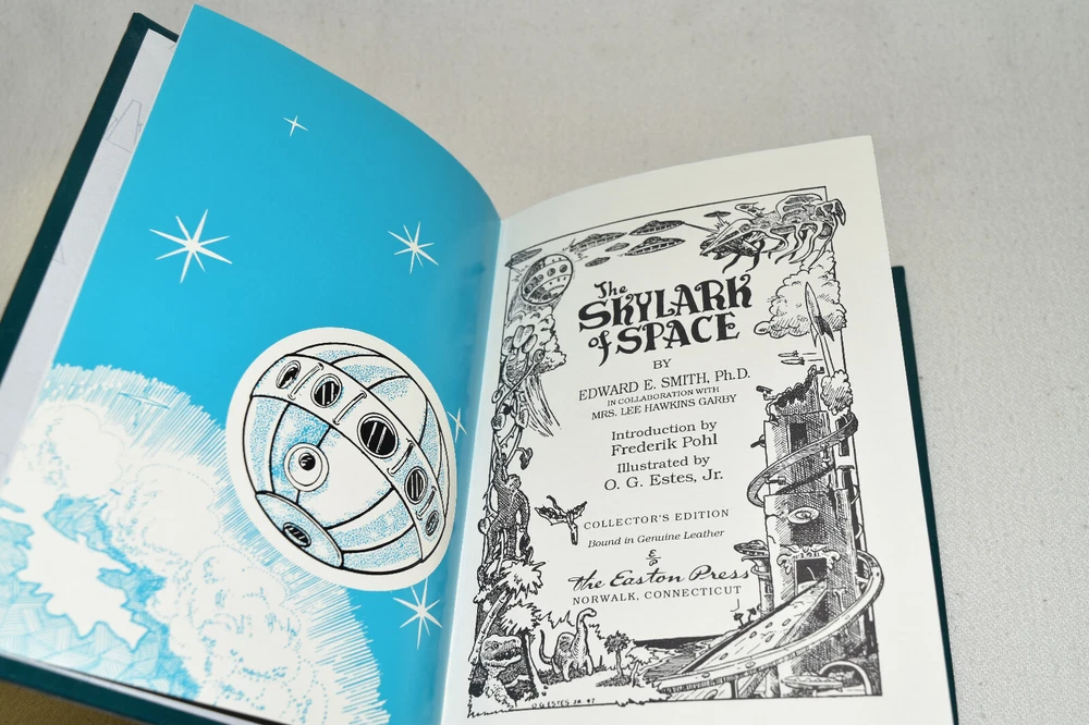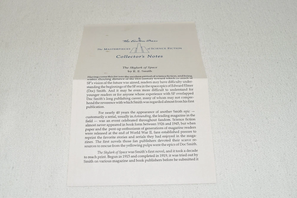 From the Easton Press Masterpieces of Science Fiction Collection... The Skylark of Space by Edward E. Smith Introduction by Frederik Pohl Artwork by O. G. Estes Jr. Copyright 1991 by The Easton Press Bound in Premium Full Leather This volume contains all of the classic Easton Press trimmings: Premium Leather Decorated Endleaves Distinctive Cover Design Hubbed Spine, Accented in Real 22KT Gold Satin Ribbon Page Marker Gilded Page Edges Long-lasting, High Quality Acid-neutral Paper Smyth-sewn Pages for Strength and Durability Beautiful Illustrations A very scarce title in any condition, this volume is in Fine condition. The front and back covers are in terrific condition and the gilded page edges show minor wear (see pictures of all edges). There is light residue on the second page. This book is part of the Masterpieces of Science Fiction Collection published by Easton Press. It comes with Collector's Notes and would be a beautiful addition to your Easton Press collection. Hopefully you can add this book to your collection and enjoy it in the years to come... Please Email Me With Any Questions You Might Have! Shipping Info: Buyer to Pay Shipping and Handling International Bidders Pay Extra Shipping Seller Not Responsible For Uninsured Items Lost or Damaged in Mail Forms of Payment Accepted: Paypal Good luck and happy bidding! Powered by eBay Turbo Lister The free listing tool. List your items fast and easy and manage your active items.