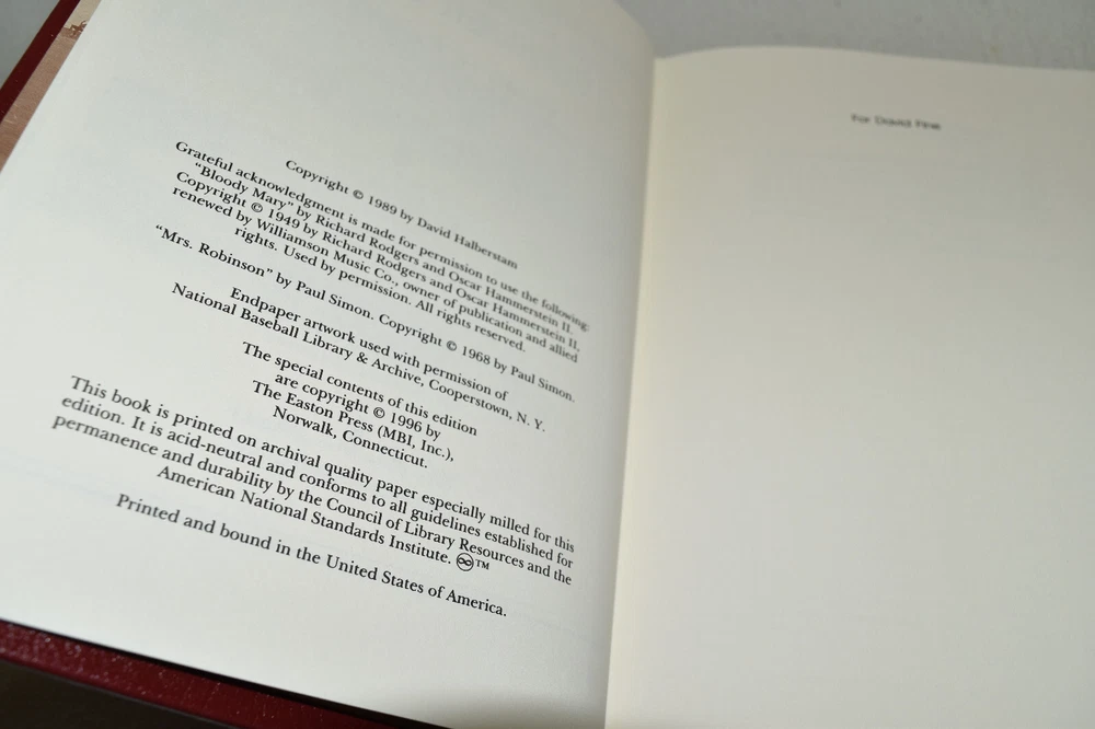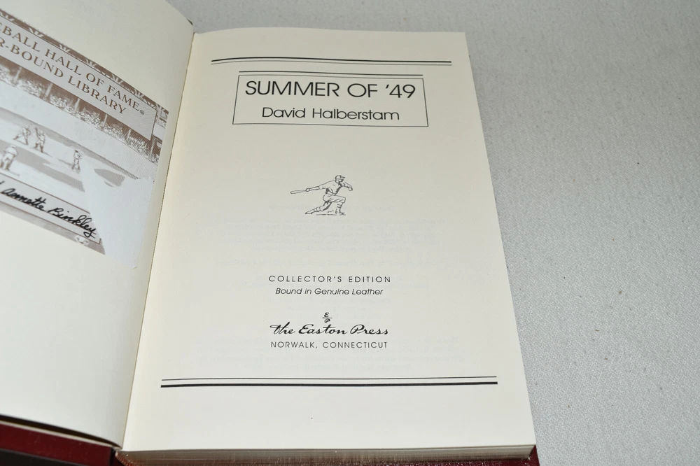 From the Easton Press Collection... Summer of '49 by David Halberstam C ollector's Edition Copyright 1996 by The Easton Press Bound in Premium Full Leather This volume contains all of the classic Easton Press trimmings: Premium Leather Silk Moire Endleaves Distinctive Cover Design Hubbed Spine, Accented in Real 22KT Gold Satin Ribbon Page Marker Gilded Page Edges Long-lasting, High Quality Acid-neutral Paper Smyth-sewn Pages for Strength and Durability Beautiful Illustrations A very scarce title in any condition, this Easton Press First Limited Edition is in Fine condition. The front and back covers are both in terrific condition and the gilded page edges show hardly any wear (see pictures of all gilt sides). There is a bookplate affixed to the second page. This book was published by Easton Press and would be a beautiful addition to your Easton Press collection. Hopefully you can add this book to your collection and enjoy it in the years to come... Please Email Me With Any Questions You Might Have! Shipping Info: Buyer to Pay Shipping and Handling International Bidders Pay Extra Shipping Seller Not Responsible For Uninsured Items Lost or Damaged in Mail Forms of Payment Accepted: Paypal Good luck and happy bidding! Powered by eBay Turbo Lister The free listing tool. List your items fast and easy and manage your active items.