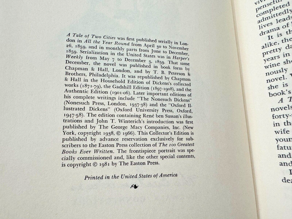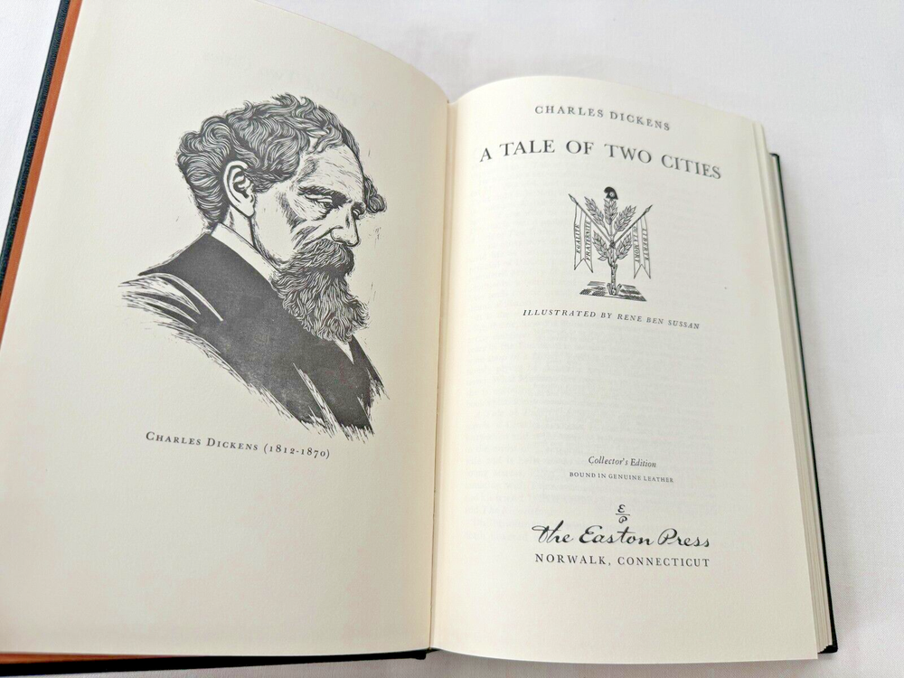 From the Easton Press 100 Greatest Books Ever Written Collection... A Tale of Two Cities by Charles Dickens Collector's Edition Copyright 1981 by The Easton Press Bound in Premium Full Leather This volume contains all of the classic Easton Press trimmings: Premium Leather Silk Moire Endleaves Distinctive Cover Design Hubbed Spine, Accented in Real 22KT Gold Satin Ribbon Page Marker Gilded Page Edges Long-lasting, High Quality Acid-neutral Paper Smyth-sewn Pages for Strength and Durability Beautiful Illustrations A very scarce title in any condition, this 1981 Easton Press First Edition is in Absolute Mint and Unread condition! The front and back covers are both in Perfect condition and the gilded page edges show no wear at all! There are no markings, bookplates, or other signs of prior ownership . This book is part of the 100 Greatest Books Ever Written Collection published by Easton Press and would be a beautiful addition to your Easton Press collection. Overall, this copy is a grade collector's book. This book is very elusive in this superior condition, as only a limited number of them were ever published, so now is the time to act. Hopefully you can add this book to your collection and enjoy it in the years to come... Please Email Me With Any Questions You Might Have! Shipping Info: Buyer to Pay Shipping and Handling International Bidders Pay Extra Shipping Good luck and happy bidding!