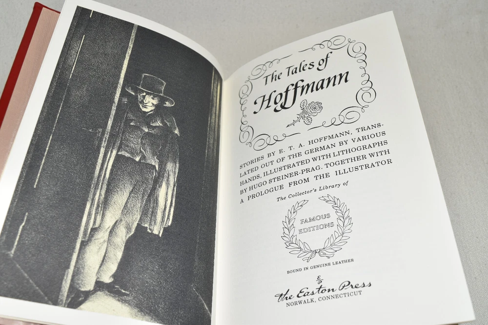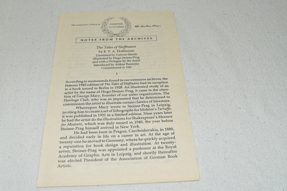From the Easton Press Library of Famous Editions Collection... Tales of Hoffman by E. T. A. Hoffman Illustrated by Hugo Steiner-Prag Copyright 1992 by The Easton Press Bound in Premium Full Leather This volume contains all of the classic Easton Press trimmings: Premium Leather Silk Moire Endleaves Distinctive Cover Design Hubbed Spine, Accented in Real 22KT Gold Satin Ribbon Page Marker Gilded Page Edges Long-lasting, High Quality Acid-neutral Paper Smyth-sewn Pages for Strength and Durability Beautiful Illustrations A very scarce title in any condition, this volume is in Fine condition. The front and back covers are both in terrific condition and the gilded page edges show hardly any wear (see pictures of all edges). There is light residue on the second page. This book is part of the Library of Famous Editions Collection published by Easton Press. It comes complete with Collector's Notes and would be a beautiful addition to your Easton Press collection. Overall, this copy is a grade collector's book. This book is very elusive in this superior condition, as only a limited number of them were ever published, so now is the time to act. Hopefully you can add this book to your collection and enjoy it in the years to come... Please Email Me With Any Questions You Might Have! Shipping Info: Buyer to Pay Shipping and Handling International Bidders Pay Extra Shipping Seller Not Responsible For Uninsured Items Lost or Damaged in Mail Forms of Payment Accepted: Paypal Good luck and happy bidding! Powered by eBay Turbo Lister The free listing tool. List your items fast and easy and manage your active items.