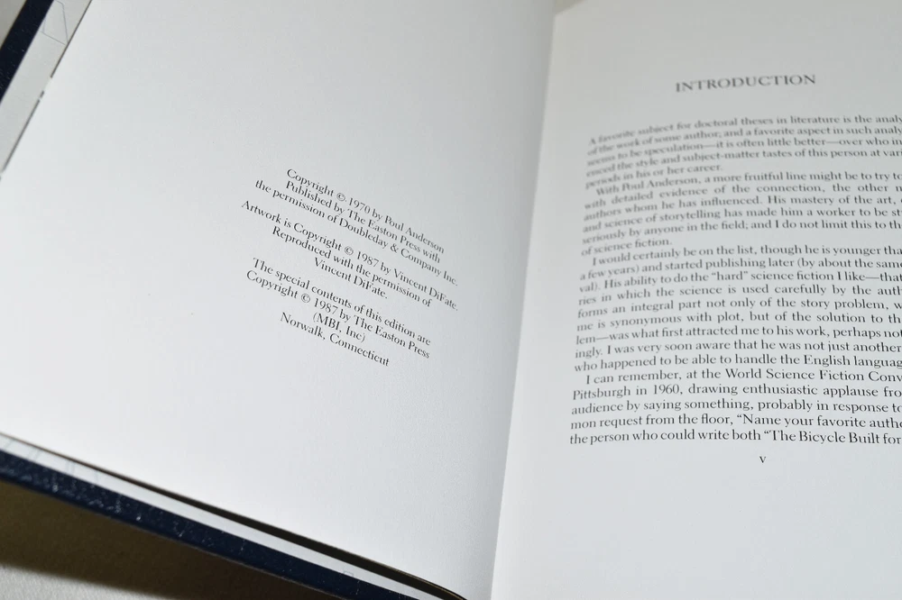 From the Easton Press Masterpieces of Science Fiction Collection... Tau Zero by Poul Anderson Introduction by Hal Clement Illustration by Vincent DiFate Copyright 1987 by The Easton Press Bound in Premium Full Leather This volume contains all of the classic Easton Press trimmings: Premium Leather Decorated Endleaves Distinctive Cover Design Hubbed Spine, Accented in Real 22KT Gold Satin Ribbon Page Marker Gilded Page Edges Long-lasting, High Quality Acid-neutral Paper Smyth-sewn Pages for Strength and Durability Beautiful Illustrations A very scarce title in any condition, this volume is in Fine condition. The front and back covers are in terrific condition and the gilded page edges show only minor wear (see pictures of all edges). There is faint residue on the second page. This book is part of the Masterpieces of Science Fiction Collection published by Easton Press and would be a beautiful addition to your Easton Press collection. Hopefully you can add this book to your collection and enjoy it in the years to come... Please Email Me With Any Questions You Might Have! Shipping Info: Buyer to Pay Shipping and Handling International Bidders Pay Extra Shipping Seller Not Responsible For Uninsured Items Lost or Damaged in Mail Forms of Payment Accepted: Paypal Good luck and happy bidding! Powered by eBay Turbo Lister The free listing tool. List your items fast and easy and manage your active items.