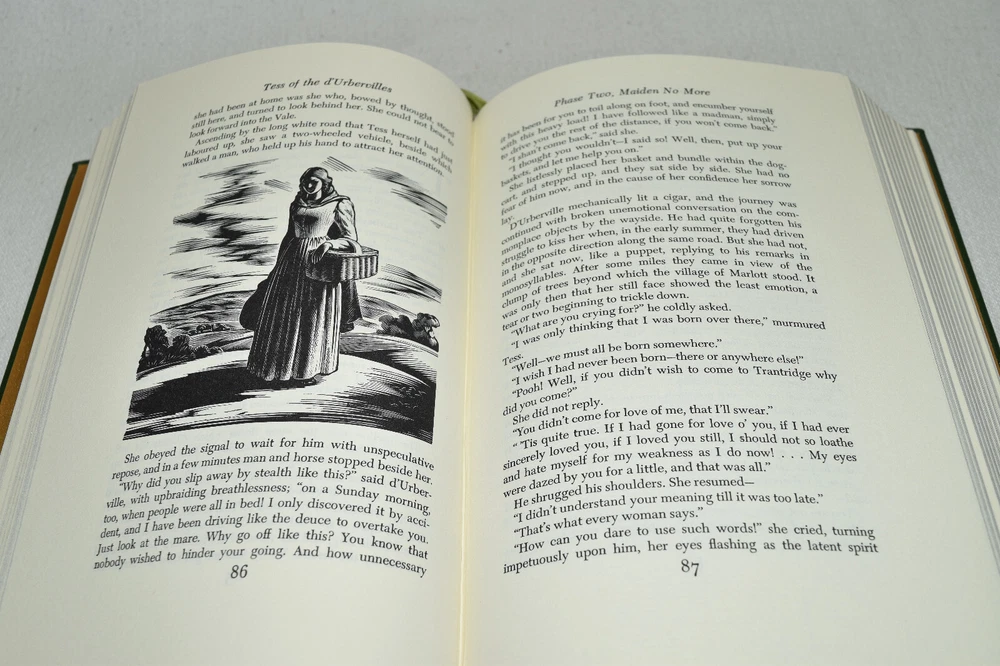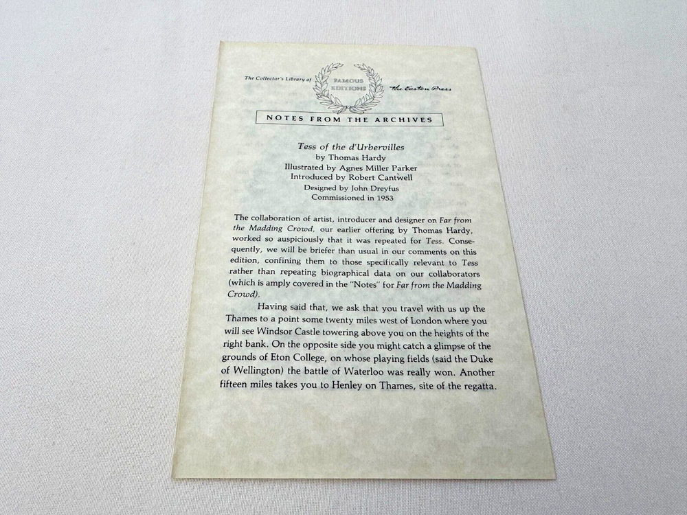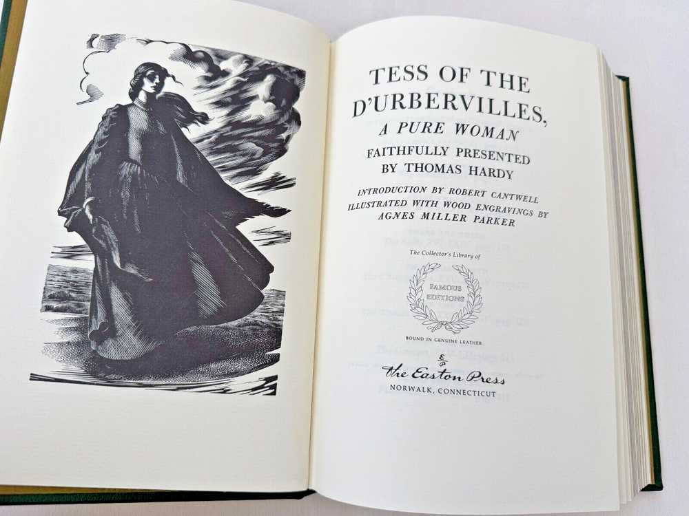 From the Easton Press Library of Famous Editions Collection... Tess of the D'Urbervilles A Pure Woman by Thomas Hardy Illustrated by Agnes Miller Parker Introduced by Robert Cantwell Copyright 1984 by The Easton Press Bound in Premium Full Leather This volume contains all of the classic Easton Press trimmings: Premium Leather Silk Moire Endleaves Distinctive Cover Design Hubbed Spine, Accented in Real 22KT Gold Satin Ribbon Page Marker Gilded Page Edges Long-lasting, High Quality Acid-neutral Paper Smyth-sewn Pages for Strength and Durability Beautiful Illustrations A very scarce title in any condition, this volume is in near Mint and Unread condition. The front and back covers are both in near Perfect condition and the gilded page edges show hardly any wear at all! There are no bookplates or other signs of prior ownership in the book . This book is part of the Library of Famous Editions Collection published by Easton Press and would be a beautiful addition to your Easton Press collection. Hopefully you can add this book to your collection and enjoy it in the years to come... Please Email Me With Any Questions You Might Have! Shipping Info: Buyer to Pay Shipping and Handling International Bidders Pay Extra Shipping Good luck and happy bidding!