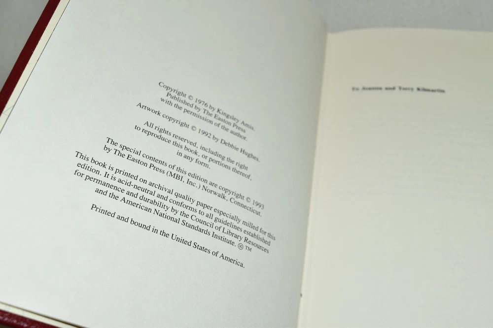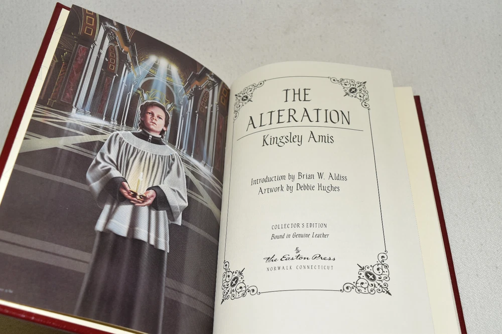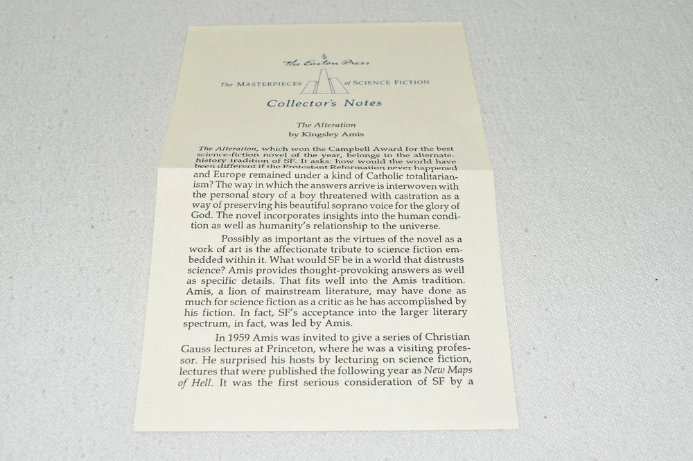 From the Easton Press Masterpieces of Science Fiction Collection... The Alteration by Kingsley Amis Introduction by Brian Aldiss Illustration by Debbie Hughes Copyright 1993 by The Easton Press Bound in Premium Full Leather This volume contains all of the classic Easton Press trimmings: Premium Leather Decorated Endleaves Distinctive Cover Design Hubbed Spine, Accented in Real 22KT Gold Satin Ribbon Page Marker Gilded Page Edges Long-lasting, High Quality Acid-neutral Paper Smyth-sewn Pages for Strength and Durability Beautiful Illustrations A very scarce title in any condition, this volume is in Fine condition. The front and back covers are in terrific condition and the gilded page edges show very minor wear (see pictures of all edges). There is faint residue on the second page. This book is part of the Masterpieces of Science Fiction Collection published by Easton Press. It comes complete with Collector's Notes and would be a beautiful addition to your Easton Press collection. Hopefully you can add this book to your collection and enjoy it in the years to come... Please Email Me With Any Questions You Might Have! Shipping Info: Buyer to Pay Shipping and Handling International Bidders Pay Extra Shipping Seller Not Responsible For Uninsured Items Lost or Damaged in Mail Forms of Payment Accepted: Paypal Good luck and happy bidding! Powered by eBay Turbo Lister The free listing tool. List your items fast and easy and manage your active items.