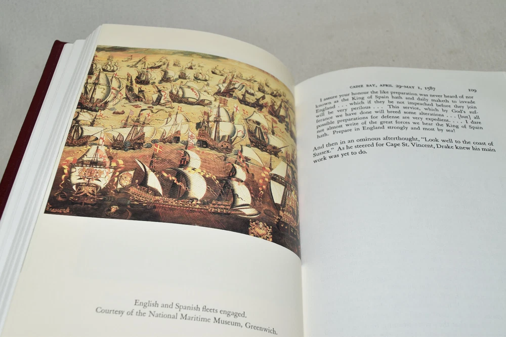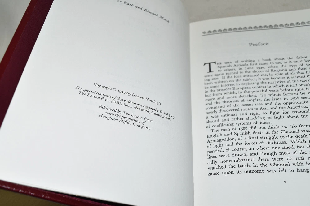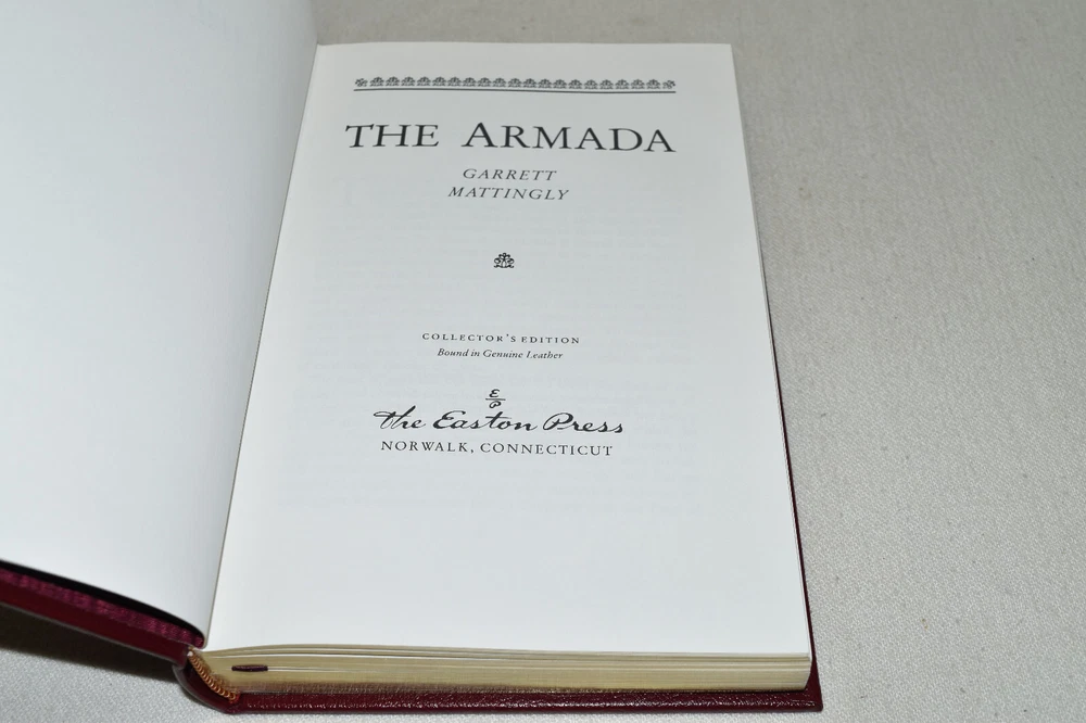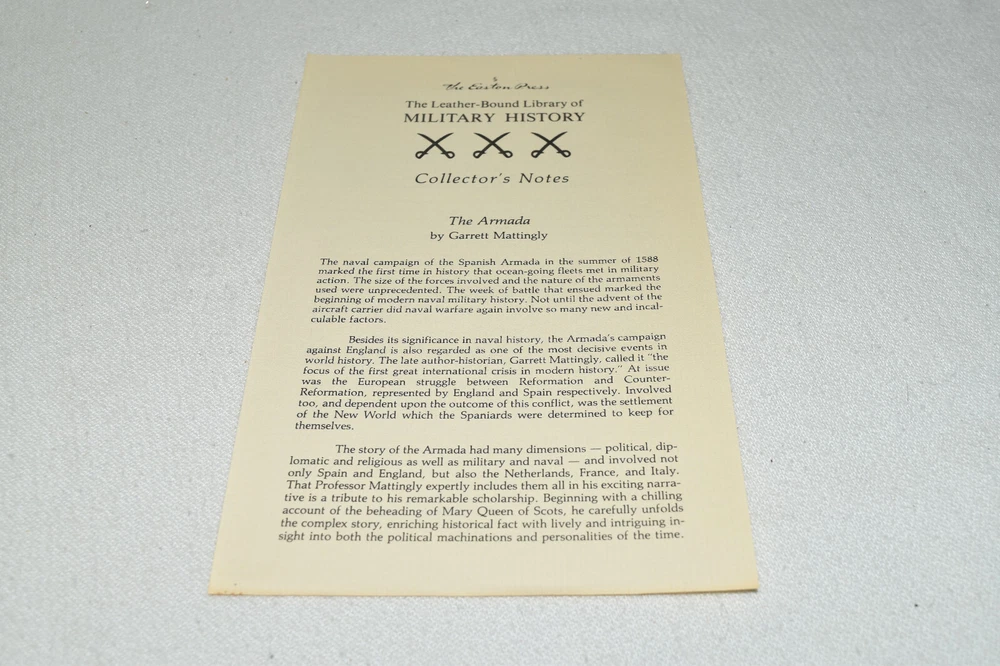 From the Easton Press Library of Military History Collection... The Armada by Garrett Mattingly Profusely Illustrated Copyright 1989 by The Easton Press Bound in Premium Full Leather This volume contains all of the classic Easton Press trimmings: Premium Leather Silk Moire Endleaves Distinctive Cover Design Hubbed Spine, Accented in Real 22KT Gold Satin Ribbon Page Marker Gilded Page Edges Long-lasting, High Quality Acid-neutral Paper Smyth-sewn Pages for Strength and Durability Beautiful Illustrations A very scarce title in any condition, this volume is in Fine condition. The front and back covers are both in terrific condition and the gilded page edges show minor rubbing to the bottom corner edge (see pictures of all edges). There is light bookplate residue on the second page. This book is part of the Library of Military History Collection published by Easton Press. It comes complete with Collector's Notes and would be a beautiful addition to your Easton Press collection. Overall, this copy is a grade collector's book. This book is very elusive in this superior condition, as only a limited number of them were ever published, so now is the time to act. Hopefully you can add this book to your collection and enjoy it in the years to come... Please Email Me With Any Questions You Might Have! Shipping Info: Buyer to Pay Shipping and Handling International Bidders Pay Extra Shipping Seller Not Responsible For Uninsured Items Lost or Damaged in Mail Forms of Payment Accepted: Paypal Good luck and happy bidding! Powered by eBay Turbo Lister The free listing tool. List your items fast and easy and manage your active items.