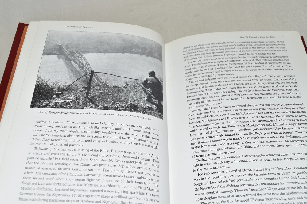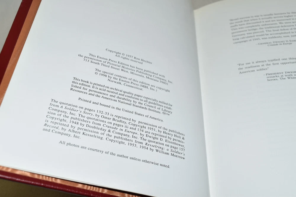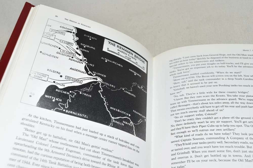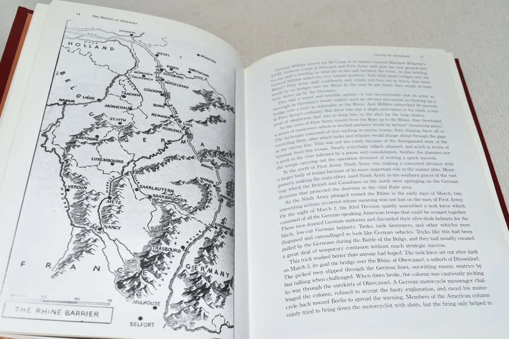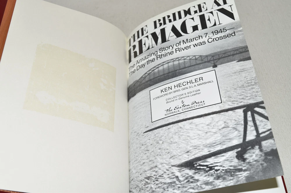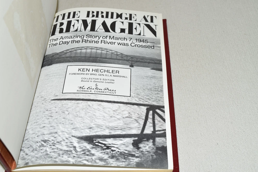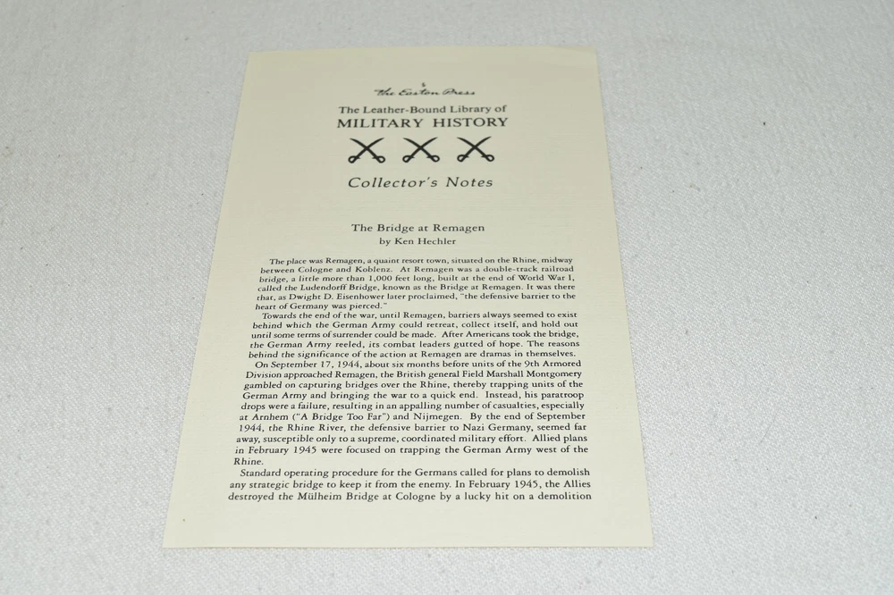 From the Easton Press Library of Military History Collection... The Bridge at Remagen The Amazing Story of March 7, 1945 - The Day the Rhine River was Crossed by Ken Hechler Profusely Illustrated Copyright 1998 by The Easton Press Bound in Premium Full Leather This volume contains all of the classic Easton Press trimmings: Premium Leather Silk Moire Endleaves Distinctive Cover Design Hubbed Spine, Accented in Real 22KT Gold Satin Ribbon Page Marker Gilded Page Edges Long-lasting, High Quality Acid-neutral Paper Smyth-sewn Pages for Strength and Durability Beautiful Illustrations A very scarce title in any condition, this volume is in Fine condition. The front and back covers are both in terrific condition and the gilded page edges show minor wear (see pictures of all edges). There is light residue on the second page. This book is part of the Library of Military History Collection published by Easton Press. It comes complete with Collector's Notes and would be a beautiful addition to your Easton Press collection. Overall, this copy is a grade collector's book. This book is very elusive in this superior condition, as only a limited number of them were ever published, so now is the time to act. Hopefully you can add this book to your collection and enjoy it in the years to come... Please Email Me With Any Questions You Might Have! Shipping Info: Buyer to Pay Shipping and Handling International Bidders Pay Extra Shipping Seller Not Responsible For Uninsured Items Lost or Damaged in Mail Forms of Payment Accepted: Paypal Good luck and happy bidding! Powered by eBay Turbo Lister The free listing tool. List your items fast and easy and manage your active items.