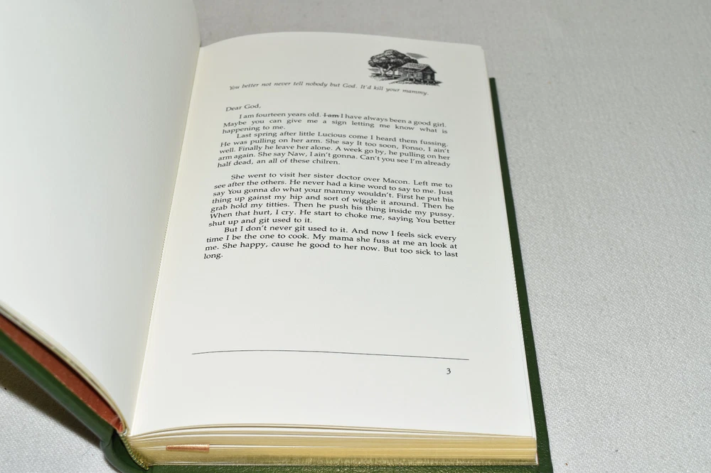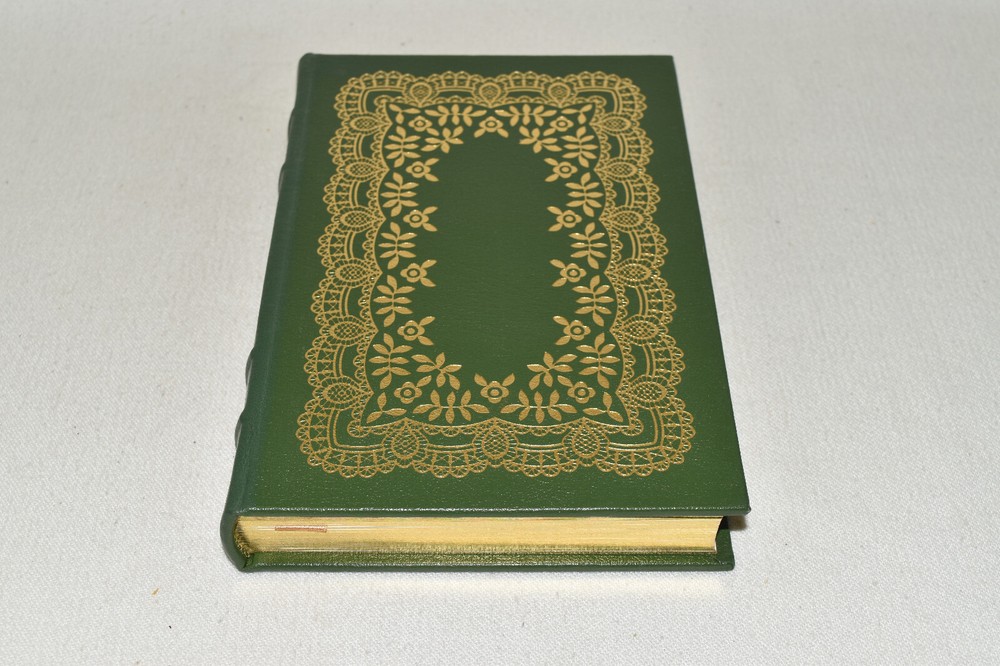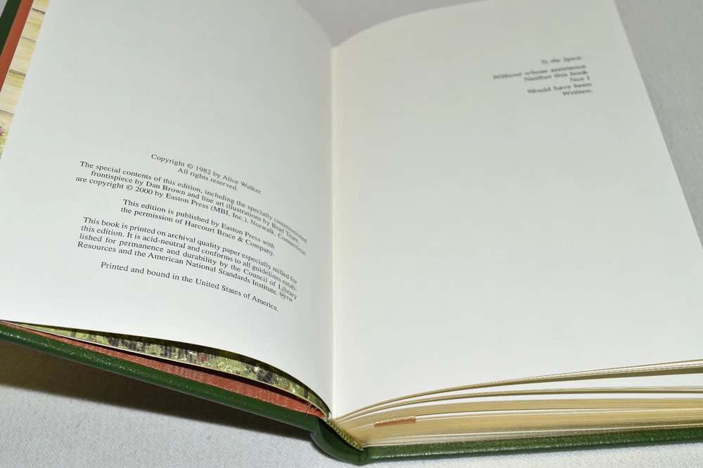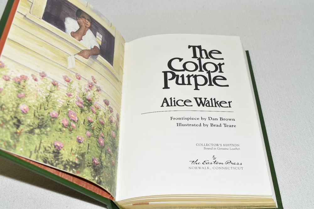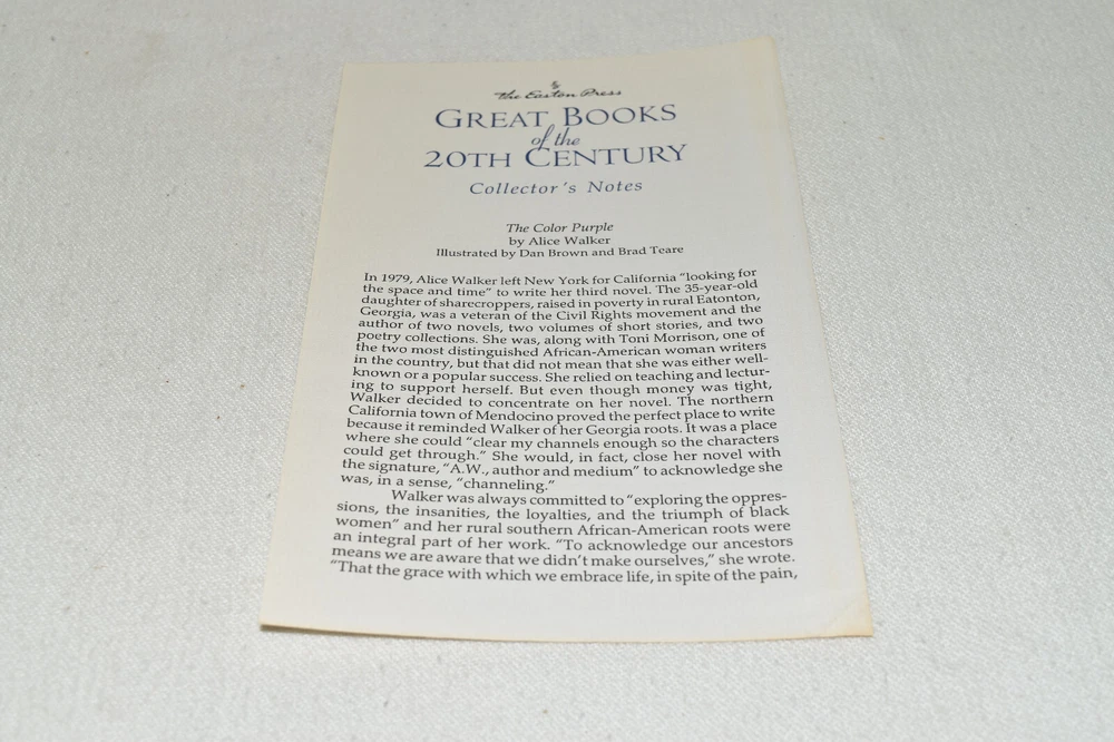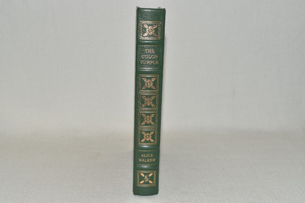 From the Easton Press Great Books of the 20th Century Collection... The Color Purple by Alice Walker Illustrated by Brad Teare Copyright 2000 by The Easton Press Bound in Premium Full Leather This volume contains all of the classic Easton Press trimmings: Premium Leather Silk Moire Endleaves Distinctive Cover Design Hubbed Spine, Accented in Real 22KT Gold Satin Ribbon Page Marker Gilded Page Edges Long-lasting, High Quality Acid-neutral Paper Smyth-sewn Pages for Strength and Durability Beautiful Illustrations A very scarce title in any condition, this volume is in Fine condition. The front and back covers are both in terrific condition and the gilded page edges show a few small scratches (see pictures of all edges). There are no markings, bookplates, or other signs of prior ownership in this book. This book is part of the Great Books of the 20th Century Collection published by Easton Press. It comes complete with Collector's Notes and would be a beautiful addition to your Easton Press collection. Overall, this copy is a grade collector's book. This book is very elusive in this superior condition, as only a limited number of them were ever published, so now is the time to act. Hopefully you can add this book to your collection and enjoy it in the years to come... Please Email Me With Any Questions You Might Have! Shipping Info: Buyer to Pay Shipping and Handling International Bidders Pay Extra Shipping Seller Not Responsible For Uninsured Items Lost or Damaged in Mail Forms of Payment Accepted: Paypal Good luck and happy bidding! Powered by eBay Turbo Lister The free listing tool. List your items fast and easy and manage your active items.