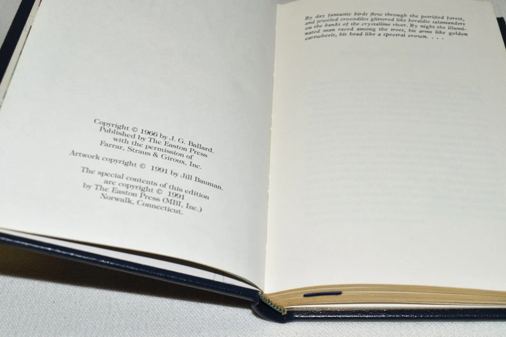 From the Easton Press Masterpieces of Science Fiction Collection... The Crystal World by J. G. Ballard Artwork by Jill Bauman Copyright 1991 by The Easton Press Bound in Premium Full Leather This volume contains all of the classic Easton Press trimmings: Premium Leather Decorated Endleaves Distinctive Cover Design Hubbed Spine, Accented in Real 22KT Gold Satin Ribbon Page Marker Gilded Page Edges Long-lasting, High Quality Acid-neutral Paper Smyth-sewn Pages for Strength and Durability Beautiful Illustrations A very scarce title in any condition, this volume is in Fine condition. The front and back covers are both in terrific condition and the gilded page edges show only faint wear (see pictures of all edges). There are no markings, bookplates, or other signs of prior ownership in this book. This book is part of the Masterpieces of Science Fiction Collection published by Easton Press. It comes complete with Collector's Notes and would be a beautiful addition to your Easton Press collection. Overall, this copy is a grade collector's book. This book is very elusive in this superior condition, as only a limited number of them were ever published, so now is the time to act. Hopefully you can add this book to your collection and enjoy it in the years to come... Please Email Me With Any Questions You Might Have! Shipping Info: Buyer to Pay Shipping and Handling International Bidders Pay Extra Shipping Seller Not Responsible For Uninsured Items Lost or Damaged in Mail Forms of Payment Accepted: Paypal Good luck and happy bidding! Powered by eBay Turbo Lister The free listing tool. List your items fast and easy and manage your active items.