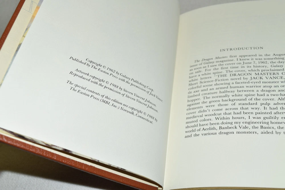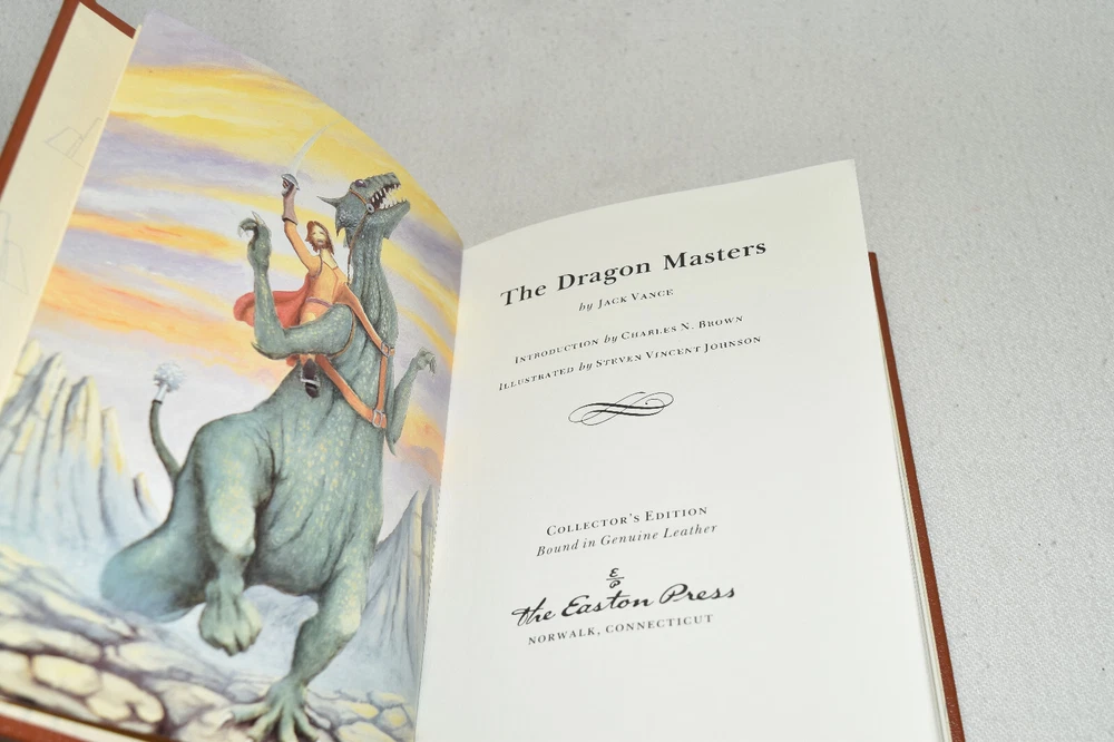 From the Easton Press Masterpieces of Science Fiction Collection... The Dragon Masters by Jack Vance Introduction by Charles Brown Illustration by Steven Vincent Johnson Copyright 1988 by The Easton Press Bound in Premium Full Leather This volume contains all of the classic Easton Press trimmings: Premium Leather Decorated Endleaves Distinctive Cover Design Hubbed Spine, Accented in Real 22KT Gold Satin Ribbon Page Marker Gilded Page Edges Long-lasting, High Quality Acid-neutral Paper Smyth-sewn Pages for Strength and Durability Beautiful Illustrations A very scarce title in any condition, this volume is in Near Fine - Fine condition. The front and back covers are in terrific condition and the gilded page edges show minor wear to the side edge (see pictures of all edges). There is faint residue on the second page. This book is part of the Masterpieces of Science Fiction Collection published by Easton Press and would be a beautiful addition to your Easton Press collection. Hopefully you can add this book to your collection and enjoy it in the years to come... Please Email Me With Any Questions You Might Have! Shipping Info: Buyer to Pay Shipping and Handling International Bidders Pay Extra Shipping Seller Not Responsible For Uninsured Items Lost or Damaged in Mail Forms of Payment Accepted: Paypal Good luck and happy bidding! Powered by eBay Turbo Lister The free listing tool. List your items fast and easy and manage your active items.