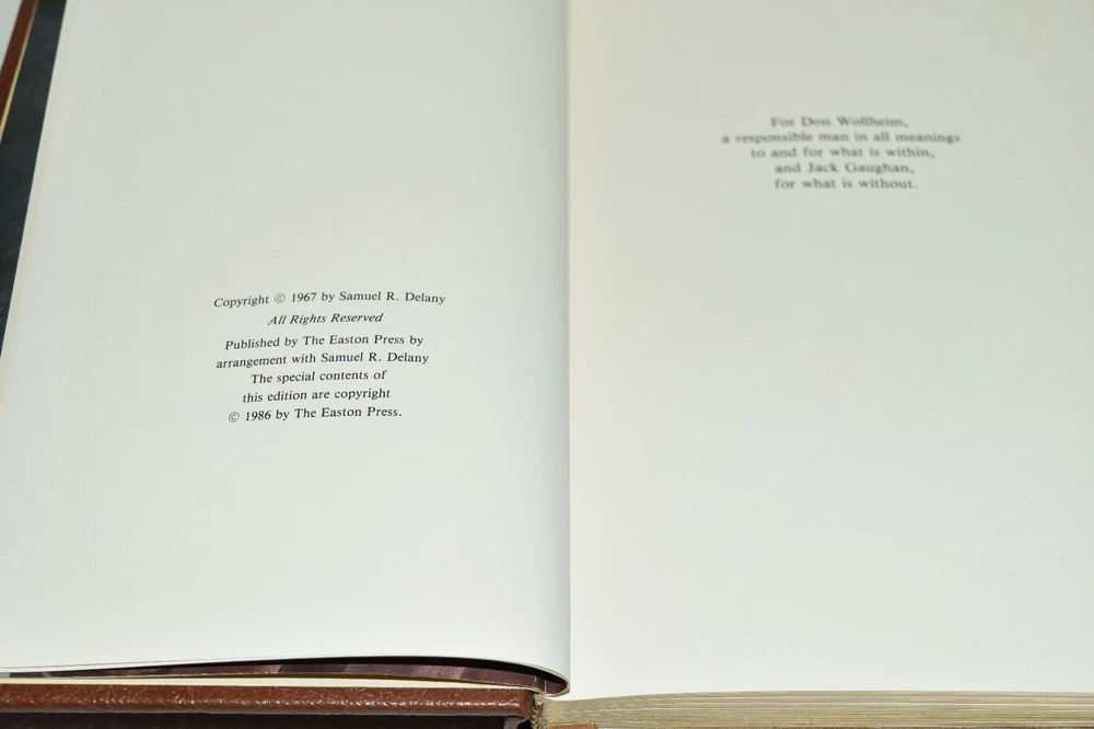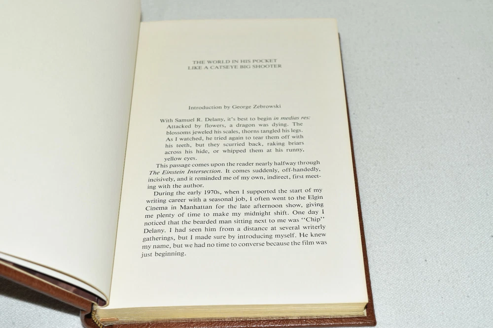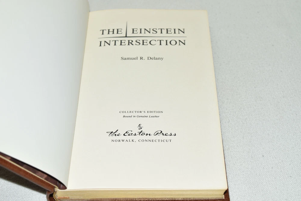 From the Easton Press Masterpieces of Science Fiction Collection... The Einstein Intersection by Samuel Delany Collector's Edition Copyright 1986 by The Easton Press Bound in Premium Full Leather This volume contains all of the classic Easton Press trimmings: Premium Leather Silk Moire Endleaves Distinctive Cover Design Hubbed Spine, Accented in Real 22KT Gold Satin Ribbon Page Marker Gilded Page Edges Long-lasting, High Quality Acid-neutral Paper Smyth-sewn Pages for Strength and Durability Beautiful Illustrations A very scarce title in any condition, this 1986 Easton Press Edition is in Near Fine - Fine condition! The front and back covers are both in terrific condition and the gilded page edges show minor wear (see pictures of all sides of gilt). There is no attached bookplate nor any other signs of previous ownership . This book is part of the Masterpieces of Science Fiction Collection published by Easton Press and would be a beautiful addition to your Easton Press collection. Please Email Me With Any Questions You Might Have! Shipping Info: Buyer to Pay Shipping and Handling International Bidders Pay Extra Shipping Seller Not Responsible For Uninsured Items Lost or Damaged in Mail Forms of Payment Accepted: Paypal Good luck and happy bidding! Powered by eBay Turbo Lister The free listing tool. List your items fast and easy and manage your active items.
