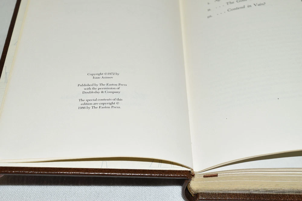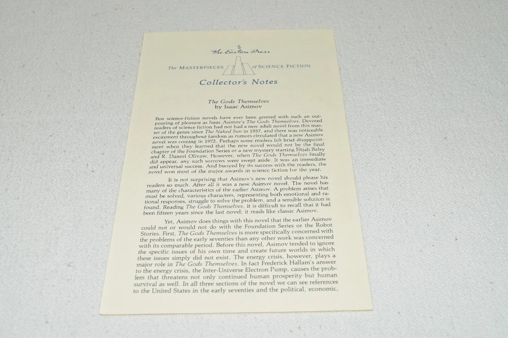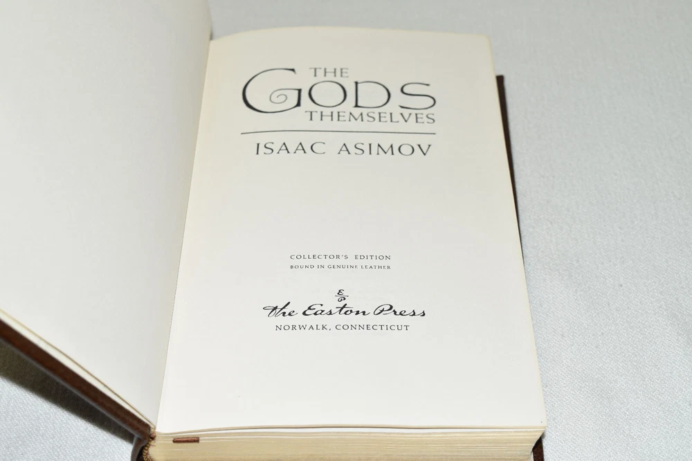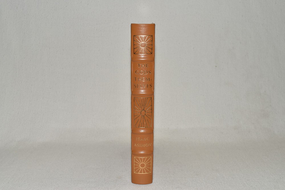 From the Easton Press Masterpieces of Science Fiction Collection... The Gods Themselves by Isaac Asimov With Artwork Copyright 1986 by The Easton Press Bound in Premium Full Leather This volume contains all of the classic Easton Press trimmings: Premium Leather Decorated Endleaves Distinctive Cover Design Hubbed Spine, Accented in Real 22KT Gold Satin Ribbon Page Marker Gilded Page Edges Long-lasting, High Quality Acid-neutral Paper Smyth-sewn Pages for Strength and Durability Beautiful Illustrations A very scarce title in any condition, this volume is in Near Fine - Fine condition. The front and back covers are in terrific condition and the gilded page edges show minor wear (see pictures of all edges). There is light residue on the second page. This book is part of the Masterpieces of Science Fiction Collection published by Easton Press and would be a beautiful addition to your Easton Press collection. Hopefully you can add this book to your collection and enjoy it in the years to come... Please Email Me With Any Questions You Might Have! Shipping Info: Buyer to Pay Shipping and Handling International Bidders Pay Extra Shipping Seller Not Responsible For Uninsured Items Lost or Damaged in Mail Forms of Payment Accepted: Paypal Good luck and happy bidding! Powered by eBay Turbo Lister The free listing tool. List your items fast and easy and manage your active items.