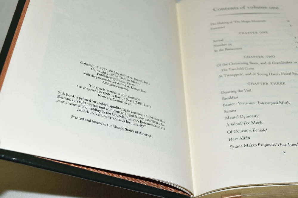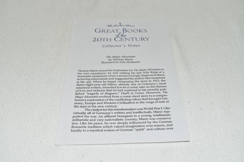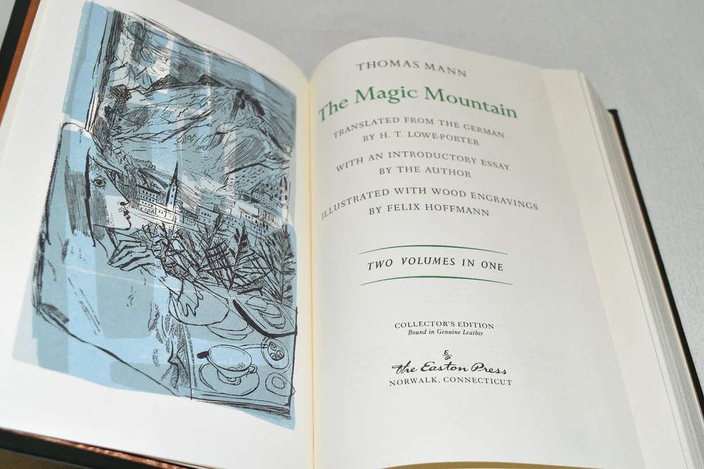 From the Easton Press Great Books of the 20th Century Collection... The Magic Mountain by Thomas Mann Artwork by Felix Hoffman Copyright 1999 by The Easton Press Bound in Premium Full Leather This volume contains all of the classic Easton Press trimmings: Premium Leather Silk Moire Endleaves Distinctive Cover Design Hubbed Spine, Accented in Real 22KT Gold Satin Ribbon Page Marker Gilded Page Edges Long-lasting, High Quality Acid-neutral Paper Smyth-sewn Pages for Strength and Durability Beautiful Illustrations A very scarce title in any condition, this volume is in Near Fine - Fine condition. The front and back covers are both in terrific condition and the gilded page edges show minor wear (see pictures of all edges). There are no markings, bookplates, or other signs of prior ownership in this book. This book is part of the Great Books of the 20th Century Collection published by Easton Press and would be a beautiful addition to your Easton Press collection. Hopefully you can add this book to your collection and enjoy it in the years to come... Please Email Me With Any Questions You Might Have! Shipping Info: Buyer to Pay Shipping and Handling International Bidders Pay Extra Shipping Seller Not Responsible For Uninsured Items Lost or Damaged in Mail Forms of Payment Accepted: Paypal Good luck and happy bidding! Powered by eBay Turbo Lister The free listing tool. List your items fast and easy and manage your active items.