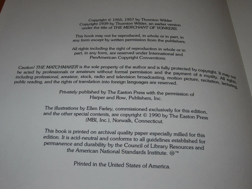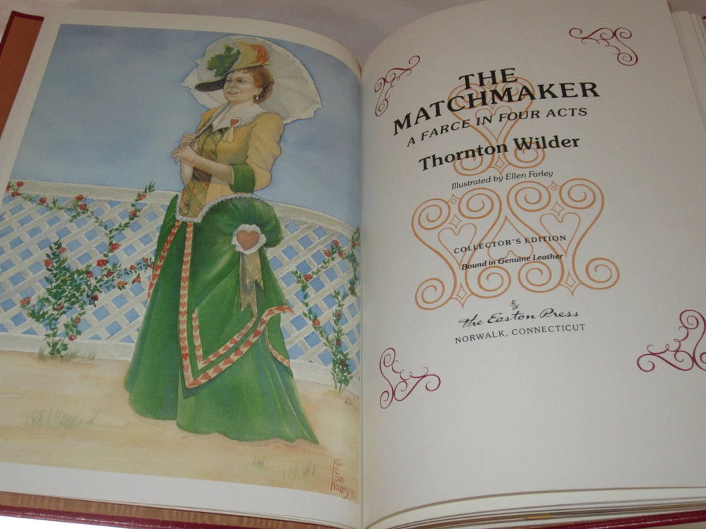From the Easton Press Library... The Matchmaker A Farce in our Acts by Thornton Wilder Copyright 1990 by The Easton Press Collector's Edition Bound in Premium Full Leather This volume contains all of the classic Easton Press trimmings: Premium Leather Decorated Endleaves Distinctive Cover Design Hubbed Spine, Accented in Real 22KT Gold Satin Ribbon Page Marker Gilded Page Edges Long-lasting, High Quality Acid-neutral Paper Smyth-sewn Pages for Strength and Durability Beautiful Illustrations A very scarce title in any condition, this volume is in Fine condition. The front and back covers are both in near perfect condition and the gilded page edges show hardly any wear. There are no bookplates, markings, or other signs of prior ownership . This book is published by Easton Press and is a Collector's Edition. It would be a beautiful addition to your Easton Press collection. Overall, this copy is a grade collector's book. This book is very elusive in this superior condition, as only a limited number of them were ever published, so now is the time to act. Hopefully you can add this book to your collection and enjoy it in the years to come... Please Email Me With Any Questions You Might Have! Shipping Info: Buyer to Pay Shipping & Handling International Bidders Pay Extra Shipping Forms of Payment Accepted: Paypal Good luck and happy bidding! Powered by eBay Turbo Lister The free listing tool. List your items fast and easy and manage your active items.
