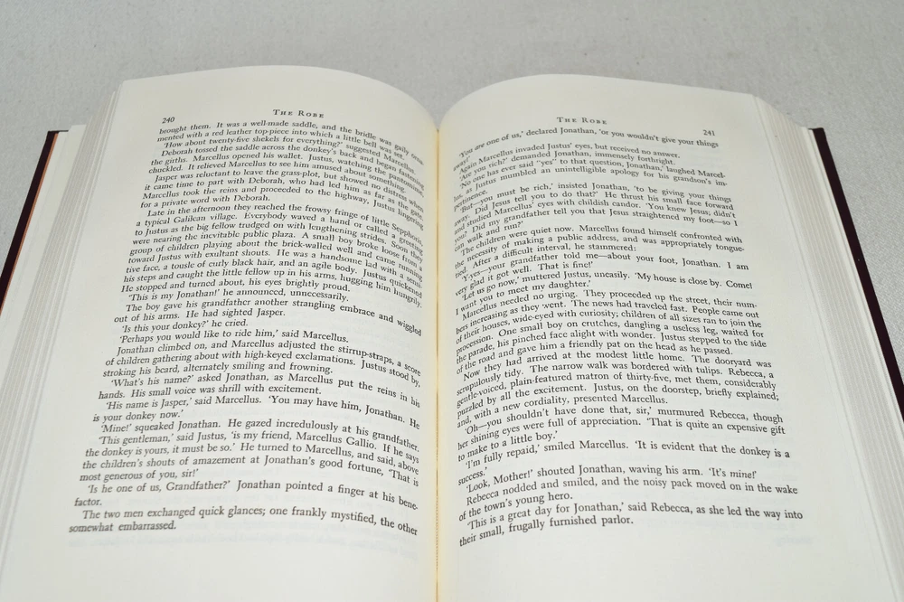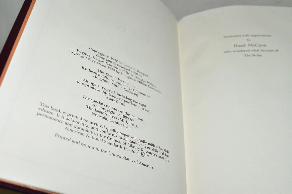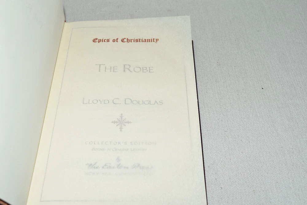 From the Easton Press Collection... The Robe by Lloyd C. Douglas Collector's Edition Copyright 1995 by The Easton Press Bound in Premium Full Leather This volume contains all of the classic Easton Press trimmings: Premium Leather Silk Moire Endleaves Distinctive Cover Design Hubbed Spine, Accented in Real 22KT Gold Satin Ribbon Page Marker Gilded Page Edges Long-lasting, High Quality Acid-neutral Paper Smyth-sewn Pages for Strength and Durability Beautiful Illustrations A very scarce title in any condition, this Easton Press Limited Edition is in Fine condition. The front and back covers are both in near perfect condition and the gilded page edges show only minor wear (see pictures of all gilt sides). There is faint bookplate residue on the second page. This book was published by Easton Press and would be a beautiful addition to your Easton Press collection. Overall, this copy is a grade collector's book. This book is very elusive in this superior condition, as only a limited number of them were ever published, so now is the time to act. Hopefully you can add this book to your collection and enjoy it in the years to come... Please Email Me With Any Questions You Might Have! Shipping Info: Buyer to Pay Shipping and Handling International Bidders Pay Extra Shipping Seller Not Responsible For Uninsured Items Lost or Damaged in Mail Forms of Payment Accepted: Paypal Good luck and happy bidding! Powered by eBay Turbo Lister The free listing tool. List your items fast and easy and manage your active items.