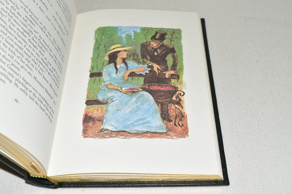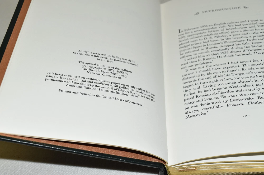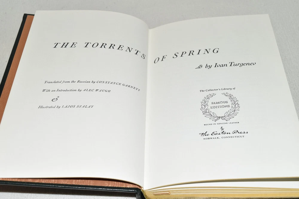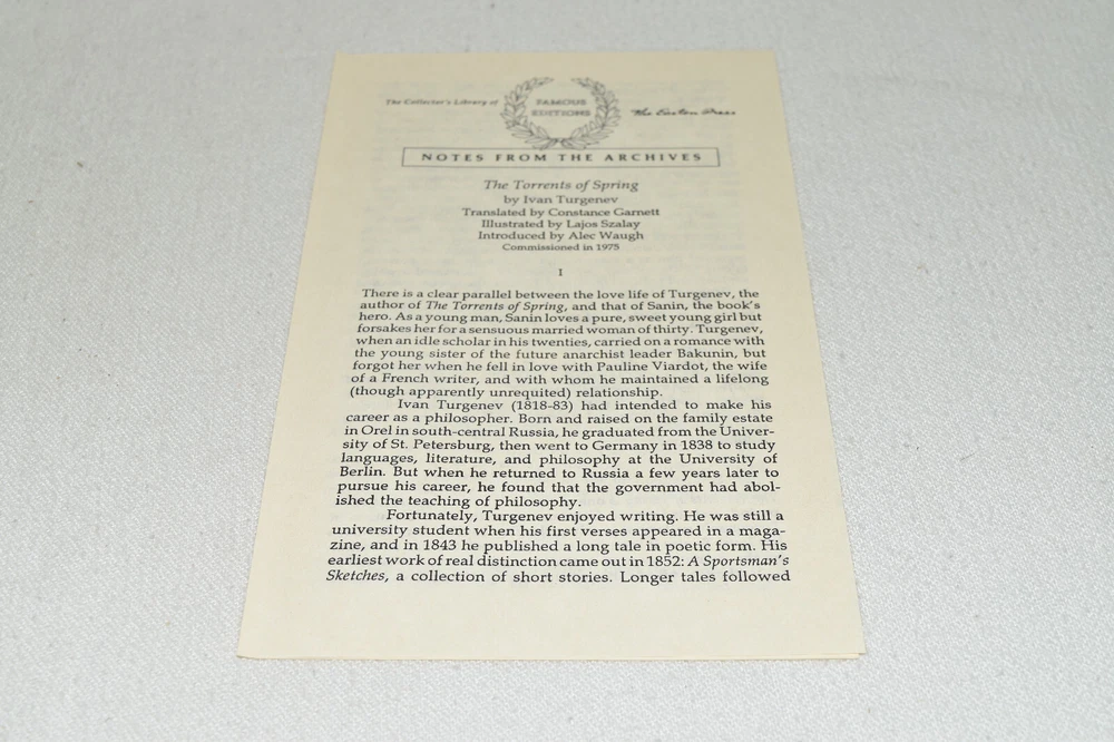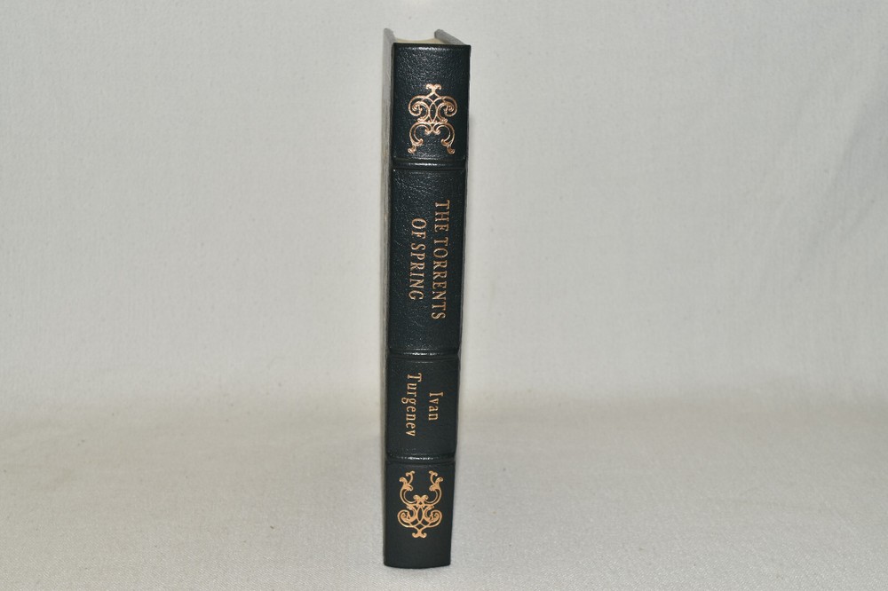 From the Easton Press Library of Famous Editions Collection... The Torrents of Spring by Ivan Turgenev Introduced by Alec Waugh Illustrated by Lajos Szalay Copyright 1992 by The Easton Press Bound in Premium Full Leather This volume contains all of the classic Easton Press trimmings: Premium Leather Silk Moire Endleaves Distinctive Cover Design Hubbed Spine, Accented in Real 22KT Gold Satin Ribbon Page Marker Gilded Page Edges Long-lasting, High Quality Acid-neutral Paper Smyth-sewn Pages for Strength and Durability Beautiful Illustrations A very scarce title in any condition, this volume is in Fine condition. The front and back covers are both in terrific condition and the gilded page edges show hardly any wear (see pictures of all edges). There is faint bookplate residue on the second page. This book is part of the Library of Famous Editions Collection published by Easton Press. It comes complete with Collector's Notes and would be a beautiful addition to your Easton Press collection. Overall, this copy is a grade collector's book. This book is very elusive in this superior condition, as only a limited number of them were ever published, so now is the time to act. Hopefully you can add this book to your collection and enjoy it in the years to come... Please Email Me With Any Questions You Might Have! Shipping Info: Buyer to Pay Shipping and Handling International Bidders Pay Extra Shipping Seller Not Responsible For Uninsured Items Lost or Damaged in Mail Forms of Payment Accepted: Paypal Good luck and happy bidding! Powered by eBay Turbo Lister The free listing tool. List your items fast and easy and manage your active items.