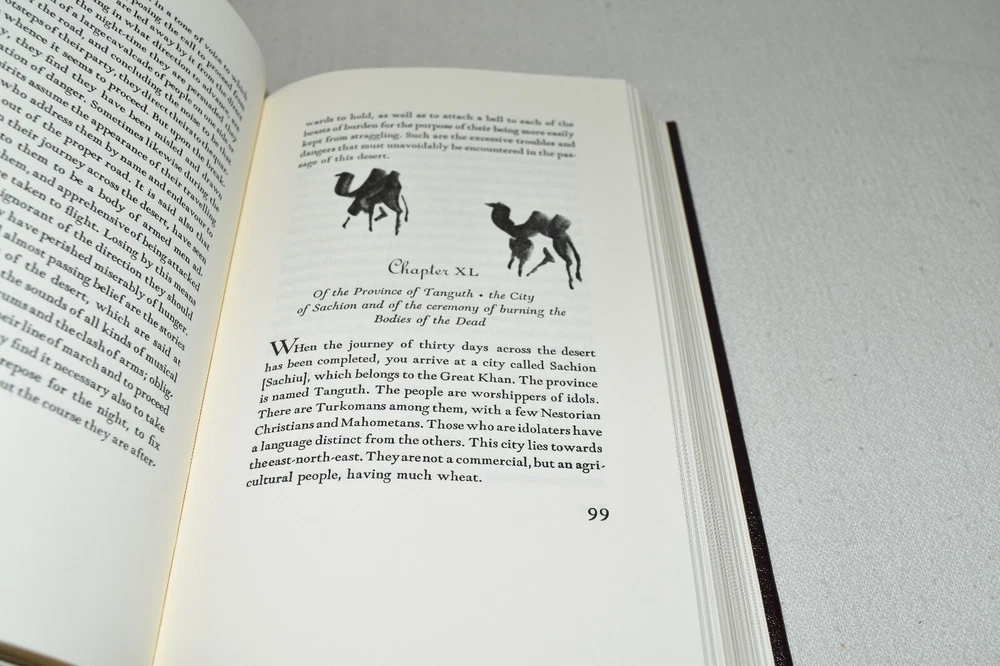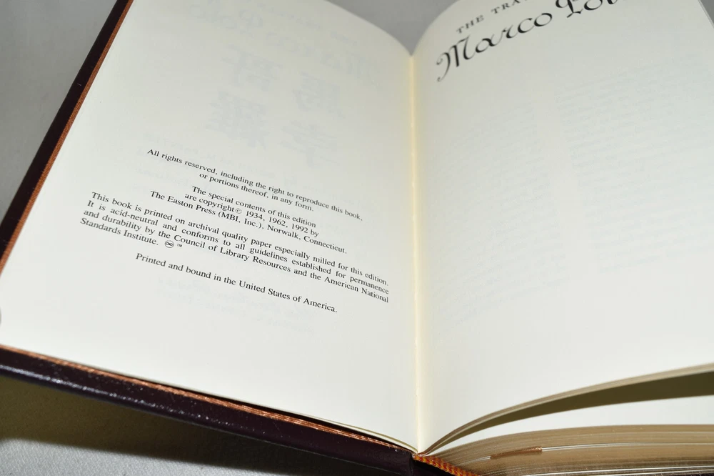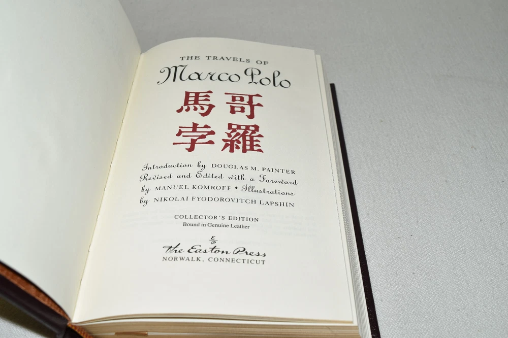 From the Easton Press Collection... The Travels of Marco Polo Introduction by Douglas Painter Foreword by Manuel Komroff Illustrations by Nikolai Lapshin Collector's Edition Copyright 1992 by The Easton Press Bound in Premium Full Leather This volume contains all of the classic Easton Press trimmings: Premium Leather Silk Moire Endleaves Distinctive Cover Design Hubbed Spine, Accented in Real 22KT Gold Satin Ribbon Page Marker Gilded Page Edges Long-lasting, High Quality Acid-neutral Paper Smyth-sewn Pages for Strength and Durability Beautiful Illustrations A very scarce title in any condition, this Easton Press Limited Edition is in Near Fine - Fine condition. The front and back covers are both in terrific condition and the gilded page edges show only faint wear (see pictures of all gilt sides). There is light residue on the second page. This book was published by Easton Press and would be a beautiful addition to your Easton Press collection. Overall, this copy is a grade collector's book. This book is very elusive in this superior condition, as only a limited number of them were ever published, so now is the time to act. Hopefully you can add this book to your collection and enjoy it in the years to come... Please Email Me With Any Questions You Might Have! Shipping Info: Buyer to Pay Shipping and Handling International Bidders Pay Extra Shipping Seller Not Responsible For Uninsured Items Lost or Damaged in Mail Forms of Payment Accepted: Paypal Good luck and happy bidding! Powered by eBay Turbo Lister The free listing tool. List your items fast and easy and manage your active items.