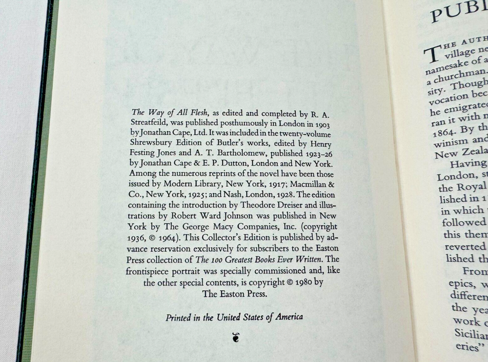 From the Easton Press 100 Greatest Books Ever Written... The Way of All Flesh by Samuel Butler Pictures by Robert Ward Johnson Copyright 1980 by The Easton Press Bound in Premium Full Leather This volume contains all of the classic Easton Press trimmings: Premium Leather Silk Moire Endleaves Distinctive Cover Design Hubbed Spine, Accented in Real 22KT Gold Satin Ribbon Page Marker Gilded Page Edges Long-lasting, High Quality Acid-neutral Paper Smyth-sewn Pages for Strength and Durability Beautiful Illustrations DESCRIPTION A very scarce title in any condition, this Collector's Edition is in Absolute Mint and Unread condition. The front and back covers are in near Perfect condition and the gilded page edges show hardly any wear at all! There are no markings, bookplates, or other signs of prior ownership in this book. This book is part of the 100 Greatest Books Ever Written Collection published by The Easton Press and would be a beautiful addition to your Easton Press collection. Overall, this copy is a grade collector's set. This set is very elusive in this superior condition, as only a limited number of them were ever published, so now is the time to act. Hopefully you can add this set to your collection and enjoy it in the years to come... SHIPPING POLICY We take great care packaging every item to ensure safe shipment to you. Items are packaged using plenty of bubble wrap and packaged securely in a sturdy box. Our secure shipping methods have resulted in zero damaged items in over 15 years! Items are shipped out within 1 - 3 days of payment being received. RETURN & REFUND POLICY We accept refunds within 30 days of purchase. If you are not 100% satisfied with your purchase, please contact us about a refund, or initiate a refund through eBay. CONTACT US We are committed to providing our customers with the best possible on-line shopping experience. This includes a commitment to excellent customer service, before you purchase as well as after your order has been delivered. Please feel free to submit any questions or inquiries regarding this item or your order by sending us a message through the eBay messaging system. We will typically respond within 24 hours of receiving your message.
