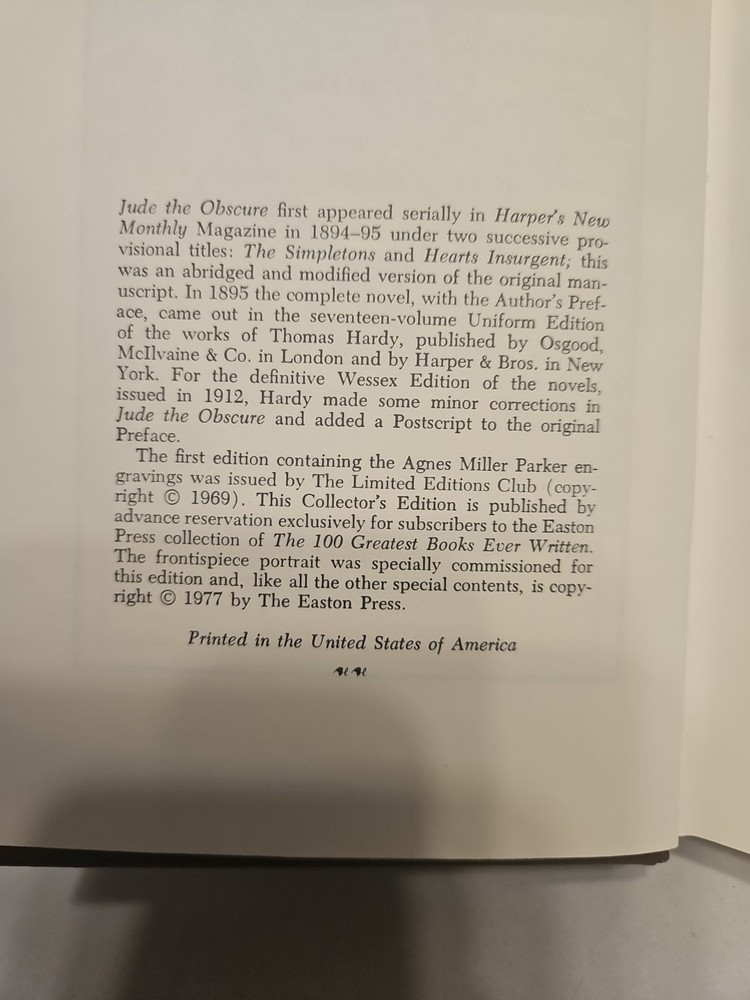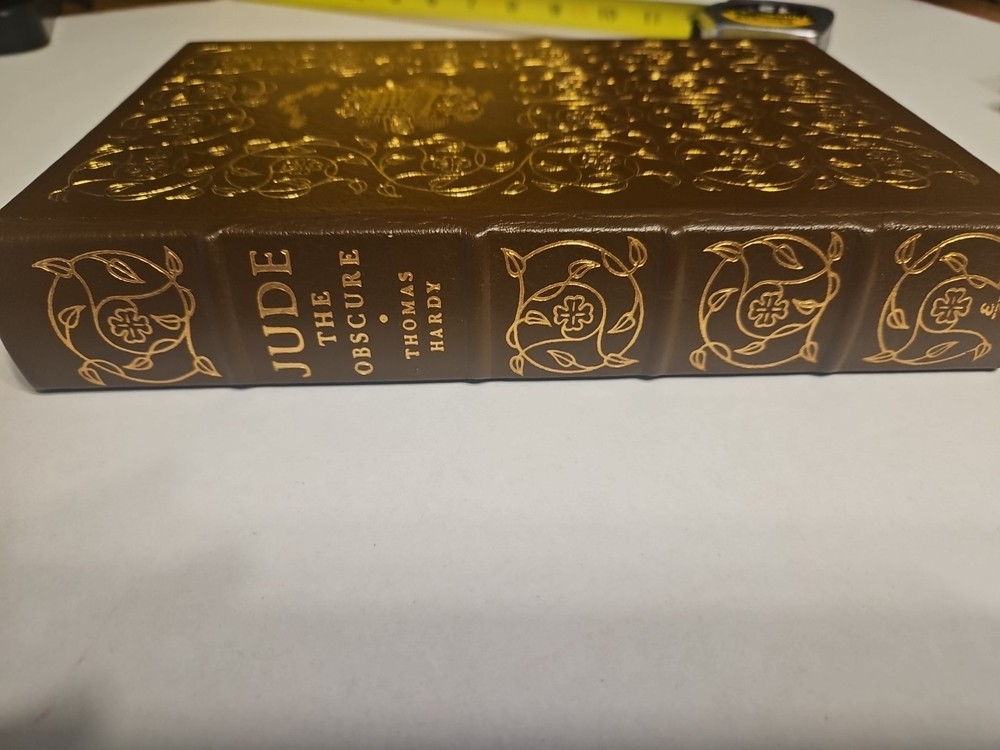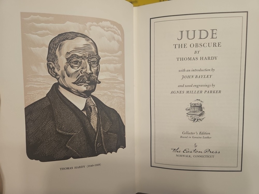 Delve into the poignant world of Thomas Hardy with the Easton Press edition of "Jude the Obscure," a masterpiece that showcases the stark beauty of 19th century Wessex, England. This leather-bound volume, part of the prestigious 100 Greatest series, is a treasure for both collectors and literature enthusiasts. Published in 1977, it features the original text enriched with illustrations by Agnes Miller Parker, adding a layer of visual richness to Hardy's compelling narrative. The book remains unread, ensuring that the tales of Jude and Arabella are presented in all their glory, free from personalized inscriptions or signatures. A genuine product of the United States, this literary piece is a testament to the enduring legacy of Hardy's work, capturing the essence of a bygone era in English literature. Easton Press leather-bound collectors edition.