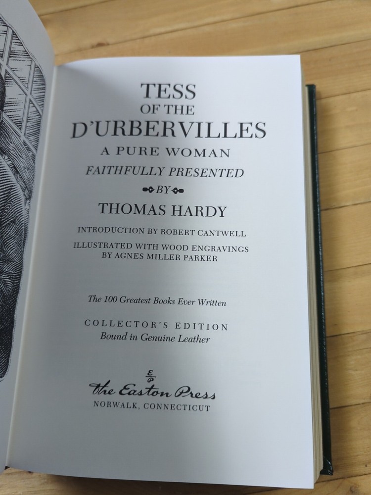 Includes 1 unused bookplate. This beautiful leather-bound book is a special addition to your library. Published by Easton Press, it features Thomas Hardy's classic "Tess of the D'Urbervilles." This particular edition is from the 100 Greatest collection and was printed in 2005 in the United States. It includes stunning illustrations by Agnes Miller Parker and is a true original. The book is in excellent condition and will make a great addition for collectors interested in English literature and fiction, as well as those who appreciate beautifully illustrated books. This special edition is perfect for anyone who loves the 19th century Wessex England setting and is a must-have for fans of the character family of Tess and Alec d'Uberville.