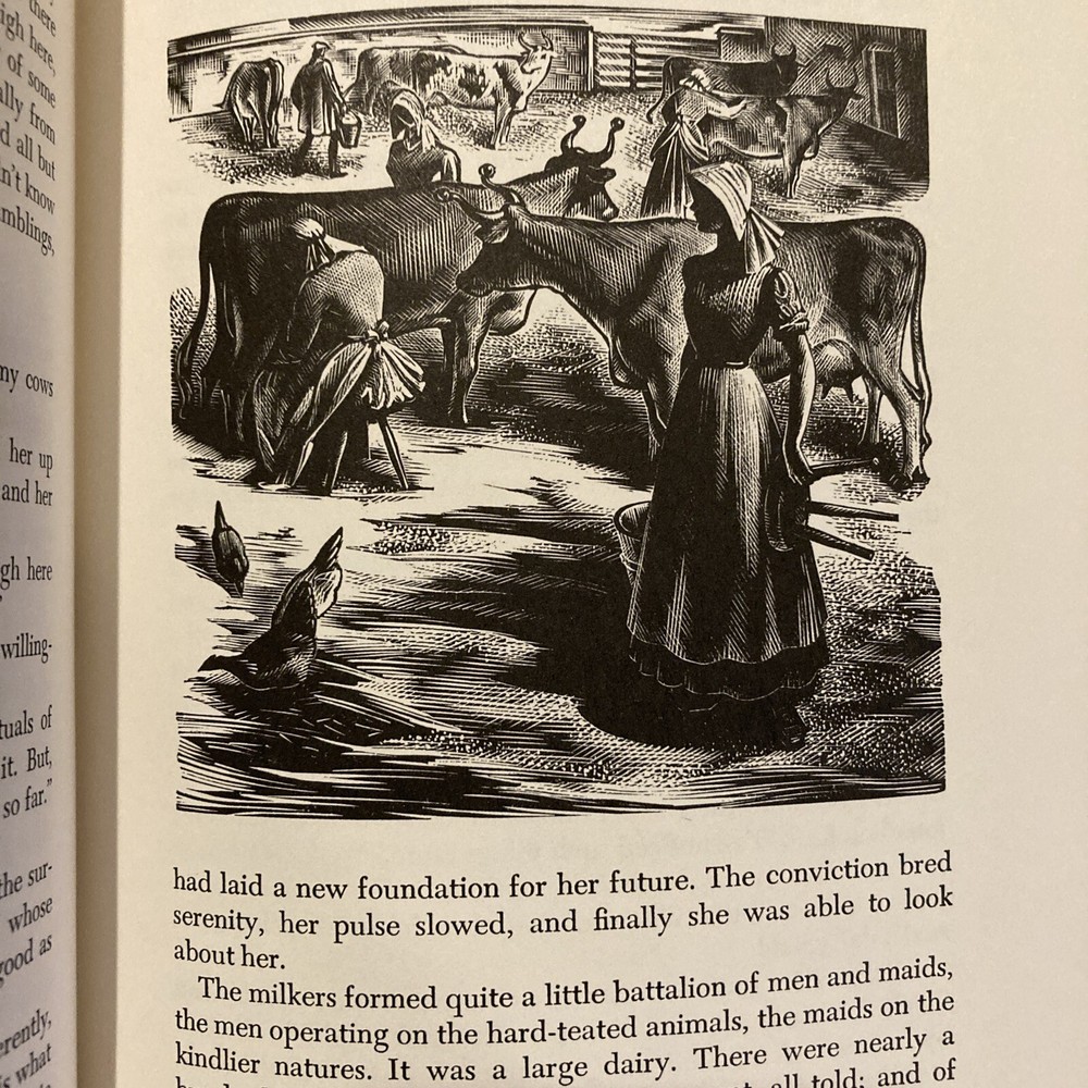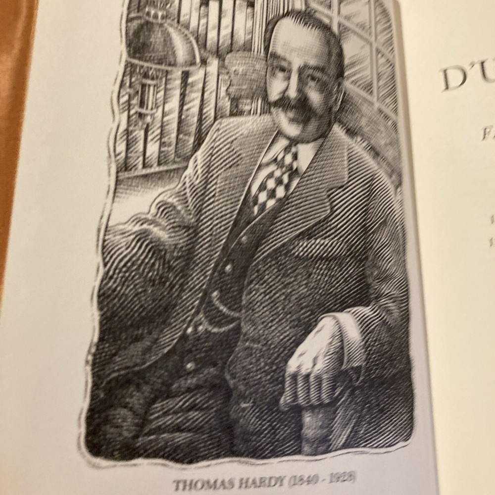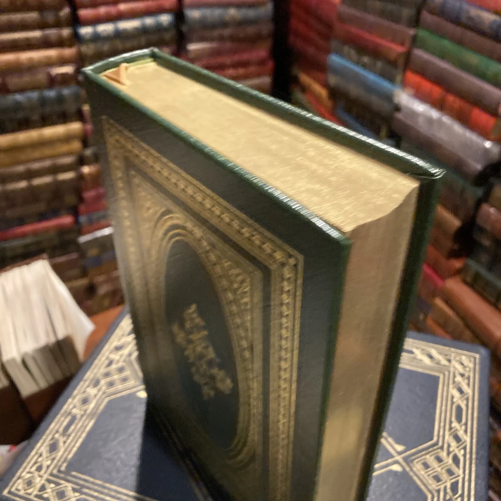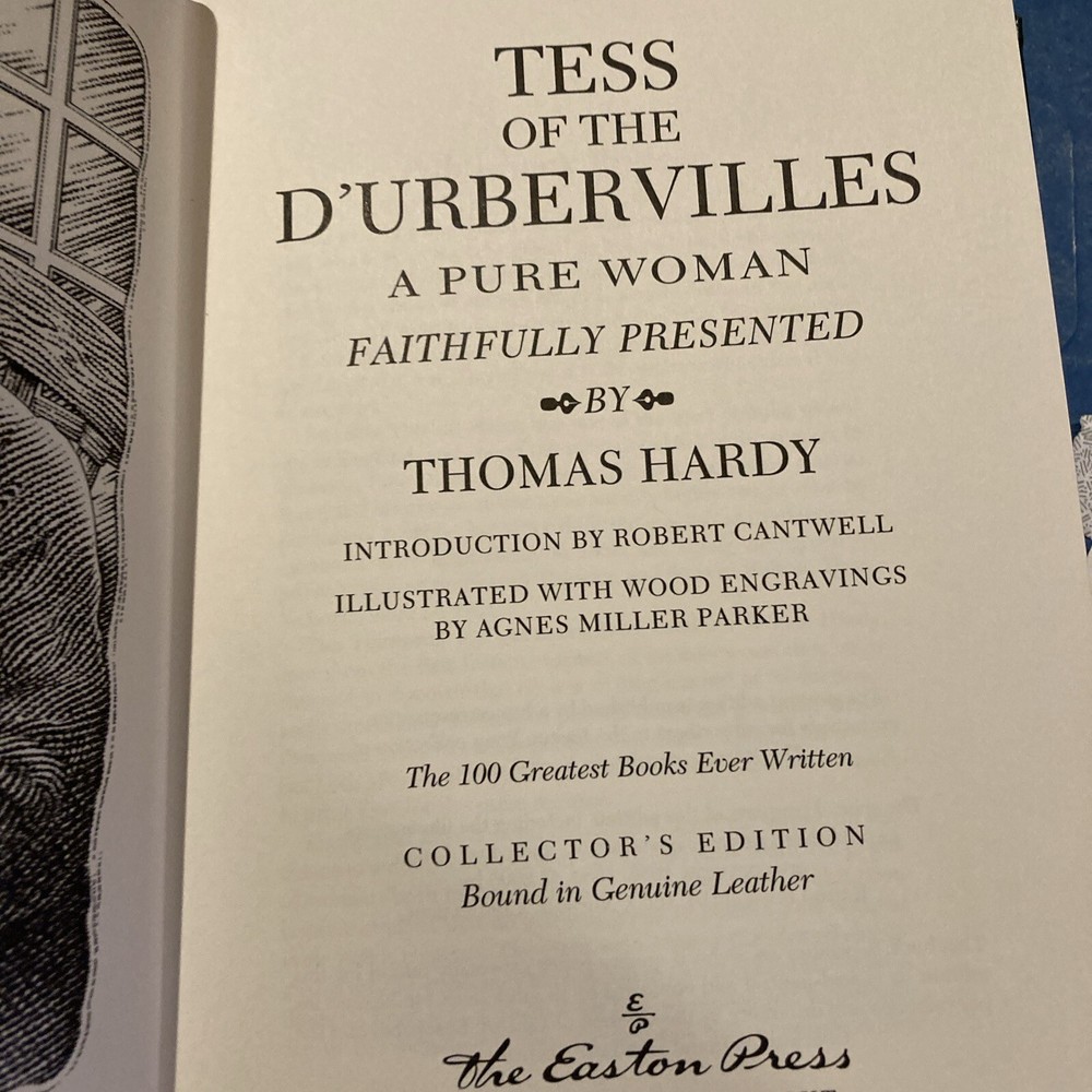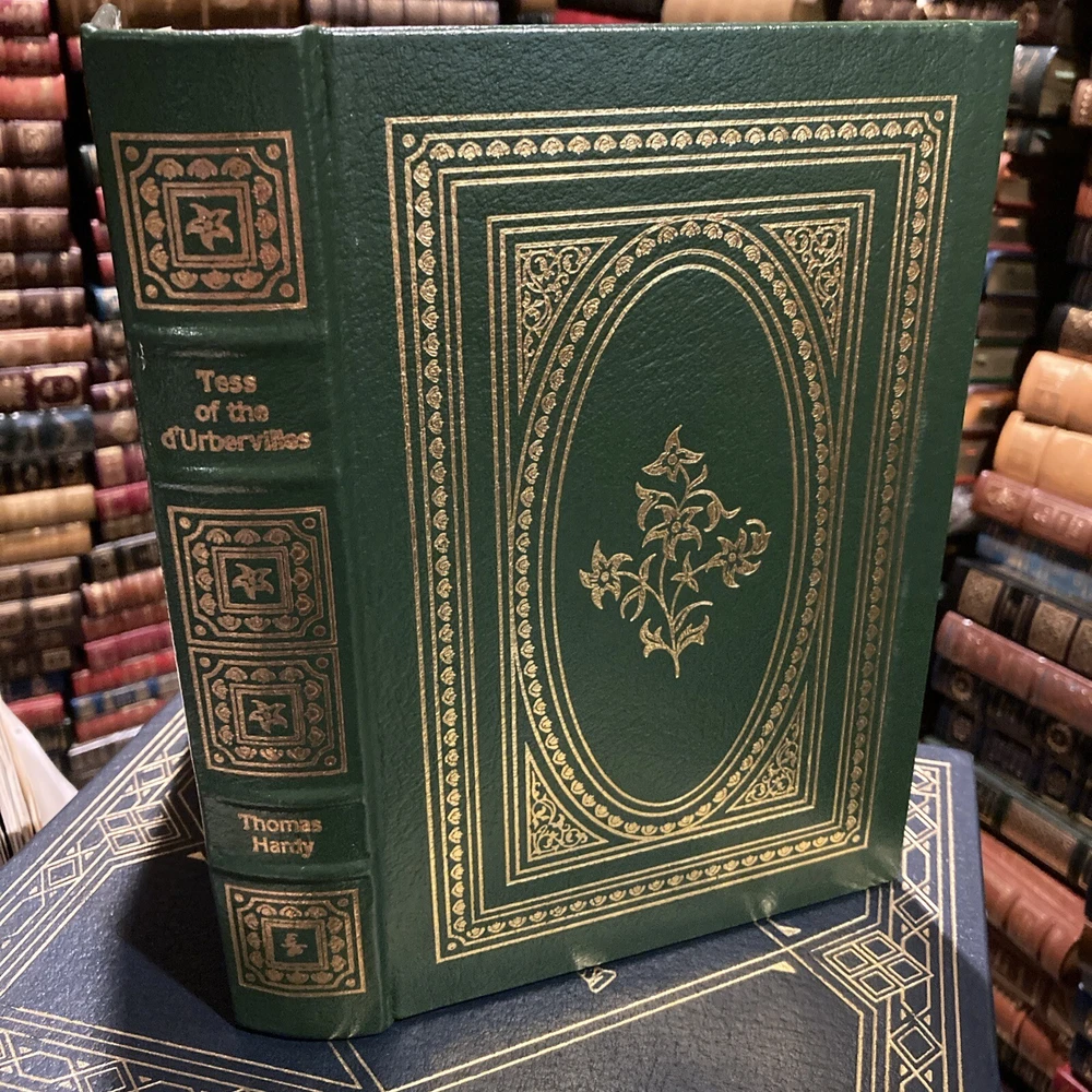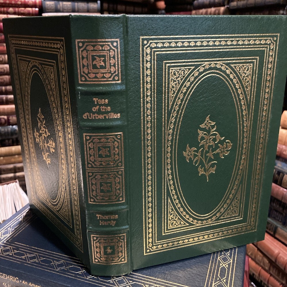 Easton Press leather edition of Thomas Hardy's "Tess of the D' Urb ervilles: A Pure Woman Faithfully Presented," Illustrated by Agnes Miller Parker, Introducation by Robert Cantwell, a COLLECTOR'S edition, one of the 100 GREATEST BOOKS EVER WRITTEN series, published in 2005. Bound in hunter green leather, the book has camel tan moire silk end leaves, acid-free paper, Symth-sewn binding, hubbed spine, satin book marker, gold gilding on three edges---in FINE condition. Thomas Hardy, who lived from 1840-1928, was an English novelist. Hardy--- who always fought hard against pressure to conform to Victorian standards--- was attacked for his sympathetic portrayal of a "fallen" woman. The novel was rejected for serialization because of "improper explicitness," and Hardy was forced to excise certain passages before the novel was published. The young heroine of Hardy's novel of 1891 even resembles her author in coming from an ancient Dorsetshire family, in her charity, and in her feeling for music. Tess is the daughter of a poor, foolish villager of Blackmoor Vale, whose head is turned by learning that he is a descendant of the ancient family of D'Urbervilles. Tess is seduced by ALEC d'Urberville, a young man of means whose parents object to his marrying Tess. Tess gives birth to a child, which dies in infancy. Sometime later, while working as a dairymaid on a large farm, Tess becomes engaged to ANGEL CLARE, a clergyman's son. On their wedding night, Tess confesses to him the affair of Alec and Angel abandons her. Ultimately, Tess is again seduced by Alec, who has become a clergyman, but the second time Tess gets her revenge. . . 448 pages----a RARE title. I offer Combined shipping.