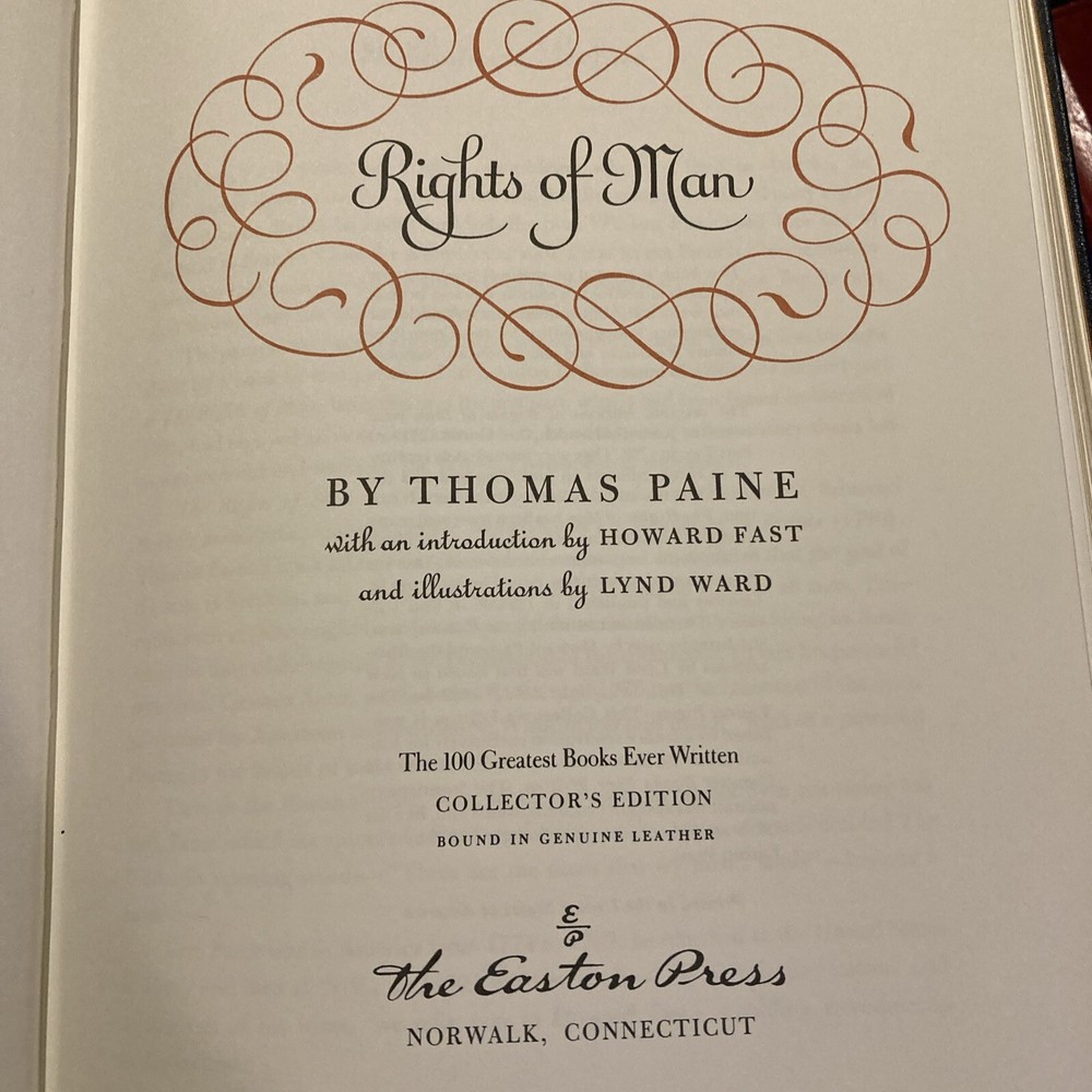 This Easton Press edition of *The Rights of Man* is absolutely stunning—a true collector’s treasure. The rich navy blue leather, gold gilding, and Smyth-sewn binding make it feel luxurious and built to last. Howard Fast’s introduction and Lynd Ward’s illustrations add depth, while the silk end leaves and acid-free paper ensure it stays pristine. Paine’s revolutionary ideas shine even brighter in this beautifully crafted volume, making it a must-have for any serious library. The condition is flawless, and the historical significance elevates it beyond just a book—it’s a piece of art.