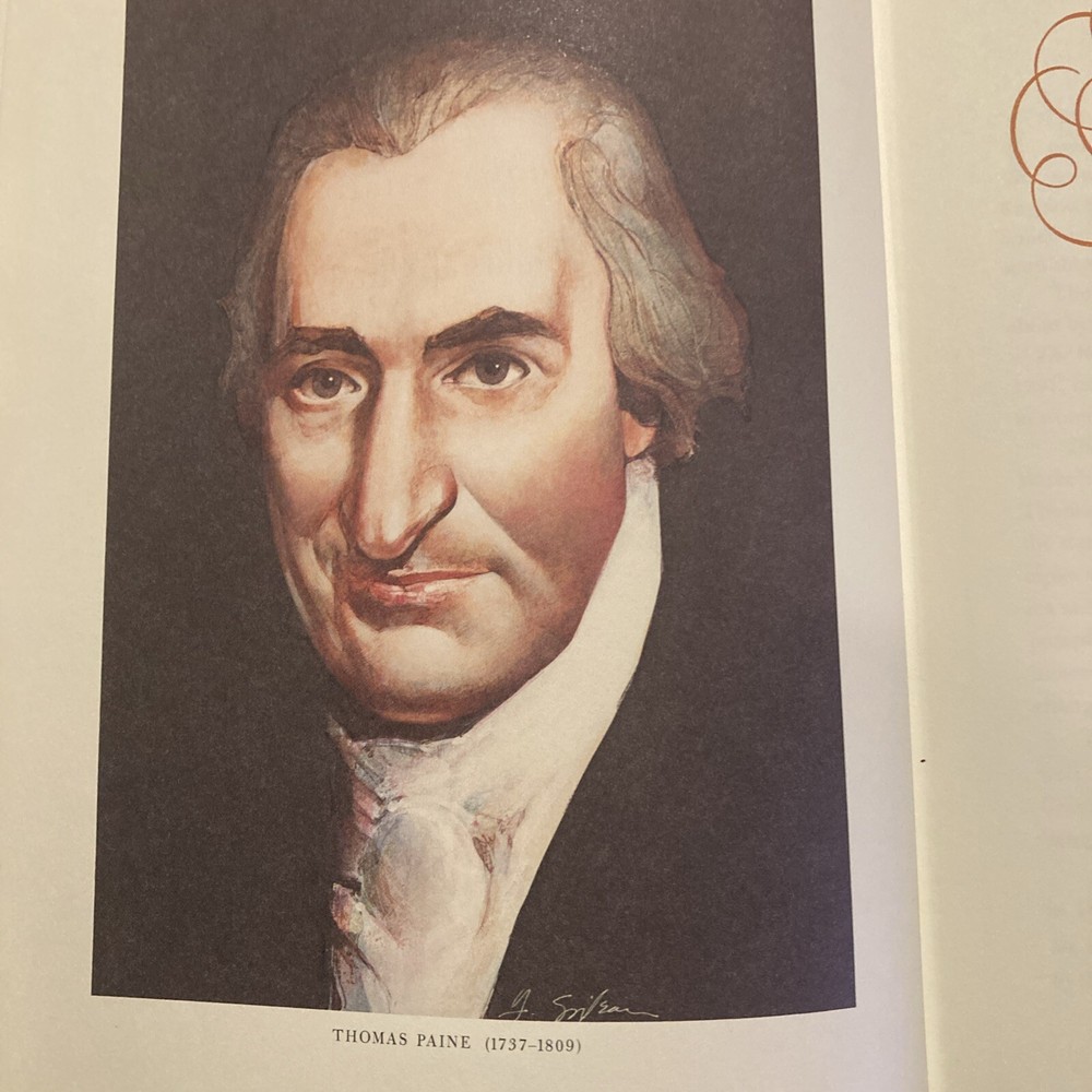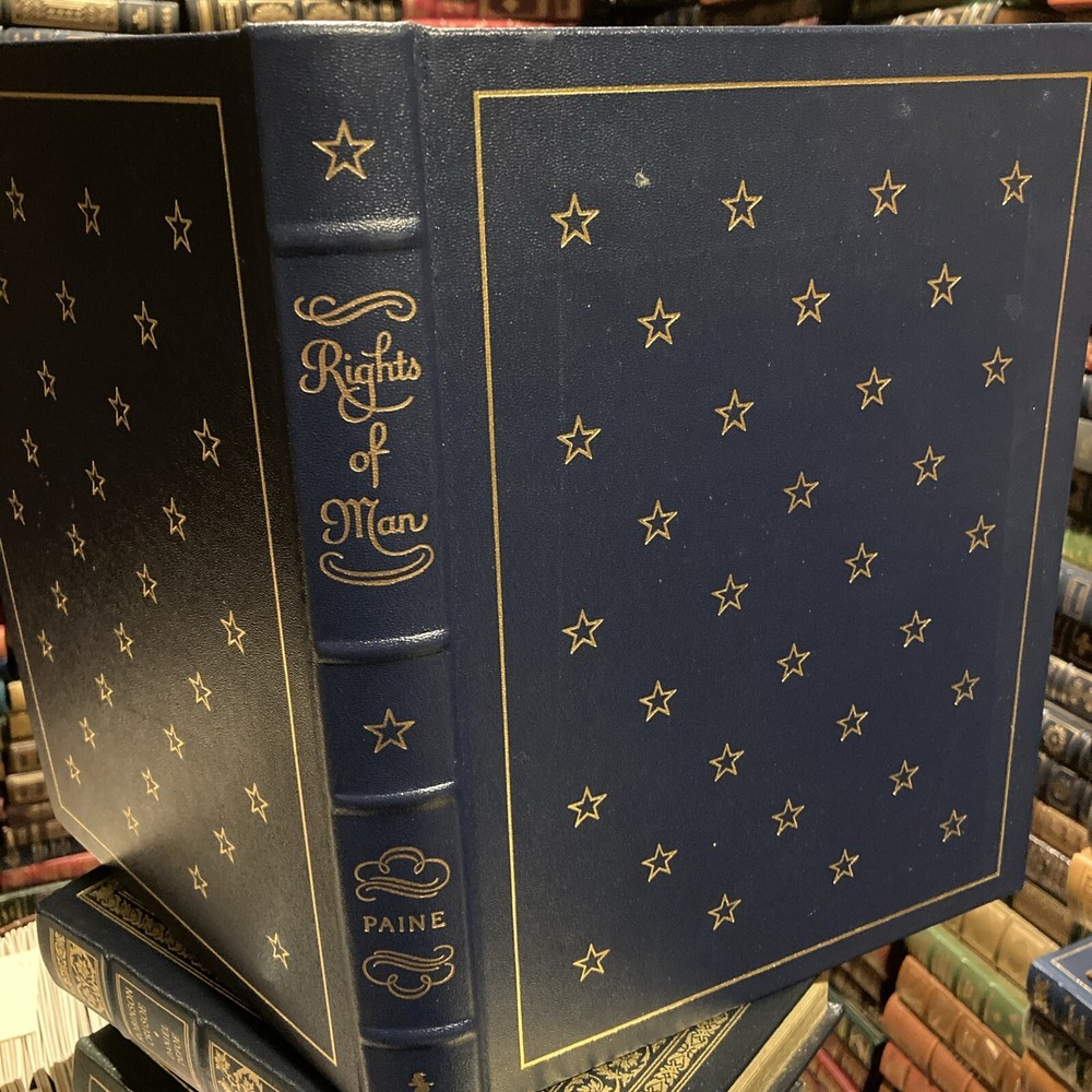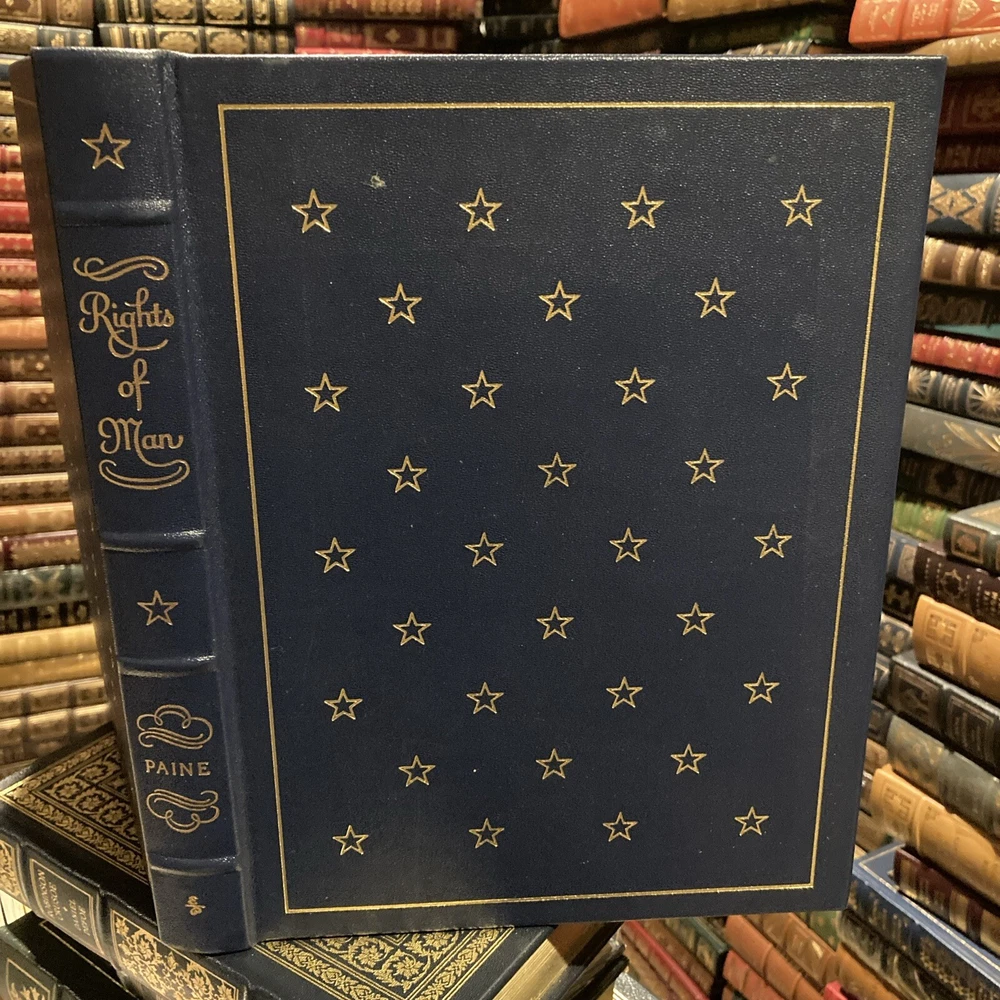 Easton Press leather edition of Thomas Paine's "The Rights of Man," a COLLECTOR'S edition, Introduced by Howard Fast, Illustrated by Lynd Ward, Frontispiece Portrait of Paine by Hodges Soileau, one of the 100 GREATEST BOOKS EVER WRITTEN series, published in 1979. Bound in navy blue leather, the book has camel tan French moire silk end leaves, acid-free paper, Symth-sewn binding, a satin book marker, hubbed spine, gold gilding on three edges---in near FINE condition. Thomas Paine, who lived from 1737-1809, was born in England, the son of a corset maker to whose trade he was apprenticed. His unsettled life to 1774 included residences in various towns, two brief unhappy marriages and such occupations as schoolteacher, tobacconist, grocer, and exciseman. While lobbying for the excisemen, he met BENJAMIN FRANKIN who was impressed by Paine's learning and interests and helped him to start anew in America. Arriving at Philadelphia, Paine contributed to the PENNSYLVANIA MAGAZINE and achieved fame with the publication of "Common Sense" and 16 pamphlets in support of the Revolutionary War. He was rewarded by an appointment as secretary of the congressional committee on foreign affairs. "The Rights of Man" declares that the goal of the state is freedom, and asserts the principles of majority rule, and asserts that happiness is the natural right of all men. Paine's writings shook the world. Paine was largely a self-educated man, driven to inform himself. His hunger for knowledge was never satisfied; he read constantly. Highly conscious of his battle to know, Paine said, "I seldom passed five minutes of my life however circumstanced, in which I did not acquire some knowledge." Paine possessed an enormous knowledge of history, ethics, science, and religion. Though born and raised in England, he spent much of his life in France and America. Paine died in a lodging house in New York City, forgotten by so many he had once inspired. 269 Folio-sized pages, including an Appendix and Notes by the Author. I offer combined shipping.