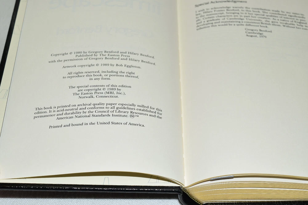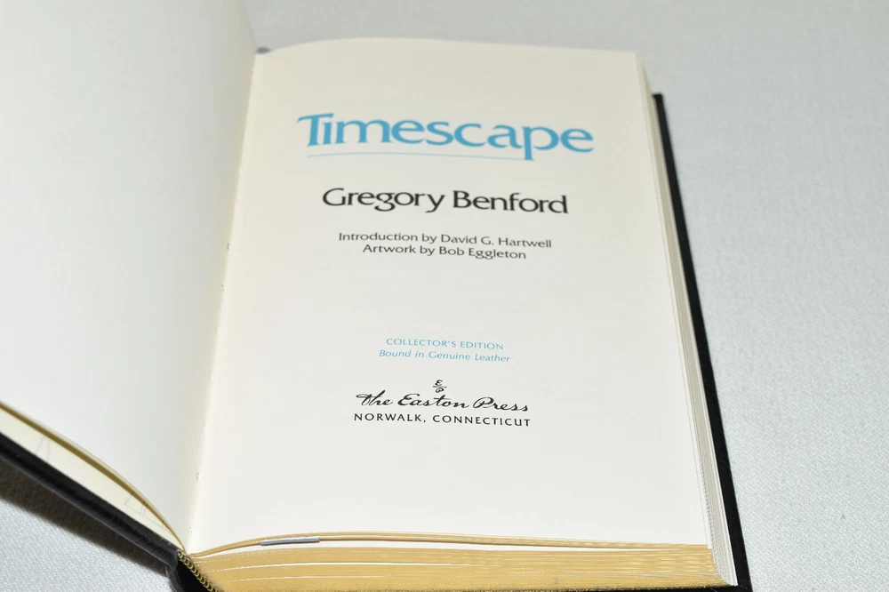 From the Easton Press Masterpieces of Science Fiction Collection... Timescape by Gregory Benford Artwork by Bob Eggleton Copyright 1989 by The Easton Press Bound in Premium Full Leather This volume contains all of the classic Easton Press trimmings: Premium Leather Decorated Endleaves Distinctive Cover Design Hubbed Spine, Accented in Real 22KT Gold Satin Ribbon Page Marker Gilded Page Edges Long-lasting, High Quality Acid-neutral Paper Smyth-sewn Pages for Strength and Durability Beautiful Illustrations A very scarce title in any condition, this volume is in Near Fine condition. The front and back covers are in terrific condition and the gilded page edges show moderate wear (see pictures of all edges). There are no markings, bookplates, or other signs of prior ownership in this book. This book is part of the Masterpieces of Science Fiction Collection published by Easton Press and would be a beautiful addition to your Easton Press collection. Hopefully you can add this book to your collection and enjoy it in the years to come... Please Email Me With Any Questions You Might Have! Shipping Info: Buyer to Pay Shipping and Handling International Bidders Pay Extra Shipping Seller Not Responsible For Uninsured Items Lost or Damaged in Mail Forms of Payment Accepted: Paypal Good luck and happy bidding! Powered by eBay Turbo Lister The free listing tool. List your items fast and easy and manage your active items.