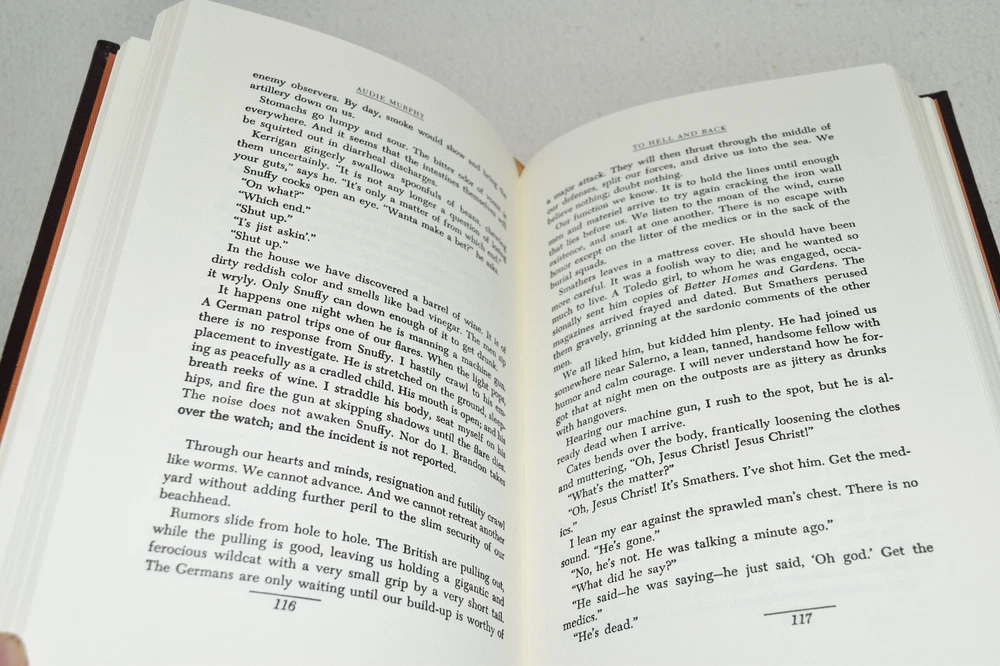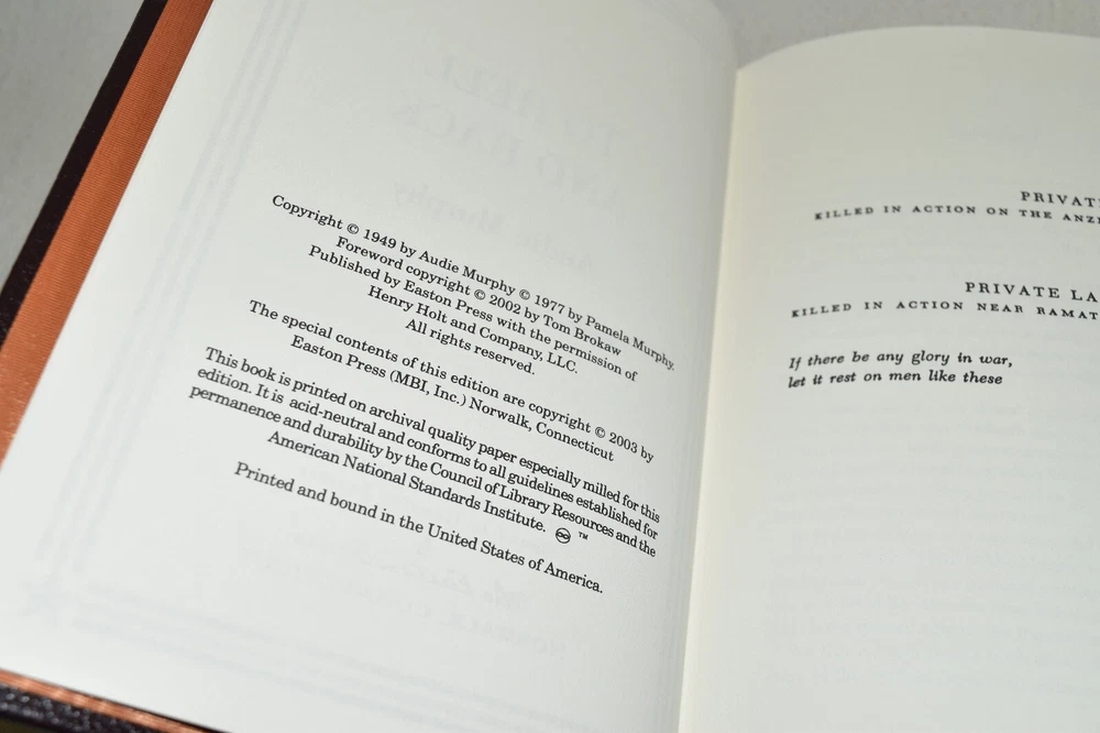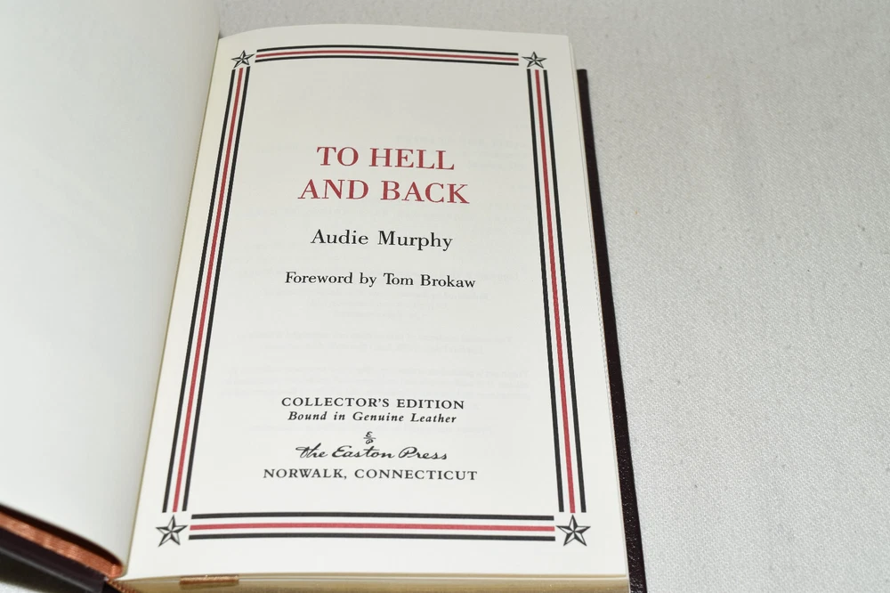 From the Easton Press Collection... To Hell and Back by Audie Murphy Foreword by Tom Brokaw C ollector's Edition Copyright 2003 by The Easton Press Bound in Premium Full Leather This volume contains all of the classic Easton Press trimmings: Premium Leather Silk Moire Endleaves Distinctive Cover Design Hubbed Spine, Accented in Real 22KT Gold Satin Ribbon Page Marker Gilded Page Edges Long-lasting, High Quality Acid-neutral Paper Smyth-sewn Pages for Strength and Durability Beautiful Illustrations A very scarce title in any condition, this Easton Press First Limited Edition is in Fine condition. The front and back covers are both in terrific condition and the gilded page edges show minor wear (see pictures of all gilt sides). There is faint residue on the second page. This book was published by Easton Press and would be a beautiful addition to your Easton Press collection. Hopefully you can add this book to your collection and enjoy it in the years to come... Please Email Me With Any Questions You Might Have! Shipping Info: Buyer to Pay Shipping and Handling International Bidders Pay Extra Shipping Seller Not Responsible For Uninsured Items Lost or Damaged in Mail Forms of Payment Accepted: Paypal Good luck and happy bidding! Powered by eBay Turbo Lister The free listing tool. List your items fast and easy and manage your active items.