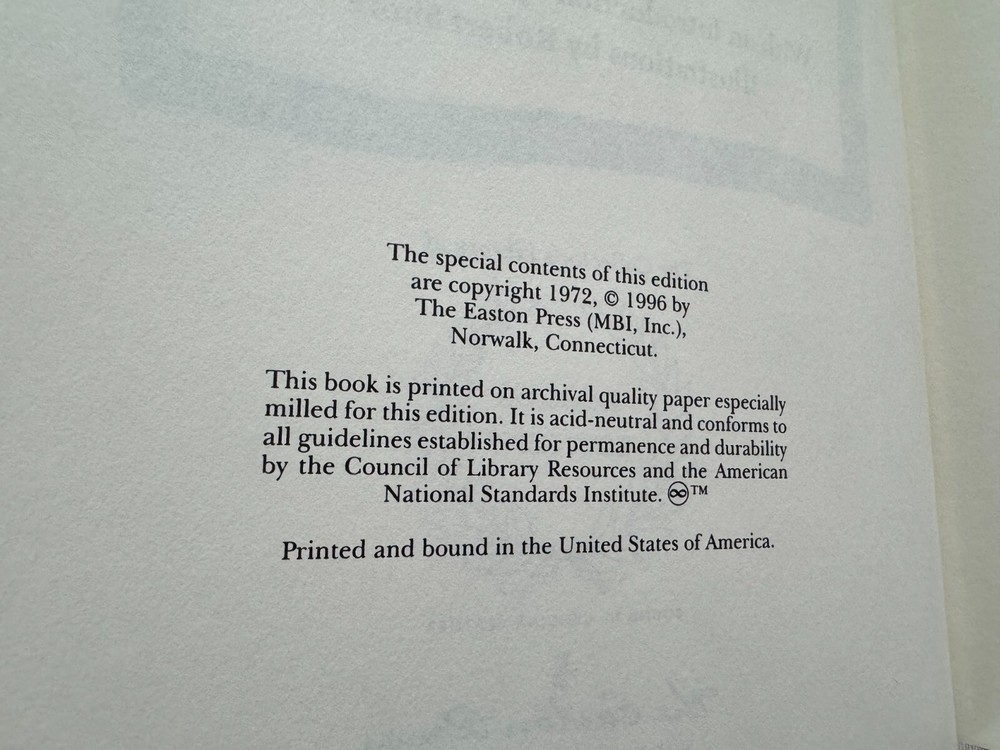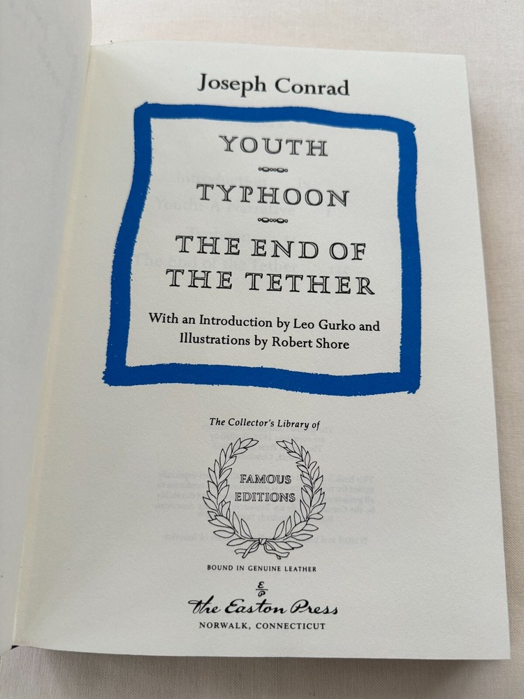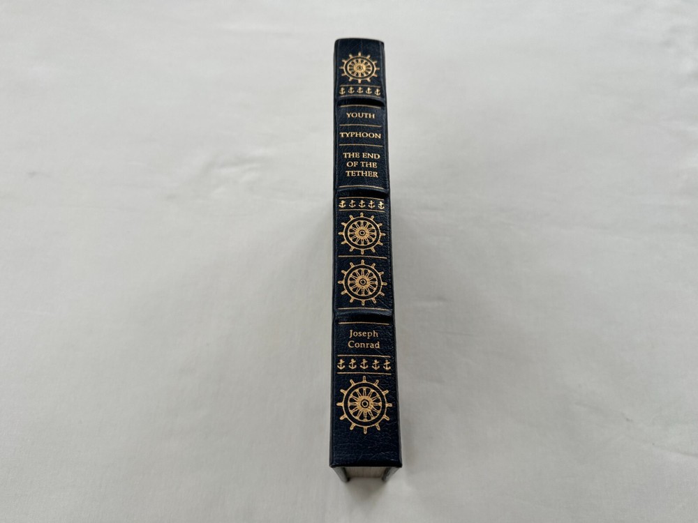From the Easton Press Library of Famous Editions Collection... Youth Typhoon The End of the Tether by Joseph Conrad Illustrations by Robert Shore Copyright 1996 by The Easton Press Bound in Premium Full Leather This volume contains all of the classic Easton Press trimmings: Premium Leather Silk Moire Endleaves Distinctive Cover Design Hubbed Spine, Accented in Real 22KT Gold Satin Ribbon Page Marker Gilded Page Edges Long-lasting, High Quality Acid-neutral Paper Smyth-sewn Pages for Strength and Durability Beautiful Illustrations A very scarce title in any condition, this copy is in near Mint and Unread condition. The front and back covers are both in near Perfect condition with very faint etching and the gilded page edges show hardly any wear at all! There is no attached bookplate nor any other signs of previous ownership . This book is part of the Library of Famous Editions Collection published by Easton Press. It would be a beautiful addition to your Easton Press collection. Overall, this copy is a grade collector's book. This book is very elusive in this superior condition, as only a limited number of them were ever published, so now is the time to act. Hopefully you can add this book to your collection and enjoy it in the years to come... Please Email Me With Any Questions You Might Have! Shipping Info: Buyer to Pay Shipping and Handling International Bidders Pay Extra Shipping Good luck and happy bidding!