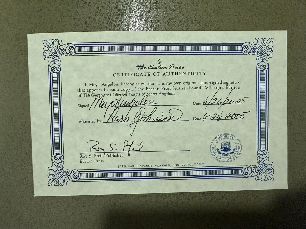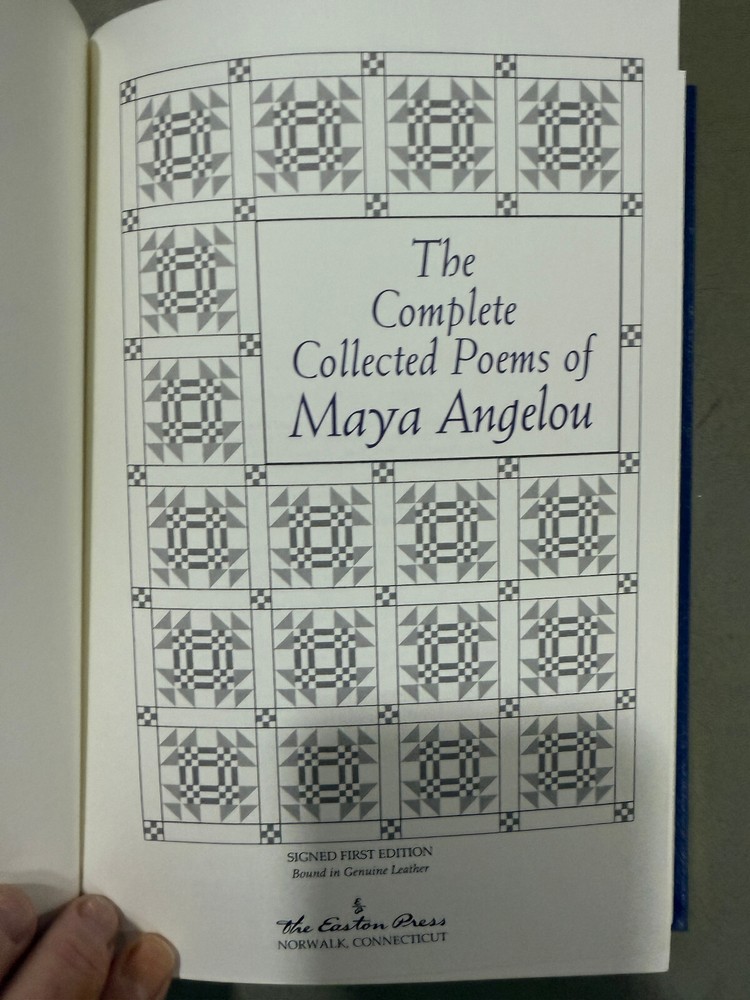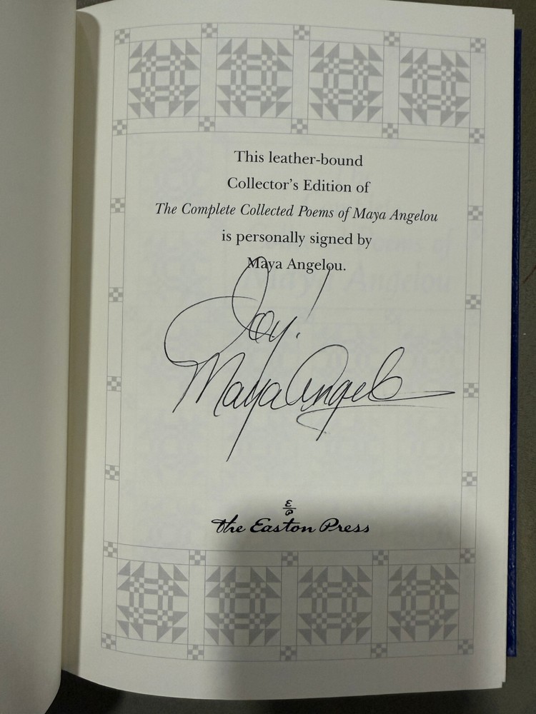 The Complete Collected Poems of Maya Angelou SIGNED Easton Press Fantasy Series Like NEW Condition with Certificate of Authenticity! New Books get listed daily !!! 100s of Easton Press and Franklin Library books available!! All books get cleaned with a leather cleaner to remove any dust, odor and restore the beauty of leather!! Combined Shipping Discount: USA buyers - every book $1 off International combined shipping: 1 or 2 books - $45 3 or 4 books - $75 5 + books $17 per book 10+ books $13 per book WE SHIP DAILY!! RETURNS: Hassle-Free 30-days return policy and we pay for a return !! Check our Inventory (Link to eBay Store): http://stores.ebay.com/EastonFranklinBooks