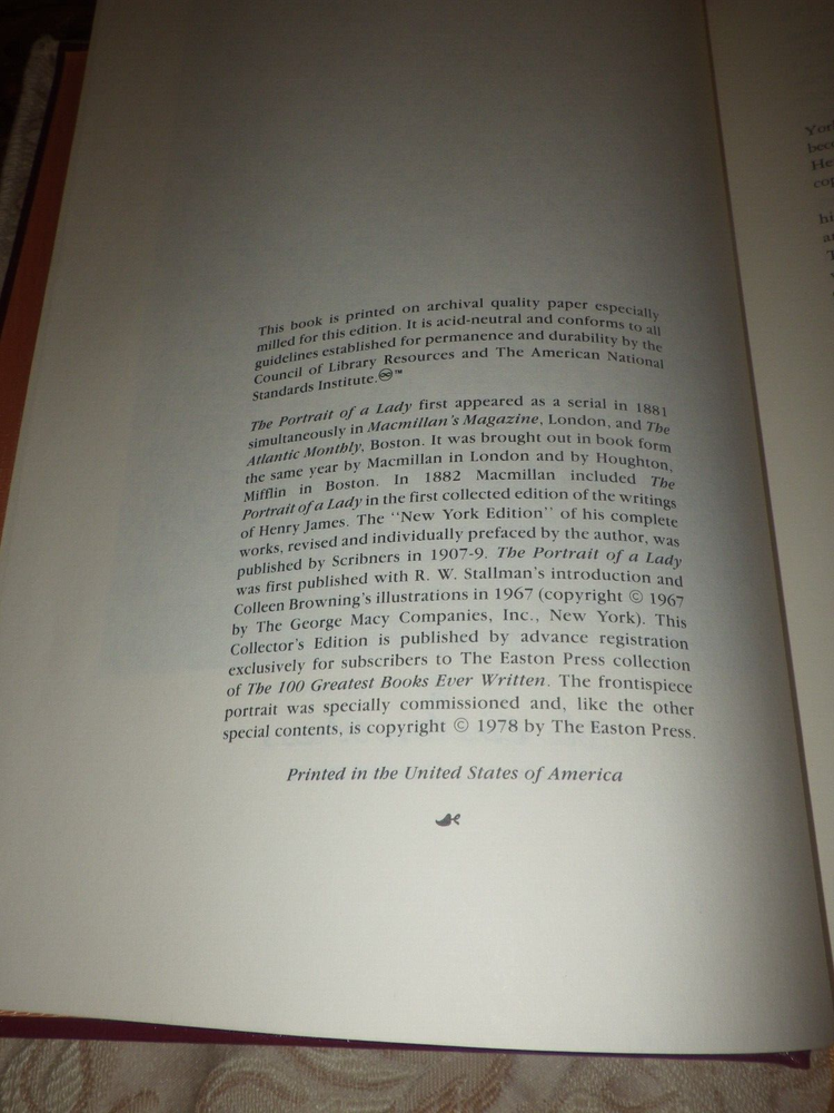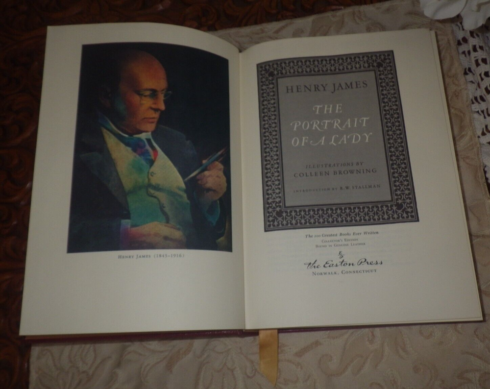 EASTON PRESS THE PORTRAIT OF A LADY THE PORTRAIT OF A LADY HENRY JAMES ILLUSTRATIONS BY COLLEEN BROWNING 100 GREATEST BOOKS EVER WRITTEN COLLECTOR EDITION A REAL BEAUTY! Easton Press leather edition of Henry James's "The Portrait of a Lady" a COLLECTOR'S edition, Illustrated by Colleen Browning, Introduction by R.W. Stallman , one of the 100 GREATEST BOOKS EVER WRITTEN series, published in 1978. Bound in burgundy leather, the book has camel tan French moire silk end leaves, acid-free paper, Symth-sewn binding, a satin book marker, hubbed spine, gold gilding on three edges---in FINE condition—-Shrink wrapped. [Photos from personal copy.] Henry James, who lived from 1843-1916, was born in New York City, but grew up in Europe and the U.S. He graduated from HARVARD and entered Law School in 1862 but was bored after a year and returned to Europe where he lived for most of his life. "The Portrait of a Lady" opens at the Touchett manor-house in England. ISABEL ARCHER is a young lady confronting her unknown destiny. Isabel meets on the great lawn with Ralph Touchett and his father and Lord Warburton. Miss Isabel has just arrived from America with Mrs. Touchett. Whom will she marry? Why does she reject Caspar Goodwood and even Lord Warburton? Ultimately, Isabel marries Gilbert Osmond who has a villa in Florence. . .however, it is not a happy union. 516 pages. Stunningly Beautiful! BEST OF THE BEST MINT NEW!