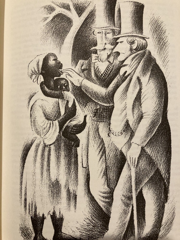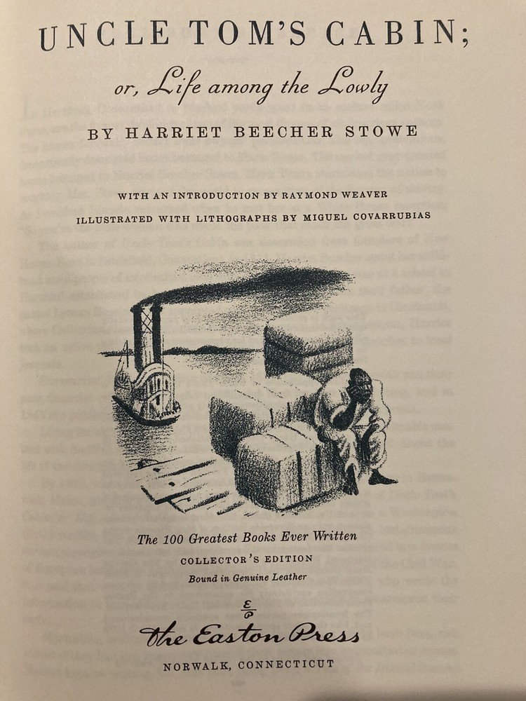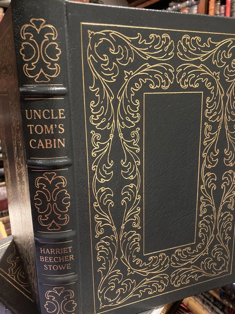 Easton Press leather edition of Harriet Beecher Stowe's "Uncle Tom's Cabin; or, Life Among the Lowly," a COLLECTOR'S edition, Introduced by Raymond Weaver, Illustrated by Miguel Covarrubias, one of the 100 GREATEST BOOKS EVER WRITTEN series, published in 1979. Bound in pea green leather, the book has camel moire silk end leaves, acid-free paper, Symth-sewn binding, a satin book marker, hubbed spine, gold gilding on three edges----in near FINE condition. Harriet Beecher Stowe, who lived from 1811-1986, was the daughter of Lyman Beecher, a New England clergyman, and passionate abolitionist and the wife of a passionate minister, Professor Calvin Stowe. As President Lincoln remarked when he met her at a White House reception: "so you're the little woman who wrote the book that made the great war!" 'Uncle Tom's Cabin" sold millions of copies and the Stowes would have been rich if they had not generously poured their money into humanitarian causes. The book opens with a KENTUCKY farmer named Arthur Shelby facing the loss of his farm because of debts. Even though he and his wife Emily Shelby believe that they have a benevolent relationship with their slaves, Shelby decides to raise the needed funds by selling two of them—Uncle Tom, a middle-aged man with a wife and children, and Harry, the son of Emily Shelby's maid Eliza—to a slave trader. Emily Shelby is averse to this idea because she had promised her maid that her child would never be sold; Emily's son, George Shelby, hates to see Tom go because he sees the man as his friend and mentor. When Eliza overhears Mr. and Mrs. Shelby discussing plans to sell Tom and Harry, Eliza determines to run away with her son. Eliza departs that night, leaving a note of apology to her mistress. Tom is sold and placed on a riverboat which sets sail down the MISSISSIPPI River. While on board, Tom meets and befriends a young white girl named Eva. Eva's father Augustine St. Clare buys Tom from the slave trader and takes him with the family to their home in New Orleans. Tom and Eva begin to relate to one another because of the deep Christian faith they both share. However, Tom is eventually sold to SIMON LEGREE, a brutal slave breaker. 295 pages. I offer Combined shipping.