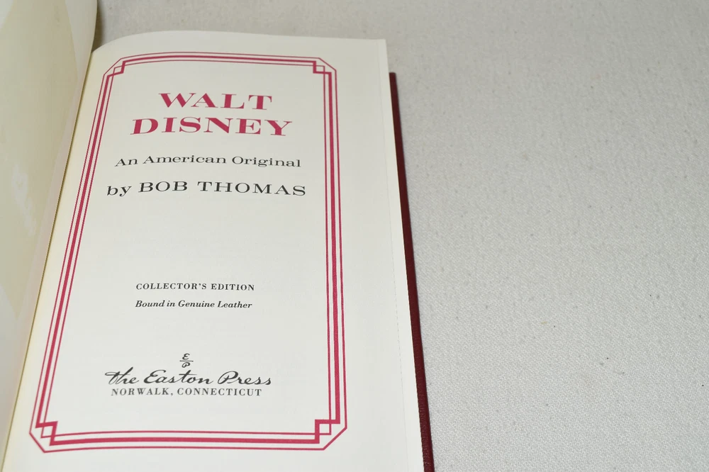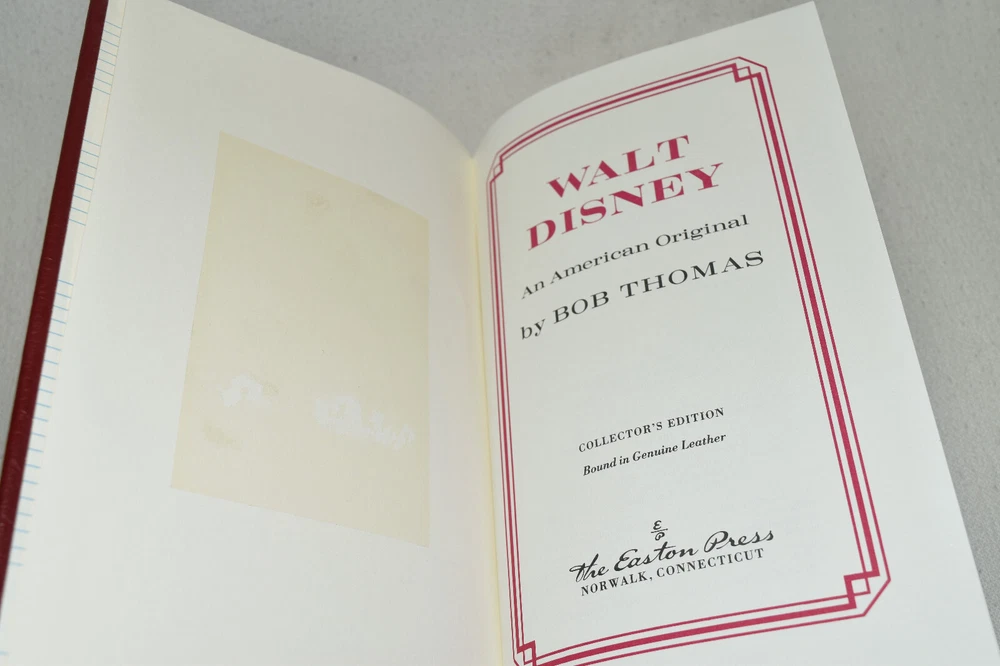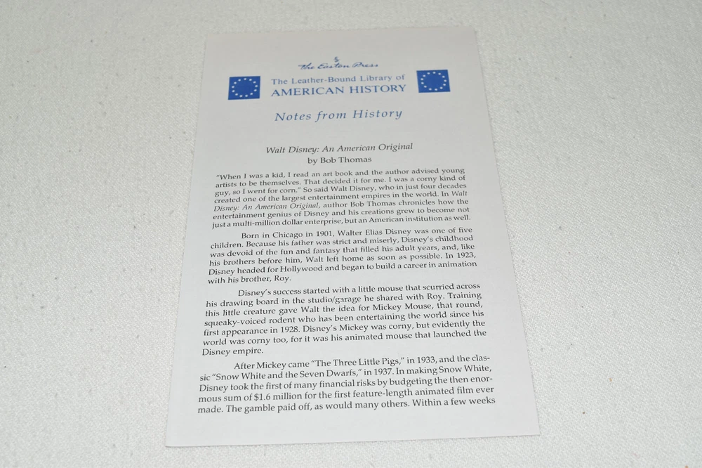 From the Easton Press Library of American History... Walt Disney An American Original by Bob Thomas Collector's Edition Copyright 1997 by The Easton Press Bound in Premium Full Leather This volume contains all of the classic Easton Press trimmings: Premium Leather Decorated Endleaves Distinctive Cover Design Hubbed Spine, Accented in Real 22KT Gold Satin Ribbon Page Marker Gilded Page Edges Long-lasting, High Quality Acid-neutral Paper Smyth-sewn Pages for Strength and Durability Beautiful Illustrations A very scarce title in any condition, this Easton Press Edition is in Fine condition. The front and back covers are both in terrific condition and the gilded page edges show only very minor wear (see pictures of all sides of gilt). There is faint residue on the second page. This book is part of the Library of American History Collection published by Easton Press. It comes complete with Collector's Notes and would be a beautiful addition to your Easton Press collection. Please Email Me With Any Questions You Might Have! Shipping Info: Buyer to Pay Shipping and Handling International Bidders Pay Extra Shipping Seller Not Responsible For Uninsured Items Lost or Damaged in Mail Forms of Payment Accepted: Paypal Good luck and happy bidding! Powered by eBay Turbo Lister The free listing tool. List your items fast and easy and manage your active items.