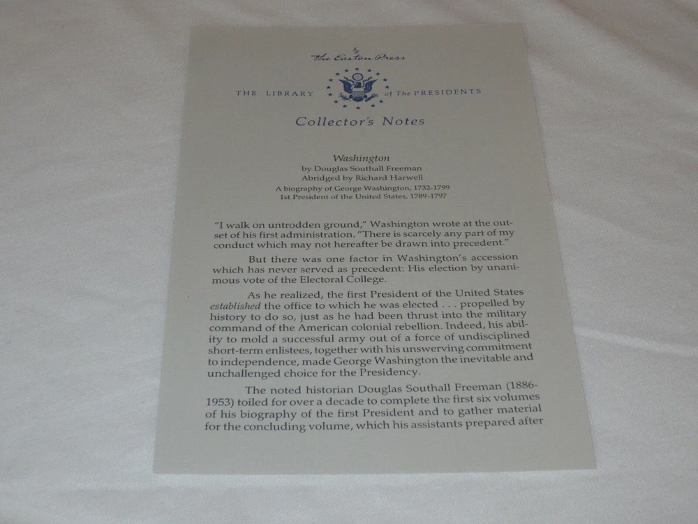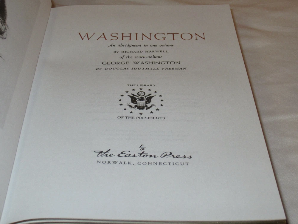 From the Easton Press Library of the Presidents Collector's Edition Series... Washington by Douglas Freeman Copyright 1985 by The Easton Press Bound in Premium Full Leather! This volume contains all of the classic Easton Press trimmings: Premium Leather Decorated Endleaves Distinctive Cover Design Hubbed Spine, Accented in Real 22KT Gold Satin Ribbon Page Marker Gilded Page Edges Long-lasting, High Quality Acid-neutral Paper Smyth-sewn Pages for Strength and Durability A very scarce title in any condition, this copy is in Fine and Unread condition. The front and back covers are both in near perfect condition and the gilded page edges hardly any wear! There are no marking, bookplates, or other signs or prior ownership. This book is part of the Library of Presidents published by Easton Press and comes complete with a Collector's Notes. It would be a beautiful addition to your Easton Press collection. Overall, this copy is a grade collector's book. This book is very elusive in this superior condition, as only a limited number of them were ever published, so now is the time to act. Hopefully you can add this book to your collection and enjoy it in the years to come... Please Email Me With Any Questions You Might Have! Shipping Info: Buyer to Pay Shipping and Handling International Bidders Pay Extra Shipping Forms of Payment Accepted: Paypal Good luck and happy bidding! Powered by eBay Turbo Lister The free listing tool. List your items fast and easy and manage your active items.