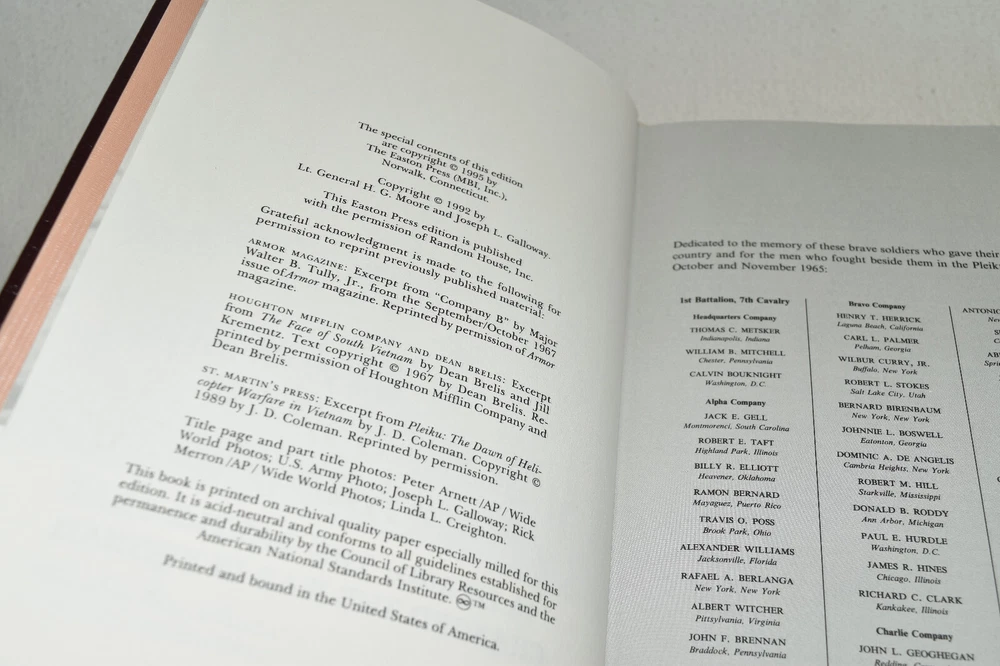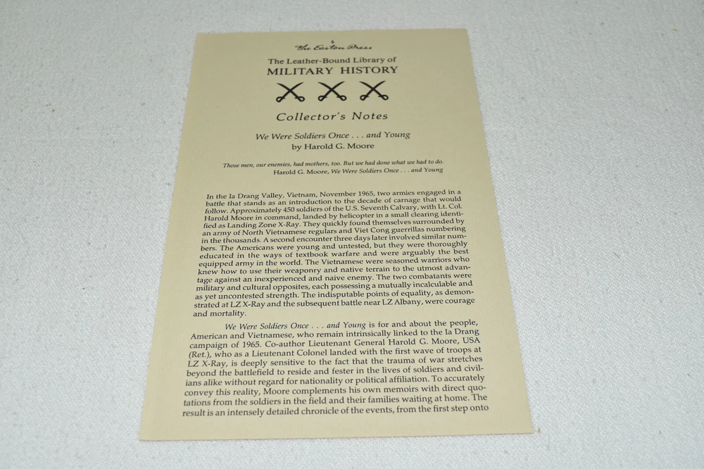 From the Easton Press Library of Military History Collection... We Were Soldiers Once... and Young Ia Drang: The Battle that Changed the War in Vietnam by Lt. General Harold Moore and Joseph Galloway Illustrated with Maps and Photos! Copyright 1995 by The Easton Press Bound in Premium Full Leather This volume contains all of the classic Easton Press trimmings: Premium Leather Silk Moire Endleaves Distinctive Cover Design Hubbed Spine, Accented in Real 22KT Gold Satin Ribbon Page Marker Gilded Page Edges Long-lasting, High Quality Acid-neutral Paper Smyth-sewn Pages for Strength and Durability Beautiful Illustrations A very scarce title in any condition, this volume is in Fine condition. The front and back covers are both in near perfect condition and the gilded page edges show hardly any wear (see pictures of all edges). There is light residue on the second page. This book is part of the Library of Military History Collection published by Easton Press. It comes complete with Collector's Notes and would be a beautiful addition to your Easton Press collection. Overall, this copy is a grade collector's book. This book is very elusive in this superior condition, as only a limited number of them were ever published, so now is the time to act. Hopefully you can add this book to your collection and enjoy it in the years to come... Please Email Me With Any Questions You Might Have! Shipping Info: Buyer to Pay Shipping and Handling International Bidders Pay Extra Shipping Seller Not Responsible For Uninsured Items Lost or Damaged in Mail Forms of Payment Accepted: Paypal Good luck and happy bidding! Powered by eBay Turbo Lister The free listing tool. List your items fast and easy and manage your active items.