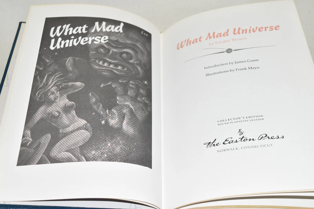 From the Easton Press Masterpieces of Science Fiction Collection... What Mad Universe by Fredric Brown Introduction by James Gunn Artwork by Frank Mayo Copyright 1986 by The Easton Press Bound in Premium Full Leather This volume contains all of the classic Easton Press trimmings: Premium Leather Decorated Endleaves Distinctive Cover Design Hubbed Spine, Accented in Real 22KT Gold Satin Ribbon Page Marker Gilded Page Edges Long-lasting, High Quality Acid-neutral Paper Smyth-sewn Pages for Strength and Durability Beautiful Illustrations A very scarce title in any condition, this volume is in Near Fine condition. The front and back covers are both in terrific condition showing light fading to the gilt and the gilded page edges only light wear (see pictures of all edges). There are no markings, bookplates, or other signs of prior ownership in this book. This book is part of the Masterpieces of Science Fiction Collection published by Easton Press and would be a beautiful addition to your Easton Press collection. Overall, this copy is a grade collector's book. This book is very elusive in this superior condition, as only a limited number of them were ever published, so now is the time to act. Hopefully you can add this book to your collection and enjoy it in the years to come... Please Email Me With Any Questions You Might Have! Shipping Info: Buyer to Pay Shipping and Handling International Bidders Pay Extra Shipping Seller Not Responsible For Uninsured Items Lost or Damaged in Mail Forms of Payment Accepted: Paypal Good luck and happy bidding! Powered by eBay Turbo Lister The free listing tool. List your items fast and easy and manage your active items.
