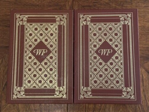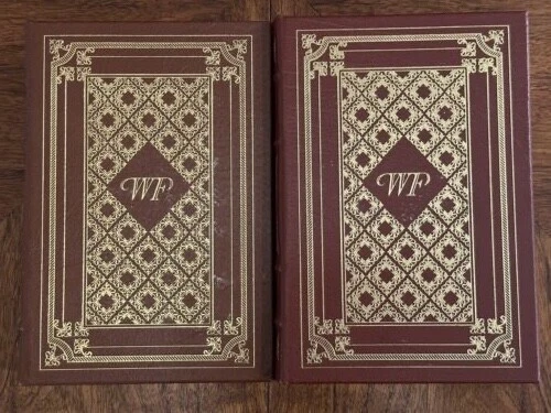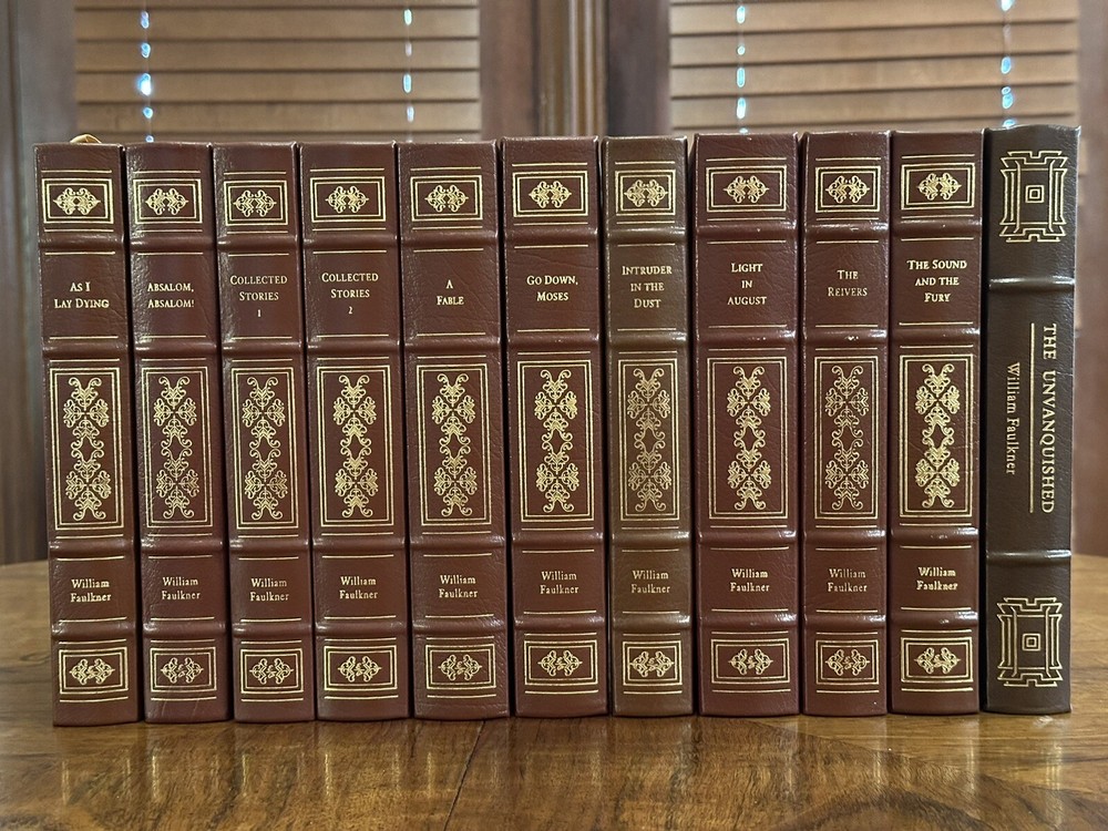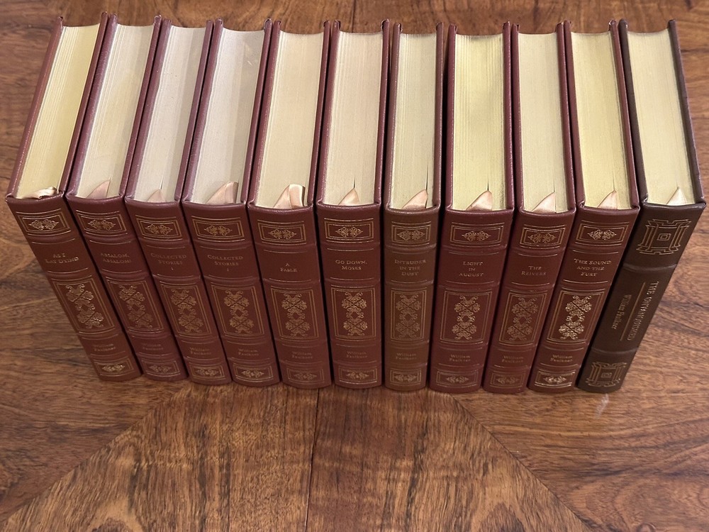 This 11 volume collection of Faulkner's works from 1998 by Easton Press is long out of print and hard to find. All 11 titles are here, but as you can see, THE UNVANQUISHED is from a previous Easton Press set in 1992. The dimensions of the book are identical to the others but the design is different. Most of the books are in Very Fine condition. The front covers of AS I LAY DYING, GO DOWN MOSES, and INTRUDER IN THE DUST, have minor imperfections (see photos). I believe this is some errant gold foil from the manufacturing process. Overall a beautiful and rare collection that I hate to part with. Check out my other listing for more RARE and/or SIGNED Easton Press, Franklin Library, and Folio Society books.