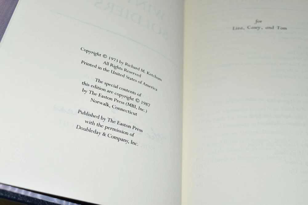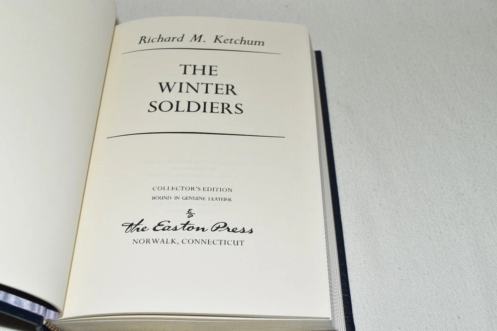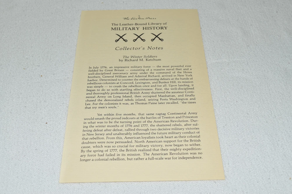 From the Easton Press Library of Military History Collection... The Winter Soldiers by Richard Ketchum Illustrated with Maps and Photos! Copyright 1987 by The Easton Press Bound in Premium Full Leather This volume contains all of the classic Easton Press trimmings: Premium Leather Silk Moire Endleaves Distinctive Cover Design Hubbed Spine, Accented in Real 22KT Gold Satin Ribbon Page Marker Gilded Page Edges Long-lasting, High Quality Acid-neutral Paper Smyth-sewn Pages for Strength and Durability Beautiful Illustrations A very scarce title in any condition, this volume is in Fine condition. The front and back covers are both in near perfect condition and the gilded page edges show hardly any wear (see pictures of all edges). There is light residue on the second page. This book is part of the Library of Military History Collection published by Easton Press. It comes complete with Collector's Notes and would be a beautiful addition to your Easton Press collection. Overall, this copy is a grade collector's book. This book is very elusive in this superior condition, as only a limited number of them were ever published, so now is the time to act. Hopefully you can add this book to your collection and enjoy it in the years to come... Please Email Me With Any Questions You Might Have! Shipping Info: Buyer to Pay Shipping and Handling International Bidders Pay Extra Shipping Seller Not Responsible For Uninsured Items Lost or Damaged in Mail Forms of Payment Accepted: Paypal Good luck and happy bidding! Powered by eBay Turbo Lister The free listing tool. List your items fast and easy and manage your active items.